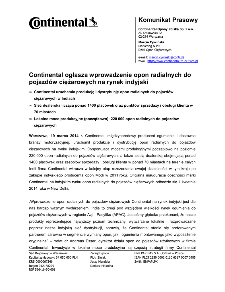 Komunikat Prasowy Continental Opony Polska Sp. z o.o. Al. Krakowska 2A 02-284 Warszawa Marcin Cywiński Marketing & PR Dział Opon Ciężarowych e-mail: [email protected] www: http://www.continental-truck-tires.pl Continental ogłasza wprowadzenie opon radialnych do pojazdów ciężarowych na rynek indyjski • Continental uruchamia produkcję i dystrybucję opon radialnych do pojazdów ciężarowych w Indiach • Sieć dealerska licząca ponad 1400 placówek oraz punktów sprzedaży i obsługi klienta w 70 miastach • Lokalne moce produkcyjne (początkowo): 220 000 opon radialnych do pojazdów ciężarowych Warszawa, 19 marca 2014 r. Continental, międzynarodowy producent ogumienia i dostawca branży motoryzacyjnej, uruchomił produkcję i dystrybucję opon radialnych do pojazdów ciężarowych na rynku indyjskim. Dysponująca mocami produkcyjnymi początkowo na poziomie 220 000 opon radialnych do pojazdów ciężarowych, a także siecią dealerską obejmującą ponad 1400 placówek oraz zespołów sprzedaży i obsługi klienta w ponad 70 miastach na terenie całych Indii firma Continental wkracza w kolejny etap rozszerzania swojej działalności w tym kraju po zakupie indyjskiego producenta opon Modi w 2011 roku. Oficjalna inauguracja obecności marki Continental na indyjskim rynku opon radialnych do pojazdów ciężarowych odbędzie się 1 kwietnia 2014 roku w New Delhi. „Wprowadzenie opon radialnych do pojazdów ciężarowych Continental na rynek indyjski jest dla nas bardzo ważnym wydarzeniem. Indie to drugi pod względem wielkości rynek ogumienia do pojazdów ciężarowych w regionie Azji i Pacyfiku (APAC). Jesteśmy głęboko przekonani, że nasze produkty reprezentujące najwyższy poziom techniczny, wytwarzane lokalnie i rozprowadzane poprzez naszą indyjską sieć dystrybucji, sprawią, że Continental stanie się preferowanym partnerem zarówno w segmencie wymiany opon, jak i ogumienia montowanego jako wyposażenie oryginalne” – mówi dr Andreas Esser, dyrektor działu opon do pojazdów użytkowych w firmie Continental. Inwestycje w lokalne moce produkcyjne są częścią strategii firmy Continental Sąd Rejonowy w Warszawie Kapitał zakładowy: 34 050 000 PLN KRS 0000067346 Regon 012168279 NIP 526-16-50-001 Zarząd Spółki Piotr Zielak Jerzy Mendala Dariusz Małocha BNP PARIBAS S.A. Oddział w Polsce IBAN PL05 2350 0002 0110 6387 0007 0985 Swift: BNPAPLPX Komunikat Prasowy Continental Opony Polska Sp. z o.o. Al. Krakowska 2A 02-284 Warszawa Marcin Cywiński Marketing & PR Dział Opon Ciężarowych e-mail: [email protected] www: http://www.continental-truck-tires.pl zakładającej globalną dywersyfikację lokalizacji produkcji oraz rozwijanie działalności na rynkach o dużym potencjale wzrostu, takich jak Indie. Continental inwestuje znaczne środki zarówno w nowe budynki, jak i w maszyny do produkcji opon radialnych. Ponadto firma sprowadziła do Indii doświadczone kadry z zakładów w innych krajach. Zadaniem tych osób będzie przeszkolenie miejscowych pracowników w zakresie obsługi nowych maszyn i technologii produkcji. Ponad 100 miejscowych pracowników wysłano za granicę, do zakładów produkcyjnych w Niemczech, Rumunii, Chinach i Malezji, gdzie przejdą oni kompleksowe szkolenie w zakresie produkcji opon radialnych i zagadnień technicznych. „Stanowczo uważamy, że szkolenia lokalnych pracowników przez doświadczonych ekspertów z innych fabryk mają decydujące znaczenie dla pomyślnego rozwoju nowej fabryki ogumienia. Solidna sieć zakładów produkcyjnych jest podstawą sprawności i efektywności operacyjnej, zwłaszcza w przypadku przestawiania się z produkcji opon diagonalnych na produkcję opon radialnych, wymagającą stosowania bardziej skomplikowanych technologii i większej wiedzy” – podkreśla Thierry Wipff, dyrektor ds. produkcji opon do pojazdów użytkowych w firmie Continental. Początkowo portfolio opon radialnych Continental będzie obejmowało ogumienie do pojazdów służących do przewozu towarów, osób oraz eksploatowanych na placach budowy. W segmencie transportu towarów dużą niezawodność i wysokie przebiegi gwarantują opony HSR2 na oś kierowaną i HDR2 na oś napędzaną. W segmencie transportu osób Continental wprowadza specjalne ogumienie do autokarów, zapewniające wysoki komfort jazdy, duże przebiegi i stabilność kierunkową. Ofertę uzupełniają zaawansowane technicznie opony do pojazdów eksploatowanych na placach budowy. Ogumienie HSX2 i HDX2 charakteryzuje się doskonałą wytrzymałością i znakomitymi właściwościami poza drogami utwardzonymi. Indyjski rynek wymiany ogumienia w pojazdach ciężarowych to około 14 milionów sztuk opon rocznie, z czego prawie 4 miliony stanowią opony radialne, a reszta, czyli 10 milionów, to opony Sąd Rejonowy w Warszawie Kapitał zakładowy: 34 050 000 PLN KRS 0000067346 Regon 012168279 NIP 526-16-50-001 Zarząd Spółki Piotr Zielak Jerzy Mendala Dariusz Małocha BNP PARIBAS S.A. Oddział w Polsce IBAN PL05 2350 0002 0110 6387 0007 0985 Swift: BNPAPLPX Komunikat Prasowy Continental Opony Polska Sp. z o.o. Al. Krakowska 2A 02-284 Warszawa Marcin Cywiński Marketing & PR Dział Opon Ciężarowych e-mail: [email protected] www: http://www.continental-truck-tires.pl diagonalne. W ciągu ostatnich pięciu lat odnotowano nie tylko wzrost rynku o około 24%, ale także silną tendencję przechodzenia na opony radialne. Oczekuje się, że w najbliższych latach tendencja ta będzie nabierała coraz większego tempa. *** Continental AG Z osiągniętymi w 2013 roku obrotami w wysokości 33,3 miliardów € Continental jest jednym z wiodących dostawców motoryzacyjnych na świecie. Oferując układy hamulcowe, urządzenia i komponenty zespołów napędowych i podwozi, zestawy wskaźników, systemy informatyczne i rozrywkowe, podzespoły elektroniczne, opony oraz elastomery techniczne, firma Continental znacząco przyczynia się do poprawy bezpieczeństwa na drogach