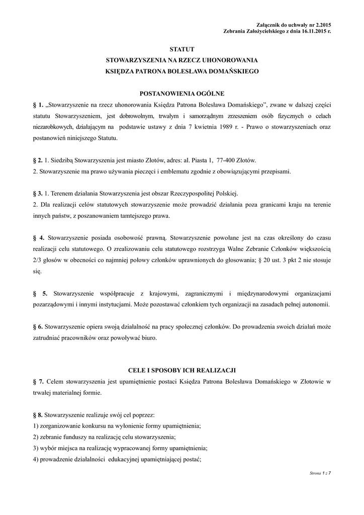 Załącznik do uchwały nr 2.2015 Zebrania Założycielskiego z dnia 16.11.2015 r. STATUT STOWARZYSZENIA NA RZECZ UHONOROWANIA KSIĘDZA PATRONA BOLESŁAWA DOMAŃSKIEGO POSTANOWIENIA OGÓLNE § 1. „Stowarzyszenie na rzecz uhonorowania Księdza Patrona Bolesława Domańskiego”, zwane w dalszej części statutu Stowarzyszeniem, jest dobrowolnym, trwałym i samorządnym zrzeszeniem osób fizycznych o celach niezarobkowych, działającym na podstawie ustawy z dnia 7 kwietnia 1989 r. - Prawo o stowarzyszeniach oraz postanowień niniejszego Statutu. § 2. 1. Siedzibą Stowarzyszenia jest miasto Złotów, adres: al. Piasta 1, 77-400 Złotów. 2. Stowarzyszenie ma prawo używania pieczęci i emblematu zgodnie z obowiązującymi przepisami. § 3. 1. Terenem działania Stowarzyszenia jest obszar Rzeczypospolitej Polskiej. 2. Dla realizacji celów statutowych stowarzyszenie może prowadzić działania poza granicami kraju na terenie innych państw, z poszanowaniem tamtejszego prawa. § 4. Stowarzyszenie posiada osobowość prawną. Stowarzyszenie powołane jest na czas określony do czasu realizacji celu statutowego. O zrealizowaniu celu statutowego rozstrzyga Walne Zebranie Członków większością 2/3 głosów w obecności co najmniej połowy członków uprawnionych do głosowania; § 20 ust. 3 pkt 2 nie stosuje się. § 5. Stowarzyszenie współpracuje z krajowymi, zagranicznymi i międzynarodowymi organizacjami pozarządowymi i innymi instytucjami. Może pozostawać członkiem tych organizacji na zasadach pełnej autonomii. § 6. Stowarzyszenie opiera swoją działalność na pracy społecznej członków. Do prowadzenia swoich działań może zatrudniać pracowników oraz powoływać biuro. CELE I SPOSOBY ICH REALIZACJI § 7. Celem stowarzyszenia jest upamiętnienie postaci Księdza Patrona Bolesława Domańskiego w Złotowie w trwałej materialnej formie. § 8. Stowarzyszenie realizuje swój cel poprzez: 1) zorganizowanie konkursu na wyłonienie formy upamiętnienia; 2) zebranie funduszy na realizację celu stowarzyszenia; 3) wybór miejsca na realizację wypracowanej formy upamiętnienia; 4) prowadzenie działalności edukacyjnej upamiętniającej postać; Strona 1 z 7 5) prowadzenie działalności informacyjnej, promocyjnej i wydawniczej służącej realizacji celu statutowego. CZŁONKOWIE STOWARZYSZENIA § 9. 1. Członkami Stowarzyszenia mogą być osoby fizyczne. Osoba prawna może być jedynie członkiem wspierającym Stowarzyszenia. 2. Stowarzyszenie posiada członków: 1) zwyczajnych, 2) wspierających, 3) honorowych. § 10. 1. Członkiem zwyczajnym Stowarzyszenia może być osoba fizyczna, która: 1) jest obywatelem polskim, mającym pełną zdolność do czynności prawnych i nie pozbawionym praw publicznych, 2) złoży deklarację członkowską, 3) akceptuje cele i sposób działania Stowarzyszenia; 2. Członkowie założyciele stają się członkami zwyczajnymi Stowarzyszenia z chwilą zarejestrowania Stowarzyszenia w Rejestrze Stowarzyszeń KRS. 3. Członków zwyczajnych przyjmuje w drodze uchwały Zarząd Stowarzyszenia. 4. Kandydat na członka Stowarzyszenia, któremu Zarząd odmówił przyjęcia do Stowarzyszenia, może złożyć odwołanie do Walnego Zebrania Członków w terminie 30 dni od daty doręczenia mu uchwały Zarządu o odmowie przyjęcia. § 11. Członkowie zwyczajni mają prawo do: 1) biernego i czynnego uczestniczenia w wyborach do władz Stowarzyszenia, 2) korzystania z dorobku i wszelkich form działalności Stowarzyszenia, 3) udziału w zebraniach, wykładach oraz imprezach organizowanych przez Stowarzyszenie, 4) zgłaszania wniosków co do działalności Stowarzyszenia; 5) wglądu do protokołów z posiedzeń Walnych Zebrań Członków Stowarzyszenia. § 12. Członkowie zwyczajni mają obowiązek: 1) brania udziału w działalności Stowarzyszenia i w realizacji jego celów, 2) uczestniczenia w Walnych Zebraniach Członków, 3) przestrzegania statutu i uchwał władz Stowarzyszenia, 4) regularnego opłacania składek; 5) dbania o dobre imię Stowarzyszenia. § 13. 1. Członkiem wspierającym Stowarzyszenia może zostać osoba fizyczna lub osoba prawna deklarująca pomoc finansową, rzeczową lub merytoryczną w realizacji celu Stowarzyszenia. Strona 2 z 7 2. Członka wspierającego przyjmuje Zarząd na podstawie uchwały, po złożeniu przez niego pisemnej deklaracji o przyjęcie do Stowarzyszenia. 3. Kandydat na członka wspierającego Stowarzyszenia, któremu Zarząd odmówił przyjęcia do Stowarzyszenia może złożyć odwołanie do Walnego Zebrania Członków w terminie 30 dni od daty doręczenia mu uchwały Zarządu o odmowie przyjęcia. § 14. 1. Członkiem honorowym Stowarzyszenia może być osoba fizyczna, która posiada dorobek na polu propagowania idei Związku Polaków w Niemczech i dokonań księdza Patrona Bolesława Domańskiego. 2. Członkiem honorowym staje się po przyjęciu uchwały przez Walne Zebranie na wniosek Zarządu albo co najmniej 6 członków Stowarzyszenia. 3. Nadanie członkowi zwyczajnemu Stowarzyszenia godności członka honorowego, nie powoduje utraty przez niego praw i obowiązków jako członka zwyczajnego. 4. Walne Zebranie może odebrać godność członka honorowego w wypadkach określonych w § 16 ust. 1 pkt 2. § 15. 1. Członkowie wspierający i honorowi nie posiadają biernego oraz czynnego prawa wyborczego, mogą jednak brać udział z głosem doradczym w statutowych władzach Stowarzyszenia. 2. Członek wspierający ma obowiązek wywiązywania się z zadeklarowanych świadczeń, przestrzegania statutu oraz uchwał władz Stowarzyszenia. 3. Członkowie honorowi są zwolnieni ze składek członkowskich. § 16. 1. Członkostwo, tak zwyczajne, jak i wspierające, w Stowarzyszeniu ustaje na skutek: 1) dobrowolnej rezygnacji pisemnej z przynależności do Stowarzyszenia złożonej na ręce Zarządu; 2) wykluczenia przez Zarząd: a) z powodu rażącego naruszenia zasad statutowych, nieprzestrzegania postanowień i uchwa