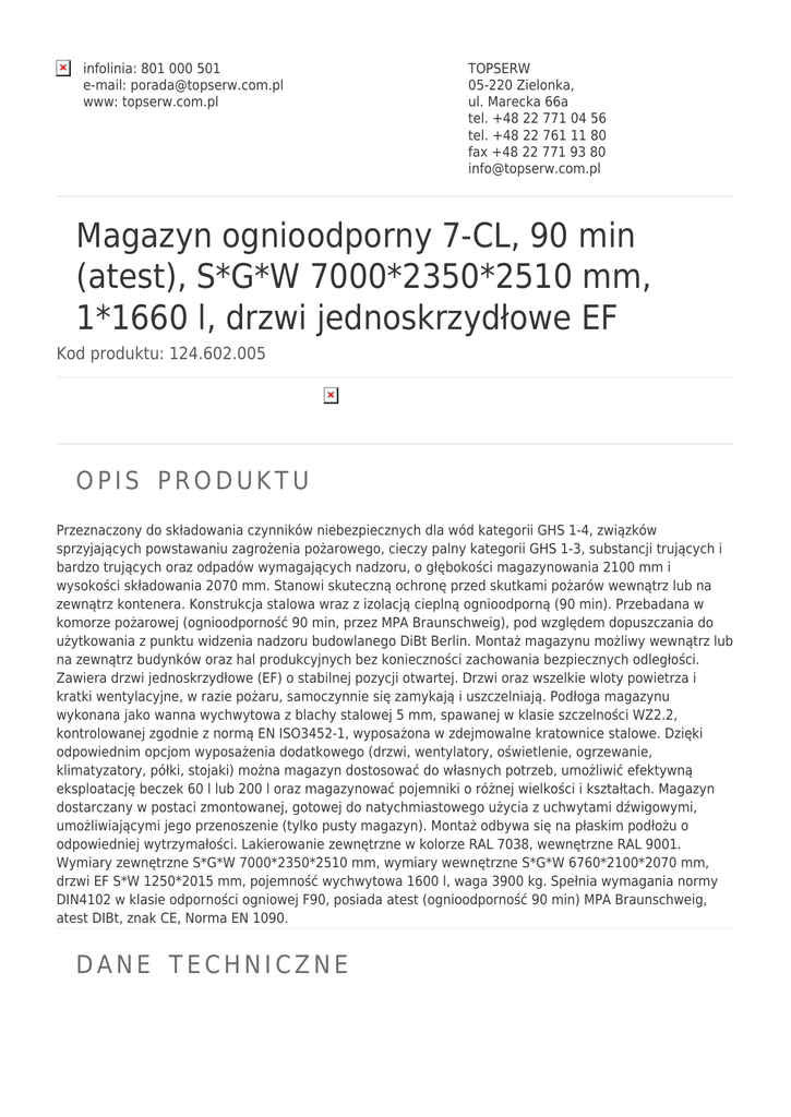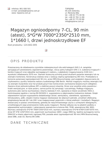infolinia: 801 000 501 e-mail: [email protected] www: topserw.com.pl TOPSERW 05-220 Zielonka, ul. Marecka 66a tel. +48 22 771 04 56 tel. +48 22 761 11 80 fax +48 22 771 93 80 [email protected] Magazyn ognioodporny 7-CL, 90 min (atest), S*G*W 7000*2350*2510 mm, 1*1660 l, drzwi jednoskrzydłowe EF Kod produktu: 124.602.005 OPIS PRODUKTU Przeznaczony do składowania czynników niebezpiecznych dla wód kategorii GHS 1-4, związków sprzyjających powstawaniu zagrożenia pożarowego, cieczy palny kategorii GHS 1-3, substancji trujących i bardzo trujących oraz odpadów wymagających nadzoru, o głębokości magazynowania 2100 mm i wysokości składowania 2070 mm. Stanowi skuteczną ochronę przed skutkami pożarów wewnątrz lub na zewnątrz kontenera. Konstrukcja stalowa wraz z izolacją cieplną ognioodporną (90 min). Przebadana w komorze pożarowej (ognioodporność 90 min, przez MPA Braunschweig), pod względem dopuszczania do użytkowania z punktu widzenia nadzoru budowlanego DiBt Berlin. Montaż magazynu możliwy wewnątrz lub na zewnątrz budynków oraz hal produkcyjnych bez konieczności zachowania bezpiecznych odległości. Zawiera drzwi jednoskrzydłowe (EF) o stabilnej pozycji otwartej. Drzwi oraz wszelkie wloty powietrza i kratki wentylacyjne, w razie pożaru, samoczynnie się zamykają i uszczelniają. Podłoga magazynu wykonana jako wanna wychwytowa z blachy stalowej 5 mm, spawanej w klasie szczelności WZ2.2, kontrolowanej zgodnie z normą EN ISO3452-1, wyposażona w zdejmowalne kratownice stalowe. Dzięki odpowiednim opcjom wyposażenia dodatkowego (drzwi, wentylatory, oświetlenie, ogrzewanie, klimatyzatory, półki, stojaki) można magazyn dostosować do własnych potrzeb, umożliwić efektywną eksploatację beczek 60 l lub 200 l oraz magazynować pojemniki o różnej wielkości i kształtach. Magazyn dostarczany w postaci zmontowanej, gotowej do natychmiastowego użycia z uchwytami dźwigowymi, umożliwiającymi jego przenoszenie (tylko pusty magazyn). Montaż odbywa się na płaskim podłożu o odpowiedniej wytrzymałości. Lakierowanie zewnętrzne w kolorze RAL 7038, wewnętrzne RAL 9001. Wymiary zewnętrzne S*G*W 7000*2350*2510 mm, wymiary wewnętrzne S*G*W 6760*2100*2070 mm, drzwi EF S*W 1250*2015 mm, pojemność wychwytowa 1600 l, waga 3900 kg. Spełnia wymagania normy DIN4102 w klasie odporności ogniowej F90, posiada atest (ognioodporność 90 min) MPA Braunschweig, atest DIBt, znak CE, Norma EN 1090. DANE TECHNICZNE Wymiary zewnętrzne S*G*W 7000*2350*2510 mm Wymiary wewnętrzne S*G*W 6760*2100*2070 mm Drzwi S*W 1250*2015 mm Pojemność wychwytowa 1600 l Normy DIN4102, znak CE, wykonanie Ex zgodne z ATEX Atesty DIBt POWIĄZANE Produkt Magazyn ognioodporny 7-CL, 90 min (atest), S*G*W 7000*2350*2510 mm, 1*1660 l, drzwi dwuskrzydłowe DF Magazyn ognioodporny 7-CL, 90 min (atest), S*G*W 7000*2350*2510 mm, 1*1660 l, drzwi jednoskrzydłowe EF