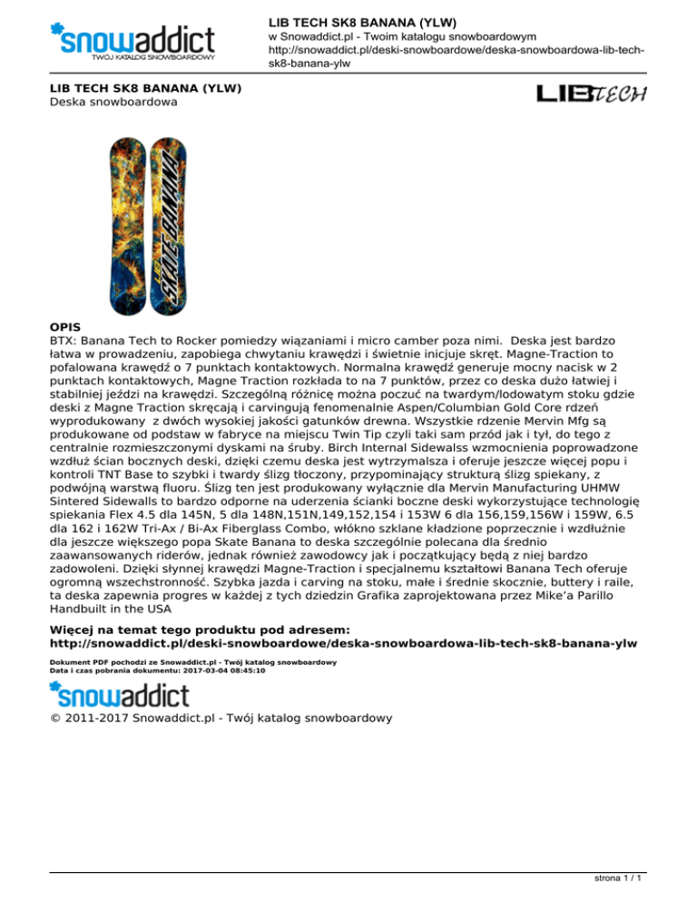 LIB TECH SK8 BANANA (YLW) w Snowaddict.pl - Twoim katalogu snowboardowym http://snowaddict.pl/deski-snowboardowe/deska-snowboardowa-lib-techsk8-banana-ylw LIB TECH SK8 BANANA (YLW) Deska snowboardowa OPIS BTX: Banana Tech to Rocker pomiedzy wiązaniami i micro camber poza nimi. Deska jest bardzo łatwa w prowadzeniu, zapobiega chwytaniu krawędzi i świetnie inicjuje skręt. Magne-Traction to pofalowana krawędź o 7 punktach kontaktowych. Normalna krawędź generuje mocny nacisk w 2 punktach kontaktowych, Magne Traction rozkłada to na 7 punktów, przez co deska dużo łatwiej i stabilniej jeździ na krawędzi. Szczególną różnicę można poczuć na twardym/lodowatym stoku gdzie deski z Magne Traction skręcają i carvingują fenomenalnie Aspen/Columbian Gold Core rdzeń wyprodukowany z dwóch wysokiej jakości gatunków drewna. Wszystkie rdzenie Mervin Mfg są produkowane od podstaw w fabryce na miejscu Twin Tip czyli taki sam przód jak i tył, do tego z centralnie rozmieszczonymi dyskami na śruby. Birch Internal Sidewalss wzmocnienia poprowadzone wzdłuż ścian bocznych deski, dzięki czemu deska jest wytrzymalsza i oferuje jeszcze więcej popu i kontroli TNT Base to szybki i twardy ślizg tłoczony, przypominający strukturą ślizg spiekany, z podwójną warstwą fluoru. Ślizg ten jest produkowany wyłącznie dla Mervin Manufacturing UHMW Sintered Sidewalls to bardzo odporne na uderzenia ścianki boczne deski wykorzystujące technologię spiekania Flex 4.5 dla 145N, 5 dla 148N,151N,149,152,154 i 153W 6 dla 156,159,156W i 159W, 6.5 dla 162 i 162W Tri-Ax / Bi-Ax Fiberglass Combo, włókno szklane kładzione poprzecznie i wzdłużnie dla jeszcze większego popa Skate Banana to deska szczególnie polecana dla średnio zaawansowanych riderów, jednak również zawodowcy jak i początkujący będą z niej bardzo zadowoleni. Dzięki słynnej krawędzi Magne-Traction i specjalnemu kształtowi Banana Tech oferuje ogromną wszechstronność. Szybka jazda i carving na stoku, małe i średnie skocznie, buttery i raile, ta deska zapewnia progres w każdej z tych dziedzin Grafika zaprojektowana przez Mike’a Parillo Handbuilt in the USA Więcej na temat tego produktu pod adresem: http://snowaddict.pl/deski-snowboardowe/deska-snowboardowa-lib-tech-sk8-banana-ylw Dokument PDF pochodzi ze Snowaddict.pl - Twój katalog snowboardowy Data i czas pobrania dokumentu: 2017-03-04 08:45:10 © 2011-2017 Snowaddict.pl - Twój katalog snowboardowy strona 1 / 1 Powered by TCPDF (www.tcpdf.org)