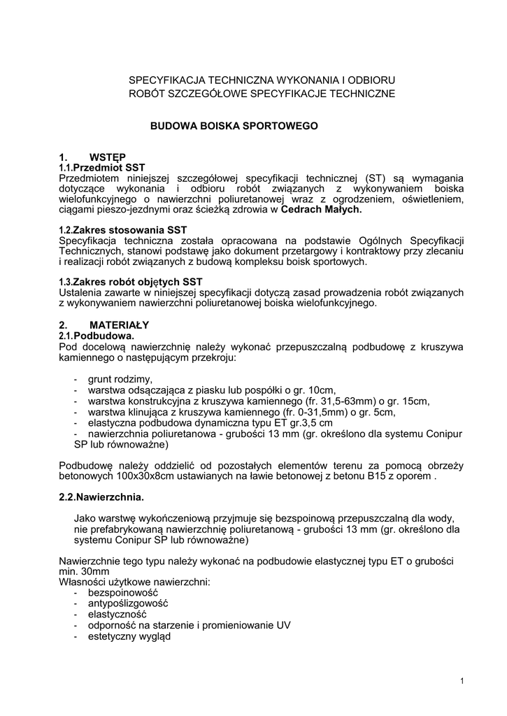 SPECYFIKACJA TECHNICZNA WYKONANIA I ODBIORU ROBÓT SZCZEGÓŁOWE SPECYFIKACJE TECHNICZNE BUDOWA BOISKA SPORTOWEGO 1. WSTĘP 1.1.Przedmiot SST Przedmiotem niniejszej szczegółowej specyfikacji technicznej (ST) są wymagania dotyczące wykonania i odbioru robót związanych z wykonywaniem boiska wielofunkcyjnego o nawierzchni poliuretanowej wraz z ogrodzeniem, oświetleniem, ciągami pieszo-jezdnymi oraz ścieżką zdrowia w Cedrach Małych. 1.2.Zakres stosowania SST Specyfikacja techniczna została opracowana na podstawie Ogólnych Specyfikacji Technicznych, stanowi podstawę jako dokument przetargowy i kontraktowy przy zlecaniu i realizacji robót związanych z budową kompleksu boisk sportowych. 1.3.Zakres robót objętych SST Ustalenia zawarte w niniejszej specyfikacji dotyczą zasad prowadzenia robót związanych z wykonywaniem nawierzchni poliuretanowej boiska wielofunkcyjnego. 2. MATERIAŁY 2.1. Podbudowa. Pod docelową nawierzchnię należy wykonać przepuszczalną podbudowę z kruszywa kamiennego o następującym przekroju: - grunt rodzimy, - warstwa odsączająca z piasku lub pospółki o gr. 10cm, - warstwa konstrukcyjna z kruszywa kamiennego (fr. 31,5-63mm) o gr. 15cm, - warstwa klinująca z kruszywa kamiennego (fr. 0-31,5mm) o gr. 5cm, - elastyczna podbudowa dynamiczna typu ET gr.3,5 cm - nawierzchnia poliuretanowa - grubości 13 mm (gr. określono dla systemu Conipur SP lub równoważne) Podbudowę należy oddzielić od pozostałych elementów terenu za pomocą obrzeży betonowych 100x30x8cm ustawianych na ławie betonowej z betonu B15 z oporem . 2.2.Nawierzchnia. Jako warstwę wykończeniową przyjmuje się bezspoinową przepuszczalną dla wody, nie prefabrykowaną nawierzchnię poliuretanową - grubości 13 mm (gr. określono dla systemu Conipur SP lub równoważne) Nawierzchnie tego typu należy wykonać na podbudowie elastycznej typu ET o grubości min. 30mm Własności użytkowe nawierzchni: - bezspoinowość - antypoślizgowość - elastyczność - odporność na starzenie i promieniowanie UV - estetyczny wygląd 1 2.3.Nawierzchnia chodników Ciągi piesze wykonać z kostki gr.6cm oraz ciągi pieszo jezdne nawiązując do stanu istniejącego przy budynku szkoły z kostki gr. 8cm - kostka brukowa betonowa - 6cm/8cm - podsypka cem-piaskowa - 4 cm - podbudowa z kruszywa stabilizowanego mechanicznie frakcji 4-31,5mm grubości 15cm - piasek – 10 cm - grunt rodzimy 2.4. Ogrodzenie, bramy i furtki; piłkochwyty Ogrodzenie systemowe-panelowe wys. 400 cm.ocynkowane i malowane proszkowo w kolorze RAL 6005. Panel dolny 8-6-8mm lub 6-5-6mm oczko 50*200; górny 8-6-8mm oczko 100*200mm – montaż za pomocą płaskowników40*6mm .Słupki RR80*40*3mm dł.4800mm. Fundament z betonu B-20; wymiar 500mm/500mm/1000mm. Ogrodzenie długości ok 160m. Ilość potrzebnego ogrodzenia sprawdzić na budowie. Bramy i furtki. Brama uchylna 5m szt. 1, furtka uchylna 1,2m szt. 3. Piłkochwyty z siatki polipropylenowej wysokości 600cm. Słupki RR 120*40*4mm dł.6850mm mocowane w fundamencie betonowym B-20 700*900*1000mm. Siatka polipropylenowa 100*100*3mm. Górą piłkochwytu należy zastosować stężenia z rury fi42*2,6mm natomiast w celu prawidłowego naciągu siatki poziome linki stalowe fi2,6*4mm 2.5. Oświetlenie Oświetlenie stanowić będą cztery słupy ze stali ocynkowanej wys.9m z oprawami 8 x 400W 2.6.Ścieżka zdrowia We wschodniej części działek na nawierzchni trawiastej projektuje się tzw. ścieżkę zdrowia, która składać się będzie z następujących elementów: - drabinka pozioma, - belka gimnastyczna, -ścianka sprawnościowa, -poręcze gimnastyczne, -równoważnia na sprężynach, -zestaw do przeskoków Posadowienie urządzeń bezwzględnie powinno uwzględniać zachowanie stref bezpieczeństwa pomiędzy urządzeniami. Urządzenia składające się na przedmiot zamówienia muszą być zaprojektowane i wykonane zgodnie z polskimi i europejskimi 2 normami i posiadać certyfikat zgodności z normami PN-EN 1176 (1-7) i PN-EN 1177 Do każdego urządzenia należy dołączyć instrukcje konserwacyjna, instrukcje użytkowania oraz opis montażu. Urządzenia powinny być zabezpieczone przed korozja i wpływami atmosferycznymi na okres nie mniejszy niż udzielona gwarancja, posiadać wysoką jakość, trwałość, estetykę, zapewniać bezpieczeństwo korzystającym z tych urządzeń dzieci. Wszystkie urządzenia zabawowe musza być wypoziomowane. Wyroby winny być objęte minimum 3 letnia gwarancja. 2.7.Trybuna dwurzędowa na konstrukcji stalowej 2x50 szt. miejsc. Trybuna 2-rzędowa, konstrukcja stalowa wykonana w ocynku ogniowym, podesty z kraty typu VEMA. Trybuna stacjonarna postawiona na kostce. Na trybunie zamontować siedzisko typ WO-06 ( oparcie 32,5 cm ). 3. SPRZĘT 3.1. Ogólne wymagania dotyczące sprzętu podane w ST „Wymagania ogólne" . 3.2.Sprzęt do wykonywania nawierzchni Wykonawca przystępujący do wykonania robót powinien wykazać się możliwością korzystania z sprzętu niezbędnego do wykonania zadania. 4. TRANSPORT 4.1. Ogólne wymagania dotyczące transportu Ogólne wymagania dotyczące transportu podano w ST „Wymagania ogólne" 5. WYKONANIE ROBÓT 5.1. Ogólne zasady wykonania robót Ogólne zasady wykonania robót podano w ST „Wymagania ogólne". 5.2. Wykonanie robót. Projektowana nawierzchnia boiska wielofunkcyjnego jest nawierzchnią sportową bezspoinową, dwuwarstwową o całkowitej grubości min. 13 mm układaną na placu budowy, (mata +natrysk) Nawierzchnia jest przepuszczalna dla wody, wykonywana in-situ, służy do pokrywania nawierzchni boisk wielofunkcyjnych, placów rekreacji ruchowej, kortów tenisowych, bieżni lekkoatletycznych, sektorów i rozbiegów konkurencji technicznych , itp. Wykonywana zgodnie z normą DIN 18035/6 + IAAF. 5.2.1.Podbudowa. Nawierzchnia poliuretanowa boiska wielofunkcyjnego wymaga podbudowy sztywnej, odpowiednio wyprofilowanej spadkami podłużnymi i poprzecznymi, odchyłki mierzone łatą dł. 2m nie powinny