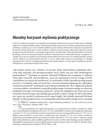 Agata Łukomska Uniwersytet Warszawski ETYKA 42, 2009 Moralny horyzont myślenia praktycznego O ile nie uznajemy moralności za zupełnie irracjonalną, każda jej teoria musi z konieczności zakładać jakąś teorię namysłu praktycznego. Tymczasem próbując opracować tę ostatnią napotykamy poważne problemy; wydaje się, że oceny wyników deliberacji nie możemy dokonywać wyłącznie na podstawie kryteriów stosowanych przy ocenie wyników myślenia teoretycznego, takich jak stopień pewności przyjmowanych przesłanek czy formalna poprawność wnioskowania. Jeśli namysł praktyczny istotnie przebiega zawsze na pozaracjonalnym podłożu żywionych przez jednostkę intuicji i pragnień, to wydaje się, że nie ma nadziei na stworzenie uniwersalnej teorii etycznej. W artykule próbuję z jednej strony wykazać, że namysł praktyczny jest w rzeczy samej tylko częściowo racjonalny, a z drugiej zaproponować wyjście z wynikającego stąd teoretycznego impasu; w moim ujęciu umożliwia je pewna interpretacja Arystotelesowskiej teorii cnoty. „Jak mamy uporać się z faktem, że życiem, które najrzetelniej respektuje właściwą rolę namysłu, jest przypuszczalnie życie, które nie jest zbyt drobiazgowo przemyślane?”1 Stawiając to pytanie, Bernard Williams nie występuje w żadnym razie jako rzecznik irracjonalizmu, stara się natomiast zwrócić uwagę swoich czytelników na więcej niż możliwość, że racjonalny wybór sposobu postępowania nie jest, a w każdym razie nie musi być, owocem namysłu dążącego do „globalnej rozumowej kontroli”2 podmiotu nad własnym działaniem. Bez wątpienia jednym z wyznaczników racjonalności namysłu praktycznego (zorientowanego na właściwe działanie) jest jego wewnętrzna spójność, i pod tym względem nie różni się on od namysłu teoretycznego (poszukującego prawdy); jeden i drugi, by był racjonalny, nie może np. gwałcić podstawowych zasad logiki. Jak jednak zauważył Richard Brandt3, można podejrzewać, że w przypadku namysłu praktycznego jest to warunek 1 B. Williams, „Działania dobrowolne i odpowiedzialne podmioty”, [w:] Ile wolności powinna mieć wola?, Warszawa, Aletheia 1999, s. 207. 2 Ibid. 3 „Co ma na myśli ktoś, kto wypowiada pytanie „Czy racjonalnie jest wybrać x zamiast y?”. Może mieć na myśli każdą z następujących rzeczy: (1) „Czy popełniłoby się sprzeczność logiczną wybierając y zamiast x?”; (2) „Czy spełnienie moich rzeczywistych życzeń wymaga preferowania x?”; (3) „Czy na dłuższą metę zrobienie x uczyni mnie szczęśliwszym niż zrobienie y?”; (4) „Czy wybór x zamiast y spełni moje przemyślane preferencje lepiej niż wybór odwrotny?”; (5) „Czy wybór x zamiast y spełni lepiej takie preferencje, jakie miałbym, gdybym był osobą w pełni odpowiadającą moim ideałom?”. Niewątpliwie istnieją jeszcze inne podobne pytania, które można tu mieć na myśli”. R. Brandt, Etyka, Warszawa, Wydawnictwo Naukowe PWN 1996, s. 636. 156 Agata Łukomska konieczny, ale nie wystarczający — wiele wskazuje na to, że, pytając o racjonalność wyboru sposobu postępowania, mamy na myśli coś więcej niż formalną poprawność wnioskowania bezpośrednio ten wybór poprzedzającego. Analiza jego procedur, a jeszcze bardziej defektów w rodzaju akrazji, dostarcza moim zdaniem przesłanek, by twierdzić, że kluczowe znaczenie dla oceny racjonalności namysłu praktycznego ma ocena ostatecznego celu, dla którego jest on podejmowany, innymi słowy, ocena osądu, na mocy którego w ogóle uznajemy, że coś jest pożądane, a dążenie do tego — moralnie dobre. Jeśli czym dla myślenia teoretycznego jest prawda, tym dla rozumowania praktycznego jest „słuszność”, to niewiele możemy powiedzieć o tym, jak powinien przebiegać namysł praktyczny, jak długo nie wiemy, od czego zależy ten jego horyzont i jakie czynniki kształtują podstawowe struktury motywacyjne każdej jednostki, którą można uznać za podmiot moralny. W zacytowanym eseju Bernard Williams sceptycznie odnosi się do tezy, że znaczącą rolę w tym procesie odgrywa Arystotelesowski ideał dojrzałego podmiotu4 — ja spróbuję podać kilka argumentów na jej poparcie. 1. Obiektywizm a spojrzenie „od wewnątrz” Zacznijmy pozornie daleko od sedna sprawy, a mianowicie od problemu wolnej woli. Otóż śledząc filozoficzne spory na ten temat, można zauważyć, że wielu filozofów, zwłaszcza spośród tych, którzy sympatyzują z kompatybilizmem, za główną przyczynę niemożliwości wypracowania choćby prowizorycznego wspólnego stanowiska w tej kwestii uważa nieodróżnianie dwóch perspektyw, z jakich można opisywać ludzkie działanie. Pierwsza z nich to spojrzenie „z zewnątrz”, w imię obiektywizmu traktujące ludzi jak inne obiekty fizyczne, podlegające prawom rządzącym całą fizyczną rzeczywistością. Przy takim ujęciu kwestią drugorzędną jest to, czy prawa te mają deterministyczny czy też indeterministyczny charakter; zachowanie człowieka będzie zawsze wyjaśniane przez odwołanie się do stanu jego organizmu w jakiejś wcześniejszej chwili oraz do praw przyrody, i z konieczności będzie się jawić albo jako zdeterminowane, albo jako przypadkowe, o ile oczywiście przyjmiemy koncepcję praw przyrody dopuszczającą przypadek. Na gruncie współczesnej nauki bodaj jedynym rozsądnym (tj. zarazem funkcjonalnym i w miarę dokładnym) „wytłumaczeniem” postępowania jakiejś osoby jest z tej perspektywy opis fizyczno–chemicznych procesów, które zachodzą w jej mózgu — a jeśli tak, to trudno znaleźć argumenty za stosowaniem innych kryteriów oceny tegoż postępowania niż sam tylko stopień poprawności, z jaką procesy te przebiegają. W tym kierunku idą na przykład badania Patricii Churchland5, która wolność definiuje jako autonomię, tę zaś uzależnia, w przypadku mózgu, który nie doznał uszkodzenia B. Wi