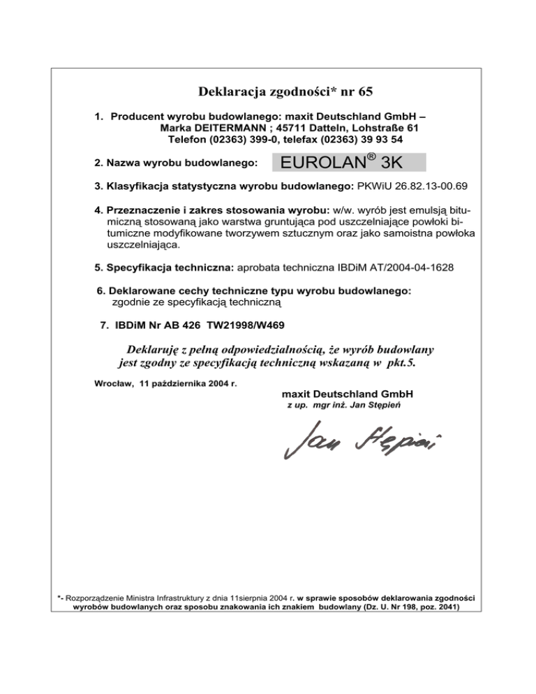 Deklaracja zgodności* nr 65 1. Producent wyrobu budowlanego: maxit Deutschland GmbH – Marka DEITERMANN ; 45711 Datteln, Lohstraße 61 Telefon (02363) 399-0, telefax (02363) 39 93 54 2. Nazwa wyrobu budowlanego: EUROLAN® 3K 3. Klasyfikacja statystyczna wyrobu budowlanego: PKWiU 26.82.13-00.69 4. Przeznaczenie i zakres stosowania wyrobu: w/w. wyrób jest emulsją bitumiczną stosowaną jako warstwa gruntująca pod uszczelniające powłoki bitumiczne modyfikowane tworzywem sztucznym oraz jako samoistna powłoka uszczelniająca. 5. Specyfikacja techniczna: aprobata techniczna IBDiM AT/2004-04-1628 6. Deklarowane cechy techniczne typu wyrobu budowlanego: zgodnie ze specyfikacją techniczną 7. IBDiM Nr AB 426 TW21998/W469 Deklaruję z pełną odpowiedzialnością, że wyrób budowlany jest zgodny ze specyfikacją techniczną wskazaną w pkt.5. Wrocław, 11 października 2004 r. maxit Deutschland GmbH z up. mgr inż. Jan Stępień *- Rozporządzenie Ministra Infrastruktury z dnia 11sierpnia 2004 r. w sprawie sposobów deklarowania zgodności wyrobów budowlanych oraz sposobu znakowania ich znakiem budowlany (Dz. U. Nr 198, poz. 2041)
