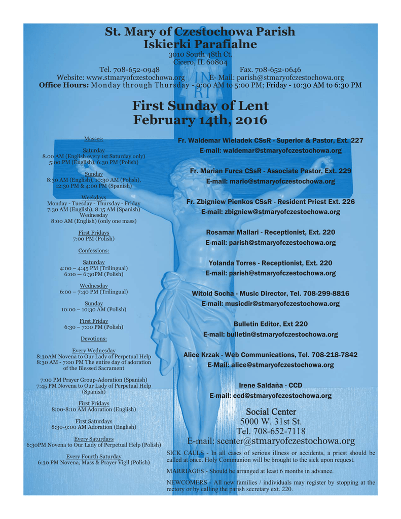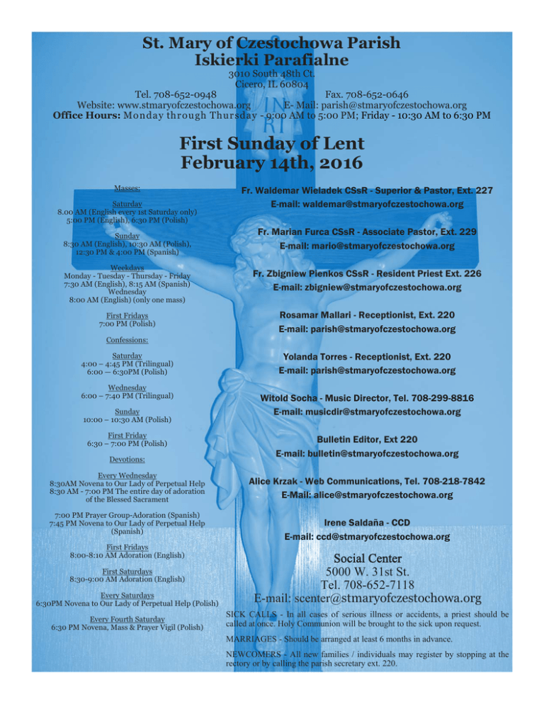 St. Mary of Czestochowa Parish Iskierki Parafialne 3010 South 48th Ct. Cicero, IL 60804 Tel. 708-652-0948 Fax. 708-652-0646 Website: www.stmaryofczestochowa.org E- Mail: [email protected] Office Hours: Mo n day thr ou gh Thu r sday - 9:00 AM to 5:00 PM; Friday - 10:30 AM to 6:30 PM First Sunday of Lent February 14th, 2016 Masses: Saturday 8.00 AM (English every 1st Saturday only) 5:00 PM (English), 6:30 PM (Polish) Sunday 8:30 AM (English), 10:30 AM (Polish), 12:30 PM & 4:00 PM (Spanish) Fr. Waldemar Wieladek CSsR - Superior & Pastor, Ext. 227 E-mail: [email protected] Fr. Marian Furca CSsR - Associate Pastor, Ext. 229 E-mail: [email protected] Weekdays Monday - Tuesday - Thursday - Friday 7:30 AM (English), 8:15 AM (Spanish) Wednesday 8:00 AM (English) (only one mass) Fr. Zbigniew Pienkos CSsR - Resident Priest Ext. 226 E-mail: [email protected] First Fridays 7:00 PM (Polish) Rosamar Mallari - Receptionist, Ext. 220 E-mail: [email protected] Confessions: Saturday 4:00 – 4:45 PM (Trilingual) 6:00 — 6:30PM (Polish) Wednesday 6:00 – 7:40 PM (Trilingual) Sunday 10:00 – 10:30 AM (Polish) First Friday 6:30 – 7:00 PM (Polish) Devotions: Every Wednesday 8:30AM Novena to Our Lady of Perpetual Help 8:30 AM - 7:00 PM The entire day of adoration of the Blessed Sacrament 7:00 PM Prayer Group-Adoration (Spanish) 7:45 PM Novena to Our Lady of Perpetual Help (Spanish) First Fridays 8:00-8:10 AM Adoration (English) Yolanda Torres - Receptionist, Ext. 220 E-mail: [email protected] Witold Socha - Music Director, Tel. 708-299-8816 E-mail: [email protected] Bulletin Editor, Ext 220 E-mail: [email protected] Alice Krzak - Web Communications, Tel. 708-218-7842 E-Mail: [email protected] Irene Saldaña - CCD E-mail: [email protected] Every Saturdays 6:30PM Novena to Our Lady of Perpetual Help (Polish) Social Center 5000 W. 31st St. Tel. 708-652-7118 E-mail: [email protected] Every Fourth Saturday 6:30 PM Novena, Mass & Prayer Vigil (Polish) SICK CALLS - In all cases of serious illness or accidents, a priest should be called at once. Holy Communion will be brought to the sick upon request. First Saturdays 8:30-9:00 AM Adoration (English) MARRIAGES - Should be arranged at least 6 months in advance. NEWCOMERS - All new families / individuals may register by stopping at the rectory or by calling the parish secretary ext. 220. Sunday Iskierki Parafialne Plenary Indulgence for the Observance of the Jubilee of Mercy Holy Year February 14, First Sunday of Lent 8:30 Birthday wishes on his 2nd birthday to Michael Yunker Jr. (Wojdula & Yunker family) †Eleanore Skora (T. Zaworski) †Francisco Oria 10:30 O szybki powrót do zdrowia dla Zofii Bystrek (Rodzina) O zdrowie i Boże bł. oraz opiekę Matki Boże Częstochowskiej dla Rozalii Gutierrez O Boże bł. i opiekę Matki Bożej z okazji urodzin (Rodzina) †Aniela Gancarczyk (Mąż z Rodziną) †Władysławę Gabryś (Syn z Rodziną) †Roman i Edward Ptak (Rodzina) †Ignacy Papciak (Żona i Rodzina) †Antonina i Leon Perhon w rocz. śm. (Synowie z rodzinami) †Czesław Tarka w 4-tą rocz. śm. (Żona i Dzieci) †Michał i Bronisława Cieśla †Norbert Rachuba i Stefan Rachuba, o wieczny spoczynek †Mirosława Kogut, Leokadia Skrzyniarz, o wieczny spoczynek †Krystyna Błazejowska (Dorota) †Stanisław Zaguła (Siostra Danuta z Rodziną) 11:30 Gorzkie Żale 12:30 †Petrita Domínguez, 5° aniversario luctuoso (hijos) †María Álvarez, eterno descanso (hija y nietos) 4:00 Por la salud espiritual de Javier Por la conversión espiritual de Eloy February 15, Monday, Lenten Weekday No Masses February 16, Tuesday, Lenten Weekday No Masses February 17, Wednesday, The Seven Holy Founders of the Servite Order No Masses February 18, Thursday, Lenten Weekday No Masses February 19, Friday, Lenten Weekday No Masses February 20, Saturday, Lenten Weekday 5PM Lenten Retreat begins (English) †Cecilia Zaremba (daughter) †Mildred Haremza (Harriet Szczurek) 6:30 W intencjach próśb i podziękowań do M. B. Nieustającej Pomocy What must one do in order to receive the special Plenary Indulgence? In order to gain this special Indulgence, a Catholic is required first to make sacramental Confession, receive the Eucharist at Mass, make a profession of faith and offer prayers for the Supreme Pontiff's intentions. In addition to and in conjunction with fulfilling these conditions, one may then take part in any of the following observances of the Jubilee of Mercy. Each time one visits, in the course of a pilgrimage, the Cathedral of the Holy Name of Jesus, or a designated Jubilee Parish, and there walks through the designated Holy Door, and makes a brief visit. If you wish to request a mass for a deceased member or a blessing or to ask for the health of a loved one or friend, you may do so at the rectory. We are open Monday—Thursday from 9 AM to 5 PM and on Friday from 10:30 to 6:30 PM. A SMALL DONATION OF $10 PER INTENTION IS REQUIRED. Lector Schedule Saturday, February 20 5:00 PM Sharon Wisnieski-Wente Jean Wojdula-Yunker Sunday, February 21 8:30 John Kociolko 10:30 Krzysztof Odbierzychleb, Kasia Kowalska 12:30 Los jovenes 4:00 Los niños Eucharistic Minister Saturday, February 20 5:00 PM Jean Wojdula-Yunker, Frances Balla 6:30 PM Jan Rozanski Sunday, February 21 8:30 Christine Zaragoza, Ann Twomey Ma. Carmen Castañeda 10:30 Krzysztof Odbierzychleb, Jan Rozanski Jan Radomyski 12:30 Vicente Saldaña, Irene Saldaña Nydia Cano, Ruth Trujillo 4:00 Rene Aviña, Gisela Aviña, Enrique Garcia We welcome in Baptism: Natalia Zofia Wodziak Eternal rest……………… †Francisco Oria †Cecil Buckner Jr. May God Who called you, take you home! St. Mary of Czestochowa Sunday Collection, February 7, 2016 Feb 06 Dear Parishioners and Friends of St. Mary of Czestochowa Parish, At this time, we wish to express our heartfelt THANK YOU to all of our parishioners who have helped to make the Christmas holidays very special. Thank you for your kind remembrance and generosity to th