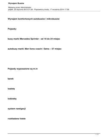Wynajem Busów Wpisany przez Administrator piątek, 25 stycznia 2013 21:28 - Poprawiony środa, 17 września 2014 17:59 Wynajem komfortowych autobusów i mikrobusów Pojazdy: busy marki Mercedes Sprinter - od 19 do 24 miejsc autobusy marki Man lions-coach i Setra – 57 miejsc Pojazdy wyposażone są m.in barek toaletę lodówkę system nawigacji rozkładane fotele 1/2 Wynajem Busów Wpisany przez Administrator piątek, 25 stycznia 2013 21:28 - Poprawiony środa, 17 września 2014 17:59 pasy bezpieczeństwa indywidualne oświetlenie itp. Realizujemy licencjonowane przewozy krajowe oraz zagraniczne ( licencja międzynarodowa). Ceny kalkulowane są w oparciu o czas wynajęcia autokaru, zaś w przypadku dłuższych tras przeliczane są na podstawie przejechanych kilometrów. Kalkulację na konkretną trasę przedstawimy Państwu na życzenie- telefonicznie, mailem, faksem. Nasza kadra to mili i doświadczeni kierowcy. 2/2