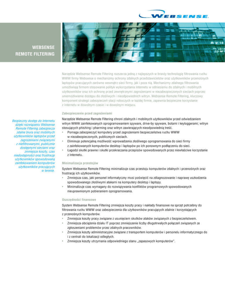WEBSENSE REMOTE FILTERING Narzêdzie Websense Remote Filtering rozszerza jedn¹ z najlepszych w bran¿y technologiê filtrowania ruchu WWW firmy Websense o mechanizmy ochrony zdalnych przedstawicielstw oraz u¿ytkowników przenoœnych laptopów pracuj¹cych zarówno wewn¹trz sieci firmy, jak i poza ni¹. Mechanizmy zdalnego filtrowania umo¿liwiaj¹ firmom stosowanie polityk wykorzystania Internetu w odniesieniu do zdalnych i mobilnych u¿ytkowników oraz ich ochronê przed zewnêtrznymi zagro¿eniami w niezabezpieczonych sieciach poprzez uniemo¿liwienie dostêpu do z³oœliwych i nieodpowiednich witryn. Websense Remote Filtering, kluczowy komponent strategii zabezpieczeñ stacji roboczych w ka¿dej firmie, zapewnia bezpieczne korzystanie z Internetu w dowolnym czasie i w dowolnym miejscu. Zabezpieczenie przed zagro¿eniami Bezpieczny dostêp do Internetu dziêki rozwi¹zaniu Websense Remote Filtering zabezpiecza zdalne biura oraz mobilnych u¿ytkowników laptopów przed zagro¿eniami zwi¹zanymi z niefiltrowanymi, publicznie dostêpnymi sieciami oraz zmniejsza koszty, czas niedostêpnoœci oraz frustracjê u¿ytkowników spowodowan¹ zainfekowaniem komputerów u¿ytkowników pracuj¹cych w terenie. Narzêdzie Websense Remote Filtering chroni zdalnych i mobilnych u¿ytkowników przed odwiedzaniem witryn WWW zainfekowanych oprogramowaniem spyware, drive-by spyware, botami i keyloggerami; witryn stosuj¹cych phishing i pharming oraz witryn zawieraj¹cych nieodpowiedni¹ treœæ. • Pomaga zabezpieczyæ komputery przed zagro¿eniami bezpieczeñstwa ruchu WWW w niezabezpieczonych, publicznych sieciach. • Eliminuje potencjaln¹ mo¿liwoœæ wprowadzenia z³oœliwego oprogramowania do sieci firmy z zainfekowanych komputerów desktop i laptopów po ich ponownym pod³¹czeniu do sieci. • £agodzi skutki prawne i skutki przekraczania przepisów spowodowanych przez niew³aœciwe korzystanie z Internetu. Minimalizacja przestojów System Websense Remote Filtering minimalizuje czas przestoju komputerów zdalnych i przenoœnych oraz frustracjê ich u¿ytkowników. • Zmniejsza czas, jaki personel informatyczny musi poœwiêciæ na zdiagnozowanie i naprawê uszkodzenia spowodowanego z³oœliwymi atakami na komputery desktop i laptopy. • Minimalizuje czas wymagany do rozwi¹zywania konfliktów programowych spowodowanych nieuprawnionym pobieraniem oprogramowania. Oszczêdnoœci finansowe System Websense Remote Filtering zmniejsza koszty pracy i nak³ady finansowe na sprzêt potrzebny do filtrowania ruchu WWW oraz zabezpieczenia dla u¿ytkowników pracuj¹cych zdalnie i korzystaj¹cych z przenoœnych komputerów. • Zmniejsza koszty pracy zwi¹zane z usuniêciem skutków ataków zwi¹zanych z bezpieczeñstwem. • Zmniejsza obci¹¿enia dzia³u IT poprzez zmniejszenie liczby d³ugotrwa³ych po³¹czeñ zwi¹zanych ze zg³oszeniami problemów przez zdalnych pracowników. • Zmniejsza koszty administracyjne zwi¹zane z transportem komputerów i personelu informatycznego do i z centrali do lokalizacji odleg³ych. • Zmniejsza koszty utrzymania odpowiedniego stanu „zapasowych komputerów”. Jak dzia³a system Websense Remote Filtering? Websense Remote Filtering przekierowuje ¿¹dania HTTP do centralnego serwera polityki Websense w korporacji (Websense Policy Server) za poœrednictwem dostêpnego publicznie serwera Websense Remote Filtering. Serwer polityki wyszukuje politykê korzystania z Internetu okreœlonego u¿ytkownika i odpowiednio zezwala na dostêp do ¿¹danej witryny lub go blokuje. Po³¹czenie VPN nie jest do tego konieczne. Bezpieczne zarz¹dzanie polityk¹ dla u¿ytkowników zdalnych oraz pos³uguj¹cych siê sprzêtem przenoœnym Websense Remote Filtering, bêd¹cy czêœci¹ systemu Websense Client Policy Manager™ oraz dodatkowym modu³em systemów Websense Enterprise® oraz Websense Web Security Suite™, rozszerza mo¿liwoœci filtrowania ruchu WWW w firmach oraz stosowania polityki bezpieczeñstwa Internetu o u¿ytkowników zdalnych oraz pos³uguj¹cych siê sprzêtem przenoœnym niezale¿nie od ich lokalizacji b¹dŸ typu po³¹czenia sieciowego. Dziêki temu wydajnemu paradygmatowi jednolitej polityki dla wszystkich, u¿ytkownicy zdalni pos³uguj¹cy siê przenoœnym sprzêtem mog¹ korzystaæ z tych samych polityk bezpieczeñstwa i poziomu ochrony co u¿ytkownicy pracuj¹cy wewn¹trz sieci. Rozbudowane mo¿liwoœci tworzenia raportów i korzystania z Internetu przez mobilnych u¿ytkowników Websense Remote Filtering stanowi równie¿ rozszerzenia dla darmowych, rozbudowanych narzêdzi monitorowania i tworzenia raportów dostêpnych z oprogramowaniem firmy Websense o dzia³ania u¿ytkowników zdalnych i mobilnych. Firmy mog¹ proaktywnie identyfikowaæ potencjalne obszary problemów za poœrednictwem bardziej pe³nego podgl¹du dzia³añ wszystkich u¿ytkowników. Dotyczy to zarówno danych bie¿¹cych, jak i archiwalnych. Dziêki tym informacjom administratorzy IT mog¹ dostosowaæ politykê dostêpu do Internetu i jeszcze bardziej zminimalizowaæ ryzyko zwi¹zane z obni¿eniem wydajnoœci, wykorzystaniem pasma i ponoszeniem odpowiedzialnoœci prawnej w zwi¹zku z wykorzystaniem Internetu w firmie. Serwer Websense Remote Filtering Agent Websense Remote Filtering Serwer Websense Policy Firewall Wymagania systemowe Klienty Remote Filtering • Microsoft® Windows® XP Professional z dodatkiem SP1 lub SP2. • Microsoft® Windows Server® 2003 wersja Standard lub Enterprise z dodatkiem SP1. • Microsoft Windows 2000 Professional Server lub Advanced Server z dodatkiem SP3 lub SP4. Serwer Remote Filtering • Microsoft Windows Server 2003 wersje Standard lub Enterprise, lub te same systemy z dodatkiem SP1. • Microsoft Windows 2000 Server z dodatkiem SP3 lub nowszym. • Red Hat® Enterprise Linux® 3 lub 4: AS, ES, or WS, lub Red Hat Linux 9. • Sun® Solaris™ 9 lub 10 . Podsumowanie Umo¿liwienie pracownikom pracy zdalnej nabra³o dla firm kluczowego znaczenia. Poni