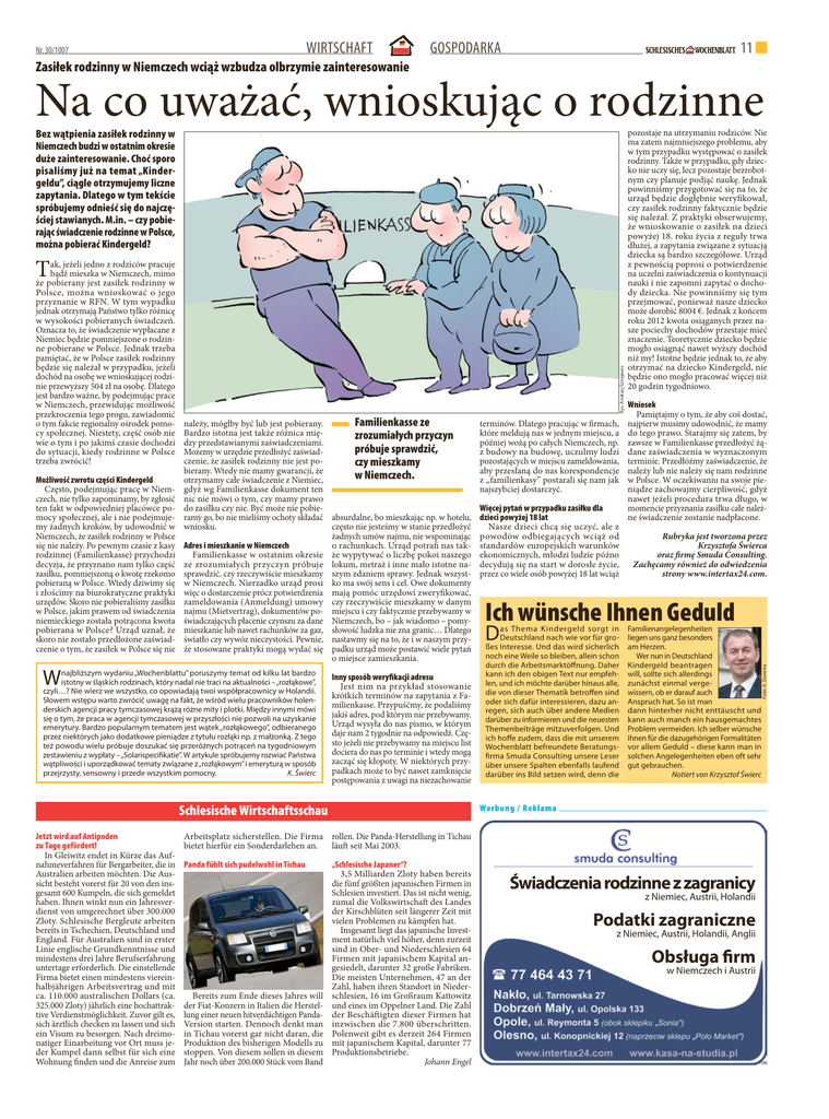 Nr. 30/1007 Wirtschaft Gospodarka 11 Zasiłek rodzinny w Niemczech wciąż wzbudza olbrzymie zainteresowanie Na co uważać, wnioskując o rodzinne Bez wątpienia zasiłek rodzinny w Niemczech budzi w ostatnim okresie duże zainteresowanie. Choć sporo pisaliśmy już na temat „Kindergeldu”, ciągle otrzymujemy liczne zapytania. Dlatego w tym tekście spróbujemy odnieść się do najczęściej stawianych. M.in. – czy pobierając świadczenie rodzinne w Polsce, można pobierać Kindergeld? Możliwość zwrotu części Kindergeld Często, podejmując pracę w Niemczech, nie tylko zapominamy, by zgłosić ten fakt w odpowiedniej placówce pomocy społecznej, ale i nie podejmujemy żadnych kroków, by udowodnić w Niemczech, że zasiłek rodzinny w Polsce się nie należy. Po pewnym czasie z kasy rodzinnej (Familienkasse) przychodzi decyzja, że przyznano nam tylko część zasiłku, pomniejszoną o kwotę rzekomo pobieraną w Polsce. Wtedy dziwimy się i złościmy na biurokratyczne praktyki urzędów. Skoro nie pobieraliśmy zasiłku w Polsce, jakim prawem od świadczenia niemieckiego została potrącona kwota pobierana w Polsce? Urząd uznał, że skoro nie zostało przedłożone zaświadczenie o tym, że zasiłek w Polsce się nie Familienkasse ze należy, mógłby być lub jest pobierany. Bardzo istotna jest także różnica mięzrozumiałych przyczyn dzy przedstawianymi zaświadczeniami. próbuje sprawdzić, Możemy w urzędzie przedłożyć zaświadczenie, że zasiłek rodzinny nie jest poczy mieszkamy bierany. Wtedy nie mamy gwarancji, że w Niemczech. otrzymamy całe świadczenie z Niemiec, gdyż wg Familienkasse dokument ten nic nie mówi o tym, czy mamy prawo do zasiłku czy nie. Być może nie pobieramy go, bo nie mieliśmy ochoty składać absurdalne, bo mieszkając np. w hotelu, wniosku. często nie jesteśmy w stanie przedłożyć żadnych umów najmu, nie wspominając Adres i mieszkanie w Niemczech o rachunkach. Urząd potrafi nas takFamilienkasse w ostatnim okresie że wypytywać o liczbę pokoi naszego ze zrozumiałych przyczyn próbuje lokum, metraż i inne mało istotne nasprawdzić, czy rzeczywiście mieszkamy szym zdaniem sprawy. Jednak wszystw Niemczech. Nierzadko urząd prosi ko ma swój sens i cel. Owe dokumenty więc o dostarczenie prócz potwierdzenia mają pomóc urzędowi zweryfikować, zameldowania (Anmeldung) umowy czy rzeczywiście mieszkamy w danym najmu (Mietvertrag), dokumentów po- miejscu i czy faktycznie przebywamy w świadczających płacenie czynszu za dane Niemczech, bo – jak wiadomo – pomymieszkanie lub nawet rachunków za gaz, słowość ludzka nie zna granic… Dlatego światło czy wywóz nieczystości. Pewnie, nastawmy się na to, że i w naszym przyże stosowane praktyki mogą wydać się padku urząd może postawić wiele pytań o miejsce zamieszkania. W najbliższym wydaniu „Wochenblattu” poruszymy temat od kilku lat bardzo istotny w śląskich rodzinach, który nadal nie traci na aktualności – „rozłąkowe”, czyli…? Nie wierz we wszystko, co opowiadają twoi współpracownicy w Holandii. Słowem wstępu warto zwrócić uwagę na fakt, że wśród wielu pracowników holenderskich agencji pracy tymczasowej krążą różne mity i plotki. Między innymi mówi się o tym, że praca w agencji tymczasowej w przyszłości nie pozwoli na uzyskanie emerytury. Bardzo popularnym tematem jest wątek „rozłąkowego”, odbieranego przez niektórych jako dodatkowe pieniądze z tytułu rozłąki np. z małżonką. Z tego też powodu wielu próbuje doszukać się przeróżnych potrąceń na tygodniowym zestawieniu z wypłaty – „Solarispecifikatie”. W artykule spróbujemy rozwiać Państwa wątpliwości i uporządkować tematy związane z „rozłąkowym” i emeryturą w sposób przejrzysty, sensowny i przede wszystkim pomocny. K. Świerc Inny sposób weryfikacji adresu Jest nim na przykład stosowanie krótkich terminów na zapytania z Familienkasse. Przypuśćmy, że podaliśmy jakiś adres, pod którym nie przebywamy. Urząd wysyła do nas pismo, w którym daje nam 2 tygodnie na odpowiedź. Często jeżeli nie przebywamy na miejscu list dociera do nas po terminie i wtedy mogą zacząć się kłopoty. W niektórych przypadkach może to być nawet zamknięcie postępowania z uwagi na niezachowanie Schlesische Wirtschaftsschau Jetzt wird auf Antipoden zu Tage gefördert! In Gleiwitz endet in Kürze das Aufnahmeverfahren für Bergarbeiter, die in Australien arbeiten möchten. Die Aussicht besteht vorerst für 20 von den insgesamt 600 Kumpeln, die sich gemeldet haben. Ihnen winkt nun ein Jahresverdienst von umgerechnet über 300.000 Zloty. Schlesische Bergleute arbeiten bereits in Tschechien, Deutschland und England. Für Australien sind in erster Linie englische Grundkenntnisse und mindestens drei Jahre Berufserfahrung untertage erforderlich. Die einstellende Firma bietet einen mindestens viereinhalbjährigen Arbeitsvertrag und mit ca. 110.000 australischen Dollars (ca. 325.000 Zloty) jährlich eine hochattraktive Verdienstmöglichkeit. Zuvor gilt es, sich ärztlich checken zu lassen und sich ein Visum zu besorgen. Nach dreimonatiger Einarbeitung vor Ort muss jeder Kumpel dann selbst für sich eine Wohnung finden und die Anreise zum terminów. Dlatego pracując w firmach, które meldują nas w jednym miejscu, a później wożą po całych Niemczech, np. z budowy na budowę, uczulmy ludzi pozostających w miejscu zameldowania, aby przesłaną do nas korespondencje z „familienkasy” postarali się nam jak najszybciej dostarczyć. Więcej pytań w przypadku zasiłku dla dzieci powyżej 18 lat Nasze dzieci chcą się uczyć, ale z powodów odbiegających wciąż od standardów europejskich warunków ekonomicznych, młodzi ludzie późno decydują się na start w dorosłe życie, przez co wiele osób powyżej 18 lat wciąż Wniosek Pamiętajmy o tym, że aby coś dostać, najpierw musimy udowodnić, że mamy do tego prawo. Staraj