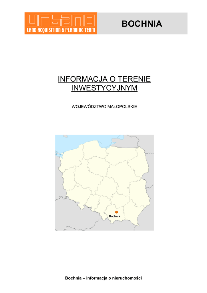 BOCHNIA INFORMACJA O TERENIE INWESTYCYJNYM WOJEWÓDZTWO MAŁOPOLSKIE Bochnia Bochnia – informacja o nieruchomości BOCHNIA 1. LOKALIZACJA 1.1 ADRES NIERUCHOMOŚCI BOCHNIA, ul. Brzeska 1.2 1.3 1.4 1.5 BOCHNIA BOCHEŃSKI MAŁOPOLSKIE MIEJSCOWOŚĆ - GMINA POWIAT WOJEWÓDZTWO POWIERZCHNIA NIERUCHOMOŚCI 1.6 POWIERZCHNIA DZIAŁEK Łączna powierzchnia nieruchomości: 0,5807 ha. Nr działki 4930/1 4930/2 4931 Powierzchnia (ha) 0,1049 0,1961 0,2797 2. CHARAKTERYSTYKA NIERUCHOMOŚCI 2.1 WŁASNOŚĆ 2.2 PLAN ZAGOSPODAROWANIA PRZESTRZENNEGO Własność prywatna. Brak prawnie obowiązującego miejscowego zagospodarowania przestrzennego. planu Zgodnie ze Studium uwarunkowań i kierunków zagospodarowania przestrzennego gminy Miasta 2.3 PRZEZNACZENIE TERENU Bochnia (Uchwała Nr IV/17/02 Rady Miejskiej w Bochni z W STUDIUM dnia 30 grudnia 2002r.) preferowane przeznaczenie UWARUNKOWAŃ I terenu, na którym leżą ww. działki to obszary zieleni KIERUNKÓW izolacyjnej średniej i wysokiej w strefie obiektów i ZAGOSPODAROWANIA urządzeń stwarzających uciążliwość lub wokół terenów PRZESTRZENNEGO wymagających ochrony. Aktualnie trwa procedura zmiany ww. Studium. Decyzja o warunkach zabudowy z dnia 27.06.07 r. wydana przez Burmistrza Miasta Bochnia dla inwestycji polegającej 2.4 WARUNKI ZABUDOWY na budowie budynku handlowego z placem parkingowym, zjazdem publicznym z drogi gminnej, pylonem reklamowym oraz infrastrukturą. 2.4.1 PODSTAWOWE Obiekt parterowy, z poddaszem nieużytkowym, o łącznej PARAMETRY BUDYNKU powierzchni zabudowy 1600 m2 2.4.2 WSKAŻNIK Wskaźnik zabudowy do 50% powierzchni działki; wskaźnik WYKORZYSTANIA powierzchni biologicznie czynnej min. 10% powierzchni POWIERZCHNI DZIAŁKI działki 2.4.3 DOSTĘP DO DROGI Poprzez projektowany wjazd publiczny od ul. Brzeskiej PUBLICZNEJ 1 miejsce parkingowe/4 zatrudnione osoby oraz 12 miejsc 2.4.5 WYMAGANIA postojowych na każde 1000 m2 powierzchni użytkowej PARKINGOWE usług 2.5 OTOCZENIE Zabudowa usługowa (sklepy, hurtownie) oraz zabudowa mieszkaniowa jednorodzinna. Bochnia – informacja o nieruchomości BOCHNIA 3. OBSŁUGA KOMUNIKACYJNA 3.1 DOSTĘPNOŚĆ KOMUNIKACYJNA Bezpośrednio do nieruchomości przylega droga powiatowa 1424 K Bochnia. Autostrada A4, najbliższy węzeł włączenia w Krakowie, w 3.2 NAJBLIŻSZA AUTOSTRADA odległości ok. 35 km, z drogi krajowej nr 4 – ul. Wielicka Droga krajowa nr 4 prowadząca od byłego przejścia 3.3 NAJBLIŻSZA DROGA granicznego z Niemcami w Jędrzychowicach do przejścia KRAJOWA granicznego w Korczowej na Ukrainę. Włączenie do drogi krajowej w odległości ok. 500 m. 3.4 NAJBLIŻSZE LOTNISKO Port lotniczy Kraków-Balice – ok. 43 km Kraków: (755 tys. mieszkańców) – ok. 44 km 3.5 NAJBLIŻSZE WIĘKSZE Katowice: (312 tys. mieszkańców) – ok. 124 km MIASTA Kielce: (206 tys. mieszkańców) – ok. 132 km Tarnów: (116tys. mieszkańców) – ok. 41 km Rzeszów: (173 tys. mieszkańców) – ok. 119 km 3.6 ODLEGŁOŚĆ DO Ok. 309 km. WARSZAWY Medyka – ok. 215 km. 3.7 ODLEGŁOŚĆ DO PRZEJŚĆ Terespol – ok. 422 km. GRANICZNYCH Bezledy – ok. 575 km. Świecko – ok. 568 km. 4. INFRASTRUKTURA Możliwość podłączenia do sieci energetycznej – warunki 4.1 ZAOPATRZENIE W ENERGIĘ techniczne w piśmie ENION Grupa Tauron z dnia ELEKTRYCZNĄ 23.04.2009 r. Możliwość doprowadzenia przyłącza z wodociągu znajdującego się w ul. Brzeskiej o średnicy 110 mm – 4.2 ZAOPATRZENIE W WODĘ warunki techniczne w piśmie Miejskiego Przedsiębiorstwa Wodociągów i Kanalizacji w Bochni z dnia 11.05.09 r. Aktualnie nie ma możliwości odprowadzania wód 4.3 KANALIZACJA opadowych z projektowanego budynku, ze względu na DESZCZOWA brak kolektora kanalizacji opadowej w części ul. Brzeskiej – pismo Urzędu Miasta Bochni z dnia 02.06.09 r. Możliwość podłączenia do gazociągu niskiego ciśnienia DN 50 zlokalizowanego na działce nr 4931 – 4.4 ZAOPATRZENIE W GAZ oświadczenie o warunkach przyłączenia, Karpacka Spółka Gazownictwa pismo z dnia 25.05.09 r. Możliwość doprowadzenia przyłącza do studzienki kanalizacji sanitarnej zlokalizowanej w ul. Brzeskiej – 4.5 KANALIZACJA SANITARNA warunki techniczne w piśmie Miejskiego Przedsiębiorstwa Wodociągów i Kanalizacji w Bochni z dnia 11.05.09 r. Bochnia – informacja o nieruchomości BOCHNIA 5. ORGANICZENIA BUDOWLANE 5.1 PROCENT DOPUSZCZALNEJ ZABUDOWY 5.3 PROCENT POWIERZCHNI BIOLOGICZNIE CZYNNEJ 5.3 OGRANICZENIA WYSOKOŚCI BUDYNKÓW 5.4 LINIA ZABUDOWY 5.5 OGRANICZENIA W SPOSOBIE ZAGOSPODAROWANIA TERENU 50% powierzchni działki 10% powierzchni działki Wysokość górnej krawędzi elewacji frontowej, jej gzymsu lub attyki nie więcej niż 4 m od terenu przy wejściu Nieprzekraczalna linia zabudowy 10-12 m od ul. Brzeskiej oraz 15 m od osi gazociągu wysokiego ciśnienia DN 250 Przez działki nr 4930/1, 4930/2, 4931 przebiega odcinek gazociągu wysokiego ciśnienia DN 250 relacji Łukanowice-Śledziejowice w związku z czym, zostały wydane warunki techniczne lokalizacji projektowanej zabudowy na ww. nieruchomości (pismo Operatora Gazociągów Przesyłowych GAZ-SYSTEM S.A. Oddział w Tarnowie nr TT-4528-316/07 Tar-M/01). Wydano również warunki techniczne dla przebudowy odcinka ww. gazociągu nr TT-4528-214/09 Kra/GG/02. Bochnia – informacja o nieruchomości