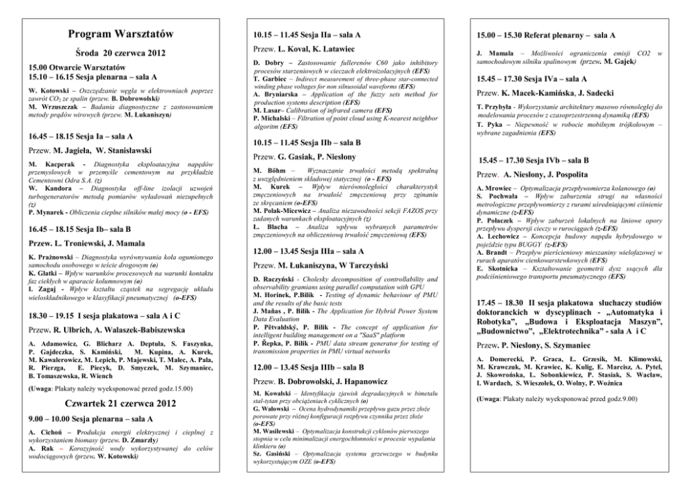 Program Warsztatów Środa 20 czerwca 2012 15.00 Otwarcie Warsztatów 15.10 – 16.15 Sesja plenarna – sala A W. Kotowski – Oszczędzanie węgla w elektrowniach poprzez zawrót CO2 ze spalin (przew. B. Dobrowolski) M. Wrzuszczak – Badania diagnostyczne z zastosowaniem metody prądów wirowych (przew. M. Łukaniszyn) 16.45 – 18.15 Sesja Ia – sala A Przew. M. Jagieła, W. Stanisławski M. Kacperak - Diagnostyka eksploatacyjna napędów przemysłowych w przemyśle cementowym na przykładzie Cementowni Odra S.A. (z) W. Kandora – Diagnostyka off-line izolacji uzwojeń turbogeneratorów metodą pomiarów wyładowań niezupełnych (z) P. Mynarek - Obliczenia cieplne silników małej mocy (o - EFS) 16.45 – 18.15 Sesja Ib– sala B 10.15 – 11.45 Sesja IIa – sala A Przew. L. Koval, K. Latawiec D. Dobry – Zastosowanie fullerenów C60 jako inhibitory procesów starzeniowych w cieczach elektroizolacyjnych (EFS) T. Garbiec – Indirect measurement of three-phase star-connected winding phase voltages for non silnusoidal waveforms (EFS) A. Bryniarska – Application of the fuzzy sets method for production systems description (EFS) M. Lasar– Calibration of infrared camera (EFS) P. Michalski – Filtration of point cloud using K-nearest neighbor algoritm (EFS) 18.30 – 19.15 I sesja plakatowa – sala A i C Przew. R. Ulbrich, A. Walaszek-Babiszewska A. Adamowicz, G. Blicharz A. Deptuła, S. Faszynka, P. Gajdeczka, S. Kamiński, M. Kupina, A. Kurek, M. Kawalerowicz, M. Lepich, P. Majewski, T. Malec, A. Pala, R. Pierzga, E. Piecyk, D. Smyczek, M. Szymaniec, B. Tomaszewska, R. Wiench (Uwaga: Plakaty należy wyeksponować przed godz.15.00) Czwartek 21 czerwca 2012 9.00 – 10.00 Sesja plenarna – sala A A. Cichoń – Produkcja energii elektrycznej i cieplnej z wykorzystaniem biomasy (przew. D. Zmarzły) A. Rak – Korozyjność wody wykorzystywanej do celów wodociągowych (przew. W. Kotowski) J. Mamala – Możliwości ograniczenia emisji CO2 samochodowym silniku spalinowym (przew. M. Gajek) w 15.45 – 17.30 Sesja IVa – sala A Przew. K. Macek-Kamińska, J. Sadecki T. Przybyła - Wykorzystanie architektury masowo równoległej do modelowania procesów z czasoprzestrzenną dynamiką (EFS) T. Pyka – Niepewność w robocie mobilnym trójkołowym – wybrane zagadnienia (EFS) 10.15 – 11.45 Sesja IIb – sala B Przew. G. Gasiak, P. Niesłony M. Böhm – Wyznaczanie trwałości metodą spektralną z uwzględnieniem składowej statycznej (o - EFS) M. Kurek – Wpływ nierównoległości charakterystyk zmęczeniowych na trwałość zmęczeniową przy zginaniu ze skręcaniem (o-EFS) M. Polak-Micewicz – Analiza niezawodności sekcji FAZOS przy zadanych warunkach eksploatacyjnych (z) Ł. Blacha – Analiza wpływu wybranych parametrów zmęczeniowych na obliczeniową trwałość zmęczeniową (EFS) Przew. L. Troniewski, J. Mamala K. Prażnowski – Diagnostyka wyrównywania koła ogumionego samochodu osobowego w teście drogowym (o) K. Glatki – Wpływ warunków procesowych na warunki kontaktu faz ciekłych w aparacie kolumnowym (o) I. Zagaj - Wpływ kształtu cząstek na segregację układu wieloskładnikowego w klasyfikacji pneumatycznej (o-EFS) 15.00 – 15.30 Referat plenarny – sala A 12.00 – 13.45 Sesja IIIa – sala A Przew. M. Łukaniszyna, W Tarczyński D. Raczyński - Cholesky decomposition of controllability and observability gramians using parallel computation with GPU M. Horinek, P.Bilik - Testing of dynamic behaviour of PMU and the results of the basic tests J. Maňas , P. Bilik - The Application for Hybrid Power System Data Evaluation P. Pětvaldský, P. Bilik - The concept of application for intelligent building management on a "SaaS" platform P. Řepka, P. Bilik - PMU data stream generator for testing of transmission properties in PMU virtual networks 12.00 – 13.45 Sesja IIIb – sala B Przew. B. Dobrowolski, J. Hapanowicz M. Kowalski – Identyfikacja zjawisk degradacyjnych w bimetalu stal-tytan przy obciążeniach cyklicznych (o) G. Wałowski – Ocena hydrodynamiki przepływu gazu przez złoże porowate przy różnej konfiguracji rozpływu czynnika przez złoże (o-EFS) M. Wasilewski – Optymalizacja konstrukcji cyklonów pierwszego stopnia w celu minimalizacji energochłonności w procesie wypalania klinkieru (o) Sz. Gasiński – Optymalizacja systemu grzewczego w budynku wykorzystującym OZE (o-EFS) 15.45 – 17.30 Sesja IVb – sala B Przew. A. Niesłony, J. Pospolita A. Mrowiec – Optymalizacja przepływomierza kolanowego (o) S. Pochwała – Wpływ zaburzenia strugi na własności metrologiczne przepływomierzy z rurami uśredniającymi ciśnienie dynamiczne (z-EFS) P. Polaczek – Wpływ zaburzeń lokalnych na liniowe opory przepływu dyspersji cieczy w rurociągach (z-EFS) A. Lechowicz – Koncepcja budowy napędu hybrydowego w pojeździe typu BUGGY (z-EFS) A. Brandt – Przepływ pierścieniowy mieszaniny wielofazowej w rurach aparatów cienkowarstewkowych (EFS) E. Skotnicka – Kształtowanie geometrii dysz ssących dla podciśnieniowego transportu pneumatycznego (EFS) 17.45 – 18.30 II sesja plakatowa słuchaczy studiów doktoranckich w dyscyplinach - „Automatyka i Robotyka”, „Budowa i Eksploatacja Maszyn”, „Budownictwo”, „Elektrotechnika” - sala A i C Przew. P. Niesłony, S. Szymaniec A. Domerecki, P. Graca, Ł. Grzesik, M. Klimowski, M. Krawczuk, M. Krawiec, K. Kulig, E. Marcisz, A. Pytel, J. Skowrońska, L. Sobonkiewicz, P. Stasiak, S. Wacław, I. Wardach, S. Wieszołek, O. Wolny, P. Woźnica (Uwaga: Plakaty należy wyeksponować przed godz.9.00) Piątek 22 czerwca 2012 9.00 – 10.00 Referat plenarny – sala A Norbert Szmolke -Termowizja w diagnostyce maszyn i urządzeń (przew. A. Augustynowicz) K. Brejnak, G. Stankiewicz – Jak zarobić na badaniach naukowych? - regulamin komercjalizacji wyników prac badawczo-rozwojowych w Politechnice Opolskiej. (przew. S. Zator) 10.30 – 12.00 Sesja Va – sala A Przew. J. Jagiela, S. 