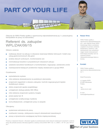 Obecnie do WIKA Polska spółka z ograniczoną odpowiedzialnością sp. k. poszukujemy kandydatów do pracy na stanowisku: Nasza firma Referent ds. zakupów WPL/ZAK/06/15 WIKA Polska spółka z ograniczoną odpowiedzialnością sp. k. jest częścią Grupy WIKA, światowego lidera w produkcji urządzeń do pomiaru ciśnienia temperatury i poziomu. Lata doświadczeń oraz wdrażanie i ciągły rozwój nowoczesnych technologii pozwoliły nam na zyskanie pozycji niekwestionowanego lidera w branży. Główne zadania: realizacja zleceń na zakupy w obszarze rezerwacji biletów lotniczych i hoteli oraz usług gastronomicznych dla gości analiza danych rynkowych, monitorowanie cen minimalizacja kosztów w przydzielonych obszarach zakupu ustalanie warunków handlowych z kontrahentami, negocjacje, zawieranie umów rozwiazywanie bieżących problemów między dostawcami a grupą WIKA Oczekiwania: wykształcenie wyższe mile widziane doświadczenie na podobnym stanowisku znajomość zagadnień z obszaru zakupów i technik negocjacyjnych będzie dodatkowym atutem dobra znajomość języka angielskiego umiejętność obsługi pakietu MS Office mile widziana znajomość systemu Axapta prawo jazdy kat. B umiejętności analitycznego myślenia komunikatywność, umiejętność pracy w zespole Oferujemy: systemowe wdrożenie do pracy możliwości rozwoju, zdobywania nowych doświadczeń zawodowych pracę w dynamicznie rozwijającej się firmie międzynarodowej Prosimy o dopisanie klauzuli: „Wyrażam zgodę na przetwarzanie moich danych osobowych zawartych w ofercie pracy dla potrzeb procesu rekrutacji zgodnie z ustawą z dnia 29.08.1997r. Dz. U. z 2002 r., Nr 101, poz. 926 ze zm." Kontakt WIKA Polska spółka z ograniczoną odpowiedzialnością sp. k. Dział Personalny ul. Łęgska 29/35 87-800 Włocławek Polska Tel.: +48 54 23-01-222 E-mail: [email protected]
