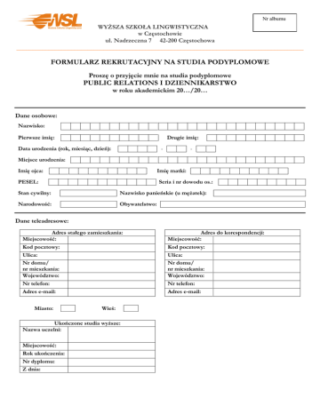 Nr albumu WYŻSZA SZKOŁA LINGWISTYCZNA w Częstochowie ul. Nadrzeczna 7 42-200 Częstochowa _________________________________________________________________________________________ FORMULARZ REKRUTACYJNY NA STUDIA PODYPLOMOWE Proszę o przyjęcie mnie na studia podyplomowe PUBLIC RELATIONS I DZIENNIKARSTWO w roku akademickim 20…/20… Dane osobowe: Nazwisko: Pierwsze imię: Drugie imię: Data urodzenia (rok, miesiąc, dzień): - - Miejsce urodzenia: Imię ojca: Imię matki: PESEL: Seria i nr dowodu os.: Stan cywilny: Nazwisko panieńskie (u mężatek): Narodowość: Obywatelstwo: Dane teleadresowe: Adres stałego zamieszkania: Miejscowość: Kod pocztowy: Ulica: Nr domu/ nr mieszkania: Województwo: Nr telefon: Adres e-mail: Miasto: Wieś: Ukończone studia wyższe: Nazwa uczelni: Miejscowość: Rok ukończenia: Nr dyplomu: Z dnia: Adres do korespondencji: Miejscowość: Kod pocztowy: Ulica: Nr domu/ nr mieszkania: Województwo: Nr telefon: Adres e-mail: Pracuję zawodowo: tak: nie: Nazwa firmy: W okresie: od: do: Na czyim utrzymaniu pozostaje kandydat: na stanowisku: rodziców opiekuna własnym Proszę podać dokładne dane osobowe i adresowe osoby utrzymującej:: …...…….………………………………………………… …………………………….……………………………… telefon: …………………………………………..………… e-mail: ……………………………………….……..……… Do podania załączam: 1. Dyplom (odpis) ukończenia.................................................................................................................................................. .......................................................................nr ........................z dnia.............................. 2. Kserokopię dowodu osobistego 3. 2 zdjęcia. Potwierdzenie otrzymania w/w dokumentów przez uczelnię ................................................. podpis pracownika WSL OŚWIADCZENIE SŁUCHACZA STUDIÓW PODYPLOMOWYCH Oświadczam, że otrzymałam(łem) obowiązujące w Uczelni dokumenty regulujące zasady jej funkcjonowania – Umowę na czas studiów podyplomowych, Regulamin studiów podyplomowych oraz Zasady i terminy opłat za studia. Zapoznałam(łem) się z ich treścią i akceptuję zawarte w nich postanowienia. Zobowiązuję się do przestrzegania obowiązujących w Uczelni zasad unormowanych przez powyższe dokumenty a także do respektowania postanowień Umowy na czas studiów zawartej z Uczelnią. ___________________ Częstochowa, dnia ______________20____ roku _ podpis słuchacza DECYZJA KOMISJI KWALIFIKACYJNEJ Przyjęta/y/ - nie przyjęta/y/ na studia podyplomowe w roku akademickim 20___/20___ Podpisy członków Komisji Kwalifikacyjnej 1 2 3 Potwierdzam odbiór następujących dokumentów: 1. ................................................................................................ 2. ................................................................................................ 3. ................................................................................................ 4. ................................................................................................ ................................................................... data i podpis