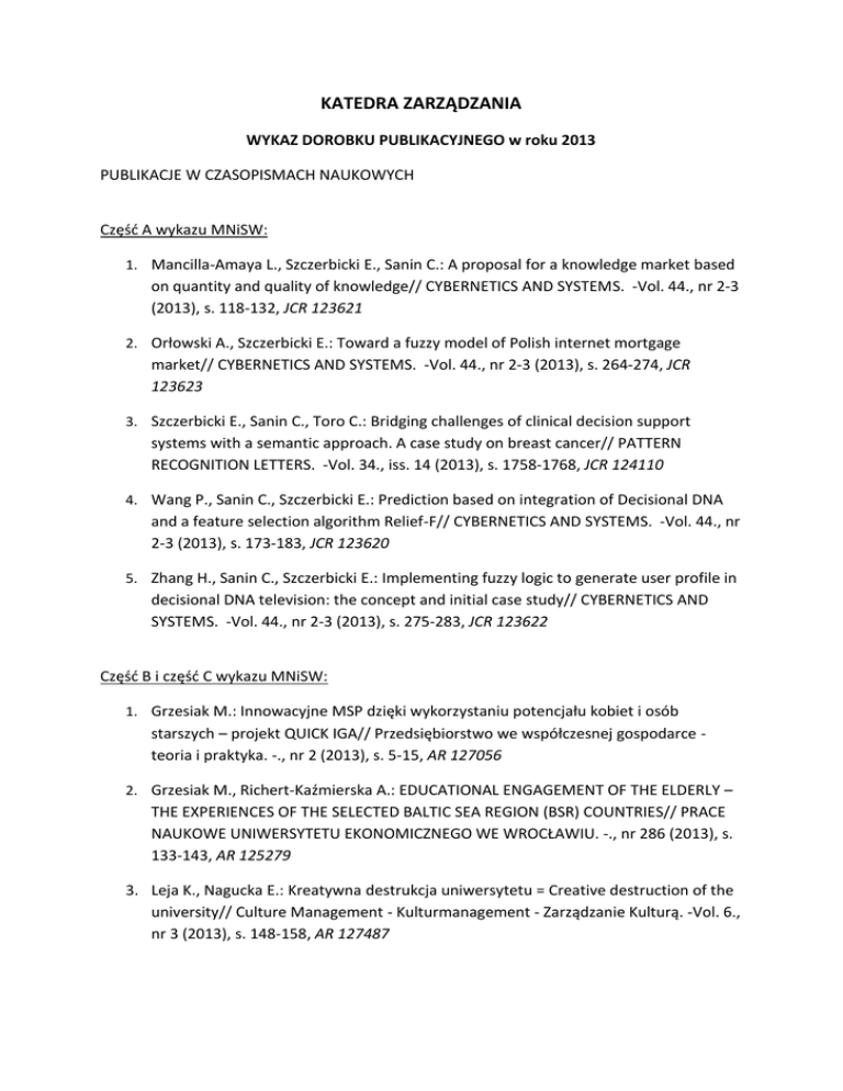 KATEDRA ZARZĄDZANIA WYKAZ DOROBKU PUBLIKACYJNEGO w roku 2013 PUBLIKACJE W CZASOPISMACH NAUKOWYCH Część A wykazu MNiSW: 1. Mancilla-Amaya L., Szczerbicki E., Sanin C.: A proposal for a knowledge market based on quantity and quality of knowledge// CYBERNETICS AND SYSTEMS. -Vol. 44., nr 2-3 (2013), s. 118-132, JCR 123621 2. Orłowski A., Szczerbicki E.: Toward a fuzzy model of Polish internet mortgage market// CYBERNETICS AND SYSTEMS. -Vol. 44., nr 2-3 (2013), s. 264-274, JCR 123623 3. Szczerbicki E., Sanin C., Toro C.: Bridging challenges of clinical decision support systems with a semantic approach. A case study on breast cancer// PATTERN RECOGNITION LETTERS. -Vol. 34., iss. 14 (2013), s. 1758-1768, JCR 124110 4. Wang P., Sanin C., Szczerbicki E.: Prediction based on integration of Decisional DNA and a feature selection algorithm Relief-F// CYBERNETICS AND SYSTEMS. -Vol. 44., nr 2-3 (2013), s. 173-183, JCR 123620 5. Zhang H., Sanin C., Szczerbicki E.: Implementing fuzzy logic to generate user profile in decisional DNA television: the concept and initial case study// CYBERNETICS AND SYSTEMS. -Vol. 44., nr 2-3 (2013), s. 275-283, JCR 123622 Część B i część C wykazu MNiSW: 1. Grzesiak M.: Innowacyjne MSP dzięki wykorzystaniu potencjału kobiet i osób starszych – projekt QUICK IGA// Przedsiębiorstwo we współczesnej gospodarce teoria i praktyka. -., nr 2 (2013), s. 5-15, AR 127056 2. Grzesiak M., Richert-Kaźmierska A.: EDUCATIONAL ENGAGEMENT OF THE ELDERLY – THE EXPERIENCES OF THE SELECTED BALTIC SEA REGION (BSR) COUNTRIES// PRACE NAUKOWE UNIWERSYTETU EKONOMICZNEGO WE WROCŁAWIU. -., nr 286 (2013), s. 133-143, AR 125279 3. Leja K., Nagucka E.: Kreatywna destrukcja uniwersytetu = Creative destruction of the university// Culture Management - Kulturmanagement - Zarządzanie Kulturą. -Vol. 6., nr 3 (2013), s. 148-158, AR 127487 4. Leja K.: Garść refleksji o parametryzacji w nauce i szkolnictwie wyższym w Polsce// Nauka Polska. Jej Potrzeby Organizacja i Rozwój. -Vol. XXII (XLVII)., (2013), s. 43-48, AR 125488 5. Leja K.: Kilka uwag o doskonaleniu zarządzania uczelnią publiczną (artykuł dyskusyjny)// Studia Ekonomiczne. Zeszyty Naukowe Uniwersytetu Ekonomicznego w Katowicach. -., nr 169 (2013), s. 102-111, AR 126944 6. Leja K.: Paradoksy w zarządzaniu organizacją - wejście do czy wyjście z labiryntu// Przedsiębiorczość i Zarządzanie. -Vol. XIV., iss. 1 (2013), s. 53-64, AR 126434 7. Leszczyna R.: Cost assessment of computer security activities// Computer Fraud & Security, iss. 7 (2013), s. 11-16, AR 124051 8. Richert-Kaźmierska A., Forkiewicz M.: Kształcenie osób starszych w koncepcji aktywnego starzenia się// Studia Ekonomiczne. Zeszyty Naukowe Uniwersytetu Ekonomicznego w Katowicach. -., nr 131 (2013), s. 127-139, AR 125335 9. Sekuła A.: Does source matter? Generation of investment expenditures by different types of local government revenues// PRACE NAUKOWE UNIWERSYTETU EKONOMICZNEGO WE WROCŁAWIU. -Vol. 283, (2013), s. 32-43, AR 124867 10. Sekuła A.: Gospodarka gruntami w małych miastach na podstawie stawek podatku od nieruchomości w gminach miejskich województwa pomorskiego// Studia Ekonomiczne. Zeszyty Naukowe Uniwersytetu Ekonomicznego w Katowicach. -Vol. 144., (2013), s. 241-252, AR 126374 11. Szuwarzyński A.: EVALUATION OF THE EFFICIENCY OF FLEXICURITY IMPLEMENTATION IN OECD COUNTRIES// Metody ilościowe w badaniach ekonomicznych. -Vol. XIV., nr 2 (2013), s. 251-260, AR 127033 12. Szuwarzyński A.: Ocena efektywności działalności pracowników naukowych jako podstawa do wytyczania ścieżek kariery// Przedsiębiorczość i Zarządzanie. -Vol. XIV., nr 13 /1 (2013), s. 193-203, AR 127030 13. Tubielewicz K.: Współpraca w sieci- wykorzystanie platformy internetowej// Mechanik. -., nr 7 (2013), s. 783-789, AR 125195 14. Zięba K., Zięba M.: Pozyskiwanie wiedzy zewnętrznej przez pomorskie firmy z sektora MSP w świetle badań empirycznych.// e-mentor. -., iss. 49 (2013), s. 61-66, AR 124053 15. Zięba M.: WYKORZYSTANIE INNOWACYJNEJ METODYKI STUDIUM PRZYPADKU W EDUKACJI BIZNESOWEJ – PROJEKT INNOCASE, LdV, TOI// Przedsiębiorstwo we współczesnej gospodarce - teoria i praktyka. -., nr 2 (2013), s. 74-81, AR 127044 ROZDZIAŁY W MONOGRAFIACH NAUKOWYCH O ZASIĘGU MIĘDZYNARODOWYM 1. Boleński N., Szczerbicki E.: A Concept of Using Knowledge Models to Secure Intellectual Capital in Enterprise// Information Systems Architecture and Technology : Intelligent Information Systems, Knowledge Discovery, Big Data and High Performance Computing/ Wrocław: Oficyna Wydawnicza Politechniki Wrocławskiej, 2013, s. 13-22, MCM 126862 2. Grzesiak M.: Professional activity and women entrepreneurship in Poland – Europe 2020 Strategy perspective// Corporate Social Responsibility and Women's Entreprreneursip around the Mare Balticum/ : , 2013, s. 422-436, MCM 125358 3. Kucharski B., Szczerbicki E.: ALLYING SYSTEM THINKING AND SET OF EXPERIENCE KNOWLEDGE STRUCTURE// Models of Decision Making in the Process of Management in a Risky Environment/ ed. Zofia Wilimowska Leszek Borzemski Adam Grzech Jerzy Świątek Wrocław: Oficyna Wydawnicza Politechniki Wroc ławskiej, 2013, s. 23-32, MCM 126376 4. Leszczyna R.: Agents in Simulation of Cyberattacks to Evaluate Security of Critical Infrastructures// Multiagent Systems and Applications/ : Springer, 2013, s. 129-146, MCM 94651 5. Leszczyna R., Egozcue E.: ENISA Study: Challenges in Securing Industrial Control Systems// Securing Critical Infrastructures and Critical Control Systems: Approaches for Threat Protection/ ed. Ch. Laing, A. Badii, P. Vickers. : IGI Global, 2013, s. 105143, MCM 94756 6. Leszczyna R., Nai Fovino I.: Evaluating Security and Resilience of Critical Networked Infrastructures after Stuxnet// Critical Information Infrastructure Protection and Resilience in the ICT Sector/ Hershey: IGI Global, 2013, s. 242-256, MCM 96473 7. Orłowski A., Szczerbicki E.: Modelling processes for Polish civil aviation market
