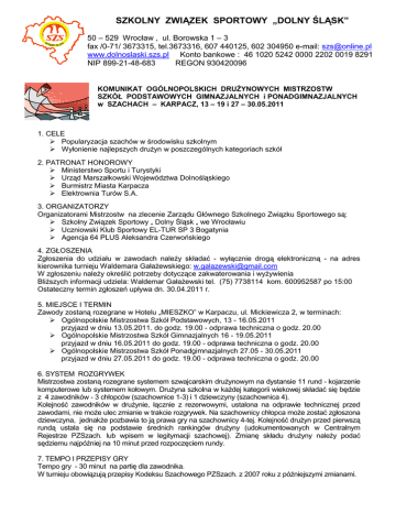SZKOLNY ZWIĄZEK SPORTOWY „DOLNY ŚLĄSK” 50 – 529 Wrocław , ul. Borowska 1 – 3 fax /0-71/ 3673315, tel.3673316, 607 440125, 602 304950 e-mail: [email protected] www.dolnoslaski.szs.pl Konto bankowe : 46 1020 5242 0000 2202 0019 8291 NIP 899-21-48-683 REGON 930420096 KOMUNIKAT OGÓLNOPOLSKICH DRUŻYNOWYCH MISTRZOSTW SZKÓŁ PODSTAWOWYCH GIMNAZJALNYCH i PONADGIMNAZJALNYCH w SZACHACH – KARPACZ, 13 – 19 i 27 – 30.05.2011 1. CELE Popularyzacja szachów w środowisku szkolnym Wyłonienie najlepszych drużyn w poszczególnych kategoriach szkół 2. PATRONAT HONOROWY Ministerstwo Sportu i Turystyki Urząd Marszałkowski Województwa Dolnośląskiego Burmistrz Miasta Karpacza Elektrownia Turów S.A. 3. ORGANIZATORZY Organizatorami Mistrzostw na zlecenie Zarządu Głównego Szkolnego Związku Sportowego są: Szkolny Związek Sportowy „ Dolny Śląsk „ we Wrocławiu Uczniowski Klub Sportowy EL-TUR SP 3 Bogatynia Agencja 64 PLUS Aleksandra Czerwońskiego 4. ZGŁOSZENIA Zgłoszenia do udziału w zawodach należy składać - wyłącznie drogą elektroniczną - na adres kierownika turnieju Waldemara Gałażewskiego: [email protected] W zgłoszeniu należy określić potrzeby dotyczące zakwaterowania i wyżywienia Bliższych informacji udziela: Waldemar Gałażewski tel. (75) 7738114 kom. 600952587 po 15:00 Ostateczny termin zgłoszeń upływa dn. 30.04.2011 r. 5. MIEJSCE I TERMIN Zawody zostaną rozegrane w Hotelu „MIESZKO” w Karpaczu, ul. Mickiewicza 2, w terminach: Ogólnopolskie Mistrzostwa Szkół Podstawowych, 13 - 16.05.2011 przyjazd w dniu 13.05.2011. do godz. 19.00 - odprawa techniczna o godz. 20.00 Ogólnopolskie Mistrzostwa Szkół Gimnazjalnych 16 - 19.05.2011 przyjazd w dniu 16.05.2011 do godz. 19.00 - odprawa techniczna o godz. 20.00 Ogólnopolskie Mistrzostwa Szkół Ponadgimnazjalnych 27.05 - 30.05.2011 przyjazd w dniu 27.05.2011 do godz. 19.00 - odprawa techniczna o godz. 20.00 6. SYSTEM ROZGRYWEK Mistrzostwa zostaną rozegrane systemem szwajcarskim drużynowym na dystansie 11 rund - kojarzenie komputerowe lub systemem kołowym. Drużyna szkolna w każdej kategorii wiekowej składać się będzie z 4 zawodników - 3 chłopców (szachownice 1-3) i 1 dziewczyny (szachownica 4). Kolejność zawodników w drużynie, łącznie z rezerwowymi, ustalona na odprawie technicznej przed zawodami, nie może ulec zmianie w trakcie rozgrywek. Na szachownicy chłopca może zostać zgłoszona dziewczyna, jednakże pozbawia to ją prawa gry na szachownicy 4-tej. Kolejność drużyn przed pierwszą rundą ustala się na podstawie średnich rankingów drużyny (udokumentowanych w Centralnym Rejestrze PZSzach. lub wpisem w legitymacji szachowej). Zmianę składu drużyny należy podać sędziemu najpóźniej na 10 minut przed rozpoczęciem rundy. 7. TEMPO I PRZEPISY GRY Tempo gry - 30 minut na partię dla zawodnika. W turnieju obowiązują przepisy Kodeksu Szachowego PZSzach. z 2007 roku z późniejszymi zmianami. 8. UCZESTNICTWO W zawodach mogą uczestniczyć: uczniowie szkół podstawowych ur. w 1998 i młodsi uczniowie szkół gimnazjalnych ur. w latach 1995 i młodsi uczniowie szkół ponadgimnazjalnych ur. w latach 1991 i młodsi uczęszczający do danej szkoły - minimum od września 2010, po zgłoszeniu i przedstawieniu ważnej legitymacji szkolnej. Prawo udziału w zawodach mają medaliści drużynowych wojewódzkich Igrzysk Młodzieży Szkolnej, Gimnazjady oraz Licealiady a w przypadku rezygnacji powyższych - zespoły które zajęły kolejne miejsca. W przypadku małej liczby zgłoszeń organizatorzy mają prawo dopuszczenia do zawodów inne zespoły tj. więcej niż trzy z województwa. 9. PUNKTACJA I OCENA WYNIKÓW Wyniki partii oceniane są następująco: wygrana - 1 p., remis - 0,5 p., przegrana - 0 p.. Kolejność drużyn w zawodach będzie ustalona na podstawie liczby zdobytych punktów meczowych (wygranie meczu - 2 p., remis - 1 p., przegrana - 0 p.) a przy ich równości decydują kolejno: - punkty małe (suma punktów drużyny zdobytych we wszystkich meczach) - wartościowanie średnie Buchholza (system szwajcarski) - wartościowanie pełne Buchholza (system szwajcarski) - wynik bezpośredniego spotkania, - lepszy wynik na pierwszej, ewentualnie kolejnych szachownicach O zajęciu pierwszego miejsca (w przypadku gdy wszystkie dodatkowe kryteria nie przyniosą rozstrzygnięcia ) decyduje dodatkowy mecz z tempem 15 minut na partię dla zawodnika. W przypadku remisu premiowany jest zespół, który odniósł zwycięstwo na wyższej szachownicy. W przypadku nieparzystej ilości uczestniczących drużyn, drużyna pauzująca otrzymuje punkt meczowy (duży) i 50% punktów (małych) możliwych do zdobycia w meczu. 10. OPŁATA STARTOWA Startowe w Zawodach Szkół Podstawowych, Gimnazjów i Szkół Ponadgimnazjalnych w wysokości 60 zł od drużyny (160 zł w przypadku drużyn nie korzystających z zakwaterowania i wyżywienia u organizatora) należy wpłacić gotówką w dniu przyjazdu lub przelewem na konto: AGENCJA 64 PLUS Bank PKO BP II O/Gorzów Wlkp. nr 96 10201967 0000 8202 0004 0444 11. ZAKWATEROWANIE I WYŻYWIENIE Zgłoszenia dotyczące zakwaterowania i wyżywienia (w Hotelu „Mieszko”) przyjmuje Waldemar Gałażewski (kontakt jak w pkt. 4) Koszt wyżywienia i zakwaterowania w pokojach 2-3-4 osobowych (z węzłem sanitarnym) wynosi 70 zł od osoby za jedną dobę. Całkowity koszt zakwaterowania i wyżywienia jednej osoby wynosi 210 zł Koszt wyżywienia i zakwaterowania w pokoju jednoosobowym wynosi 90 zł za dobę Opłatę za zakwaterowanie i wyżywienie należy wnieść przelewem na podane wyżej konto, lub gotówką przed odprawą techniczną. 12. NAGRODY I WYRÓŻNIENIA Zawodnicy trzech najlepszych drużyn otrzymają , puchary, medale, dyplomy i nagrody rzeczowe Trzech najlepszych zawodników na poszczególnych szachownicach otrzyma dyplomy i puchary Wszystkie drużyny otrzymają pamiątkowe dyplomy 13. SPRAWY RÓŻNE Opiekę wychowawczą podczas zawodów sp