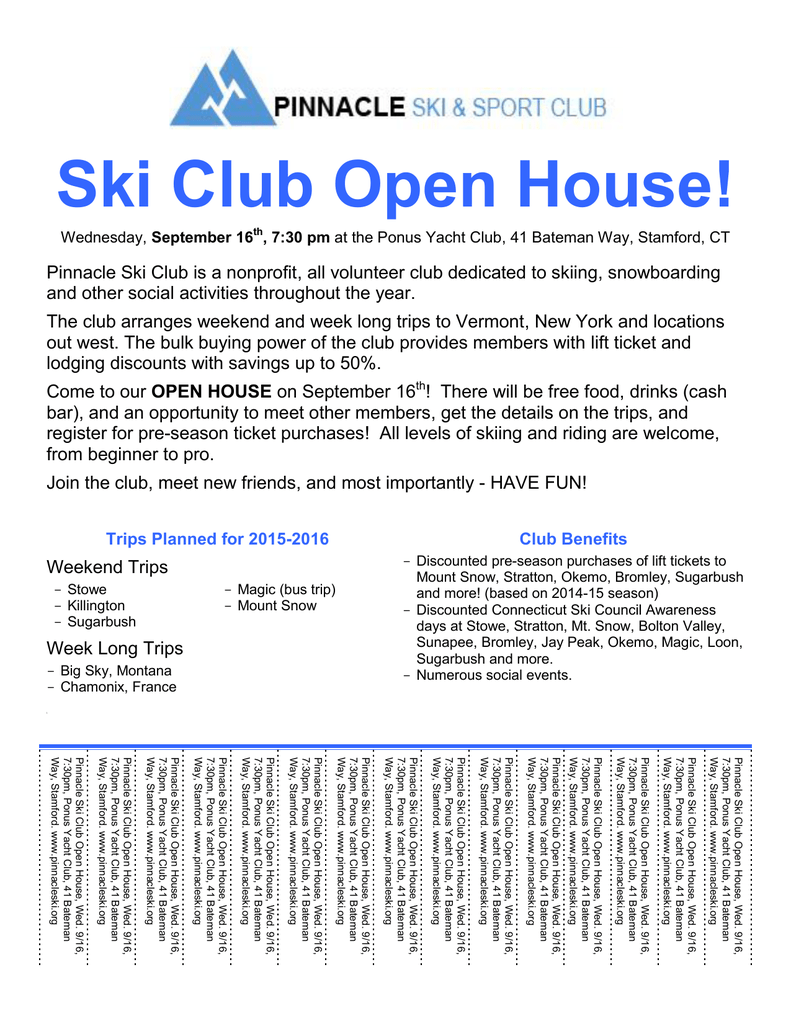 Ski Club Open House! Wednesday, September 16th, 7:30 pm at the Ponus Yacht Club, 41 Bateman Way, Stamford, CT Pinnacle Ski Club is a nonprofit, all volunteer club dedicated to skiing, snowboarding and other social activities throughout the year. The club arranges weekend and week long trips to Vermont, New York and locations out west. The bulk buying power of the club provides members with lift ticket and lodging discounts with savings up to 50%. Come to our OPEN HOUSE on September 16th! There will be free food, drinks (cash bar), and an opportunity to meet other members, get the details on the trips, and register for pre-season ticket purchases! All levels of skiing and riding are welcome, from beginner to pro. Join the club, meet new friends, and most importantly - HAVE FUN! Weekend Trips - Magic (bus trip) - Mount Snow Week Long Trips - Big Sky, Montana - Chamonix, France - Discounted pre-season purchases of lift tickets to Mount Snow, Stratton, Okemo, Bromley, Sugarbush and more! (based on 2014-15 season) - Discounted Connecticut Ski Council Awareness days at Stowe, Stratton, Mt. Snow, Bolton Valley, Sunapee, Bromley, Jay Peak, Okemo, Magic, Loon, Sugarbush and more. - Numerous social events. - Stowe - Killington - Sugarbush Club Benefits Trips Planned for 2015-2016 \ Pinnacle Ski Club Open House, Wed. 9/16, 7:30pm, Ponus Yacht Club, 41 Bateman Way, Stamford. www.pinnacleski.org Pinnacle Ski Club Open House, Wed. 9/16, 7:30pm, Ponus Yacht Club, 41 Bateman Way, Stamford. www.pinnacleski.org Pinnacle Ski Club Open House, Wed. 9/16, 7:30pm, Ponus Yacht Club, 41 Bateman Way, Stamford. www.pinnacleski.org Pinnacle Ski Club Open House, Wed. 9/16, 7:30pm, Ponus Yacht Club, 41 Bateman Way, Stamford. www.pinnacleski.org Pinnacle Ski Club Open House, Wed. 9/16, 7:30pm, Ponus Yacht Club, 41 Bateman Way, Stamford. www.pinnacleski.org Pinnacle Ski Club Open House, Wed. 9/16, 7:30pm, Ponus Yacht Club, 41 Bateman Way, Stamford. www.pinnacleski.org Pinnacle Ski Club Open House, Wed. 9/16, 7:30pm, Ponus Yacht Club, 41 Bateman Way, Stamford. www.pinnacleski.org Pinnacle Ski Club Open House, Wed. 9/16, 7:30pm, Ponus Yacht Club, 41 Bateman Way, Stamford. www.pinnacleski.org Pinnacle Ski Club Open House, Wed. 9/16, 7:30pm, Ponus Yacht Club, 41 Bateman Way, Stamford. www.pinnacleski.org Pinnacle Ski Club Open House, Wed. 9/16, 7:30pm, Ponus Yacht Club, 41 Bateman Way, Stamford. www.pinnacleski.org Pinnacle Ski Club Open House, Wed. 9/16, 7:30pm, Ponus Yacht Club, 41 Bateman Way, Stamford. www.pinnacleski.org Pinnacle Ski Club Open House, Wed. 9/16, 7:30pm, Ponus Yacht Club, 41 Bateman Way, Stamford. www.pinnacleski.org Pinnacle Ski Club Open House, Wed. 9/16, 7:30pm, Ponus Yacht Club, 41 Bateman Way, Stamford. www.pinnacleski.org Pinnacle Ski Club Open House, Wed. 9/16, 7:30pm, Ponus Yacht Club, 41 Bateman Way, Stamford. www.pinnacleski.org Pinnacle Ski Club Open House, Wed. 9/16, 7:30pm, Ponus Yacht Club, 41 Bateman Way, Stamford. www.pinnacleski.org