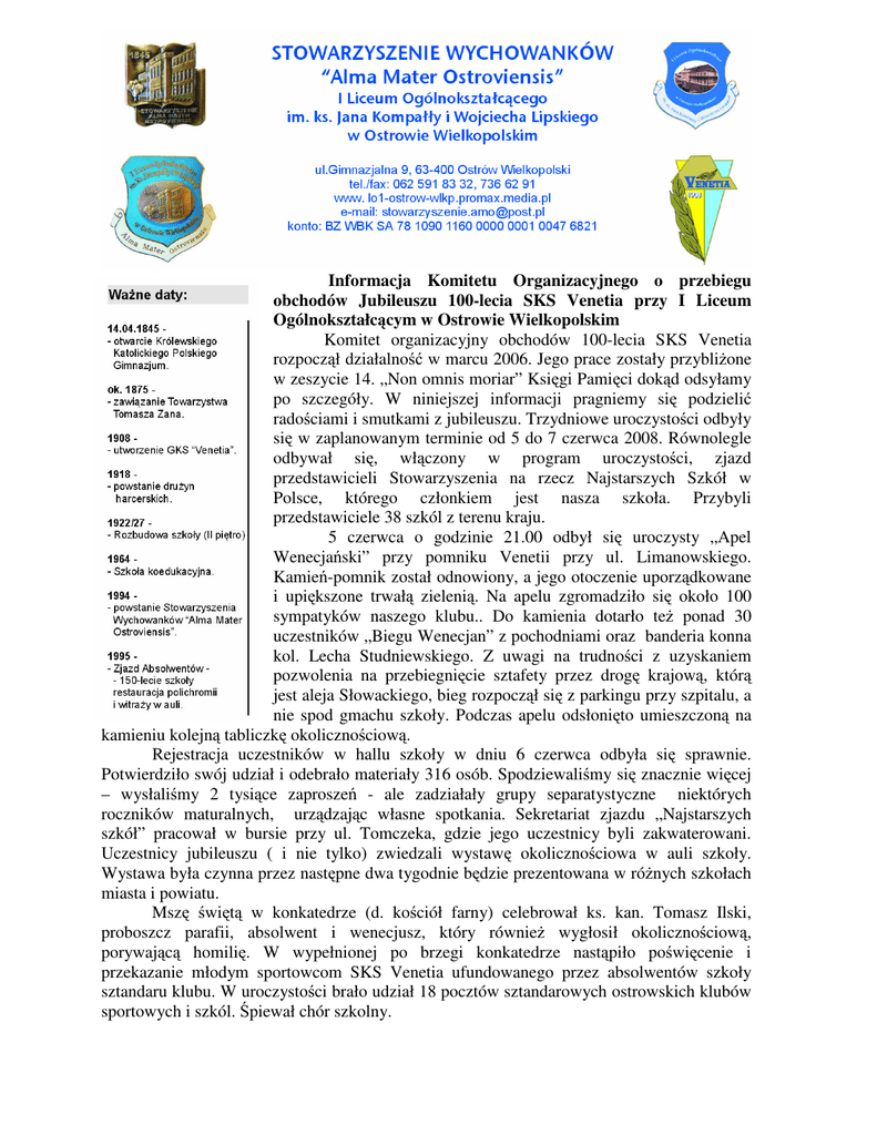 Informacja Komitetu Organizacyjnego o przebiegu obchodów Jubileuszu 100-lecia SKS Venetia przy I Liceum Ogólnokształc cym w Ostrowie Wielkopolskim Komitet organizacyjny obchodów 100-lecia SKS Venetia rozpocz ł działalno w marcu 2006. Jego prace zostały przybli one w zeszycie 14. „Non omnis moriar” Ksi gi Pami ci dok d odsyłamy po szczegóły. W niniejszej informacji pragniemy si podzieli rado ciami i smutkami z jubileuszu. Trzydniowe uroczysto ci odbyły si w zaplanowanym terminie od 5 do 7 czerwca 2008. Równolegle odbywał si , wł czony w program uroczysto ci, zjazd przedstawicieli Stowarzyszenia na rzecz Najstarszych Szkół w Polsce, którego członkiem jest nasza szkoła. Przybyli przedstawiciele 38 szkól z terenu kraju. 5 czerwca o godzinie 21.00 odbył si uroczysty „Apel Wenecja ski” przy pomniku Venetii przy ul. Limanowskiego. Kamie -pomnik został odnowiony, a jego otoczenie uporz dkowane i upi kszone trwał zieleni . Na apelu zgromadziło si około 100 sympatyków naszego klubu.. Do kamienia dotarło te ponad 30 uczestników „Biegu Wenecjan” z pochodniami oraz banderia konna kol. Lecha Studniewskiego. Z uwagi na trudno ci z uzyskaniem pozwolenia na przebiegni cie sztafety przez drog krajow , któr jest aleja Słowackiego, bieg rozpocz ł si z parkingu przy szpitalu, a nie spod gmachu szkoły. Podczas apelu odsłoni to umieszczon na kamieniu kolejn tabliczk okoliczno ciow . Rejestracja uczestników w hallu szkoły w dniu 6 czerwca odbyła si sprawnie. Potwierdziło swój udział i odebrało materiały 316 osób. Spodziewali my si znacznie wi cej – wysłali my 2 tysi ce zaprosze - ale zadziałały grupy separatystyczne niektórych roczników maturalnych, urz dzaj c własne spotkania. Sekretariat zjazdu „Najstarszych szkół” pracował w bursie przy ul. Tomczeka, gdzie jego uczestnicy byli zakwaterowani. Uczestnicy jubileuszu ( i nie tylko) zwiedzali wystaw okoliczno ciowa w auli szkoły. Wystawa była czynna przez nast pne dwa tygodnie b dzie prezentowana w ró nych szkołach miasta i powiatu. Msz wi t w konkatedrze (d. ko ciół farny) celebrował ks. kan. Tomasz Ilski, proboszcz parafii, absolwent i wenecjusz, który równie wygłosił okoliczno ciow , porywaj c homili . W wypełnionej po brzegi konkatedrze nast piło po wi cenie i przekazanie młodym sportowcom SKS Venetia ufundowanego przez absolwentów szkoły sztandaru klubu. W uroczysto ci brało udział 18 pocztów sztandarowych ostrowskich klubów sportowych i szkól. piewał chór szkolny. Po Mszy wi tej uczestnicy przeszli przed gmach szkoły, sk d - po krótkim uroczystym otwarciu zjazdu - w zwartej kolumnie udali si do hali sportowej KS „Stal” przy ul. Kusoci skiego. Tam przeniesiono równie z hallu szkoły punkt sprzeda y pami tek i punkt Poczty Polskiej z okoliczno ciow piecz tk . W hali sportowej zgromadziło si około 1000 osób. Uroczystego otwarcia i powitania uczestników dokonał dyrektor szkoły dr Marek Lewicki. W cz ci oficjalnej głos zabrali: Jacek Skiba (b. dyr. szkoły), Kajetan H dzelek (czł. Zarz du PKOl, były zawodnik i prezes Venetii), Włodzimierz J drzejak (starosta powiatu ostrowskiego), Radosław Torzy ski (prezydent miasta Ostrowa Wielkopolskiego), Antoni Karwacki (prezes honorowy Polskiego Zwi zku Hokeja na Trawie), Barbara Szkudlarek z Kuratorium O wiaty w Poznaniu, Izabela Bothur i Józef Kozan w imieniu dyrektorów szkól ponadpodstawowych miasta. Odczytane zostały pozdrowienia od Mariana Sobczaka z Poznania (absolwent z 1931!!), Wojewody Wielkopolskiego, Dyrektora Generalnego PKOl. Kol. Kajetan H dzelek w imieniu PKOl wr czył Medale „Za Zasługi dla Polskiego Ruchu Olimpijskiego” dla SKS Venetia, oraz Izabeli Kaczmarek, Ryszardowi Ko cielniakowi, Włodzimierzowi Ku nierczakowi, Krzysztofowi Mikusi skiemu, Krystianowi Niełacnemu, Januszowi Spalonemu, Wojciechowi Suszyckiemu, Zbigniewowi Wittkowi, Markowi Walczakowi.W cz ci artystycznej słowno-muzycznej wyst pili uczniowie I LO oraz chór szkolny. Program przyj to z wielkim entuzjazmem i owacjami na stoj co.. Podkre li nale y zasługi w jego przygotowanie prof. Jadwigi Smok (w szkole nie ma lekcji muzyki i piewu!).Wspólny obiad wenecjan odbył si pod namiotami na stadionie KS „Stal”, a zaproszonych go ci podejmował dyrektor szkoły w restauracji „Jubilatka” przy ul. Gorzyckiej. W godzinach popołudniowych na stadionie KS Stal odbyły si zawody finałowe w lekkoatletyce z udziałem zawodników z sze ciu szkół ponadgimnazjalnych Ostrowa oraz mecz koszykówki mi dzy oldboyami Venetii i aktualn dru yn Venetii. Wygrała 1 punktem młodzie . Brawo! W „Biesiadzie Wenecja skiej”, która przeci gn ła si do 3,00 rano wzi ło udział 250 osób. No i..... musieli my zapłaci kar , bo „kto ” nas zadenuncjował, e kolega, który społecznie obsługiwał nagło nienie, odtworzył kilka utworów muzycznych bez uzyskania odpowiedniej zgody (sic!). W sobot 7 czerwca uroczysto ci zako czył rozgrywany na stadionie KS „Stal” mecz dru yn piłki no nej Oldboy Ostrovia i Oldboy Venetia. Przegrali my 6:2, ale odegramy si na 100-leciu KS „Ostrovia” w roku 2009! Uczestnicy zjazdu Stowarzyszenia na Rzecz Najstarszych Szkół w Polsce odbyli dodatkowo własn sesj (tekst referatu prezesa w zeszycie 14.), a tak e wzi li udział ( na swój koszt) w wyje dzie do Antonina, Lewkowa i Gołuchowa. W swoich wypowiedziach bardzo wysoko ocenili organizacj i przebieg jubileuszu. A oto jego rozliczenie finansowe: 1. Saldo pocz tkowe na dzie 01.01.2008 6.610,70 2. Wpływy: od członków i sympatyków stowarzyszenia 28.762,91 od Urz du Miasta Ostrowa Wielkopolskiego 7.000,00 pozostali sponsorzy 12.800,00 -----------------------Razem 55.173, 61 3 .Wydatki: Koszt bankowe 293,00 ` wi to Szkoły 217,59 Rozmowy telefoniczne, internet,, znaczki pocztowe, druki, koperty stempel okoliczno ciowy, 3.070,99 pocztówki okoliczno ciowe Reklamy zjazdowe (banery, plakaty,telewizja) 2.224,98 Projekty sztandaru, znaczków Venetii