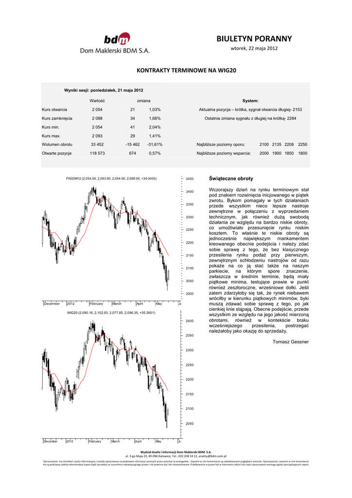 BIULETYN PORANNY wtorek, 22 maja 2012 KONTRAKTY TERMINOWE NA WIG20 Wyniki sesji: poniedziałek, 21 maja 2012 Wartość zmiana System: Kurs otwarcia 2 054 21 1,03% Aktualna pozycja – krótka, sygnał otwarcia długiej- 2153 Kurs zamknięcia 2 088 34 1,66% Ostatnia zmiana sygnału z długiej na krótką- 2284 Kurs min. 2 054 41 2,04% Kurs max. 2 093 29 1,41% Wolumen obrotu 33 452 -15 462 -31,61% Otwarte pozycje 118 573 674 0,57% Najbliższe poziomy oporu: 2100 2135 2208 2250 Najbliższe poziomy wsparcia: 2000 1900 1850 1800 FW20M12 (2,054.00, 2,093.00, 2,054.00, 2,088.00, +34.0000) 2450 2400 2350 2300 2250 2200 2150 2100 2050 2000 December 2012 February March April May Ju WIG20 (2,080.16, 2,102.93, 2,077.85, 2,096.35, +35.3601) 2400 Świąteczne obroty Wczorajszy dzień na rynku terminowym stał pod znakiem rozwinięcia inicjowanego w piątek zwrotu. Bykom pomagały w tych działaniach przede wszystkim nieco lepsze nastroje zewnętrzne w połączeniu z wyprzedaniem technicznym, jak również dużą swobodą działania ze względu na bardzo niskie obroty, co umożliwiało przesunięcie rynku niskim kosztem. To właśnie te niskie obroty są jednocześnie największym mankamentem kreowanego obecnie podejścia i należy zdać sobie sprawę z tego, że bez klasycznego przesilenia rynku podaż przy pierwszym, zewnętrznym schłodzeniu nastrojów od razu pokaże na co ją stać także na naszym parkiecie, na którym spore znaczenie, zwłaszcza w średnim terminie, będą miały piątkowe minima, testujące prawie w punkt również zeszłoroczne, wrześniowe dołki. Jeśli zatem zdarzyłoby się tak, że rynek niebawem wróciłby w kierunku piątkowych minimów, byki muszą zdawać sobie sprawę z tego, po jak cienkiej linie stąpają. Obecne podejście, przede wszystkim ze względu na jego jakość mierzoną obrotami, również w kontekście braku wcześniejszego przesilenia, postrzegać należałoby jako okazję do sprzedaży. 2350 Tomasz Gessner 2300 2250 2200 2150 2100 2050 December 2012 February March April May Ju Wydział Analiz i Informacji Dom Maklerski BDM S.A. ul. 3‐go Maja 23, 40‐096 Katowice, Tel.: 032 208 14 12, [email protected] Opracowanie ma charakter czysto informacyjny i zostało opracowany na podstawie informacji uznanych przez autorów za wiarygodne . Zawarte w nim komentarze są subiektywnymi poglądami autorów. Opracowanie i zawarte w nim komentarze nie są podstawą żadnej rekomendacji kupna bądź sprzedaży w rozumieniu obowiązującego prawa i nie powinny być tak interpretowane. Publikowanie w prasie lub w Internecie całości lub części opracowania wymaga zgody sporządzających raport. BIULETYN PORANNY wtorek, 22 maja 2012 RYNEK AKCJI Wyniki sesji: poniedziałek, 21 maja 2012 Zakres wahań Wartość obrotów [mln PLN] 52 tygodnie Indeks Kurs otwarcia Kurs zamknięcia Zmiana [%] Kurs min. Kurs max. Kurs max. Kurs min. WIG20 2 916,6 2 019,0 2 080,16 2 096,35 1,72% 2 077,85 2 102,93 25,1 347.8 sWIG80 12 800,8 8 190,8 9 176,55 9 246,03 0,54% 9 162,39 9 266,63 104,2 23,1 mWIG40 2 959,9 2 054,5 2 267,45 2 290,50 1,02% 2 267,45 2 302,22 34,8 67,1 WIG PL 49 311,3 35 670,7 37 516,17 37 646,33 1,50% 37 516,17 37 646,33 130,2 - WIG 50 164,3 35 349,0 37 490,34 37 790,45 1,44% 37 481,75 37 883,56 401,8 449,1 Spółka Cena [PLN] ASSECOPOL zmiana % Mkt Cap [mln PLN] zmiana % względem WIG20 dzienna 1M 3M 6M dzienna 1M 3M 6M 1,0% -0,6% -0,1% -7,6% 5,0% 12,8% 44,60 3 459 1,1% -5,7% -17,6% BANK HANDLOWY 72,40 9 460 -0,5% -2,8% -4,6% 8,8% -2,2% 2,9% 5,4% BOGDANKA 121,00 4 116 0,8% -2,1% -6,8% 12,9% -0,9% 3,5% 3,2% 16,9% BORYSZEW 0,62 1 399 3,3% -17,3% -24,4% -19,5% 1,6% -11,7% -14,4% -15,5% BRE 272,30 11 465 0,1% -6,1% -7,9% 8,3% -1,6% -0,5% 2,1% 12,3% GTC 6,07 1 332 -0,5% -11,6% -28,9% -31,3% -2,2% -6,0% -19,0% -27,3% JSW 90,00 10 567 1,7% -0,7% -15,9% 1,4% 0,0% 5,0% -5,9% 5,4% KERNEL 53,00 4 223 -1,1% -28,9% -24,6% -16,5% -2,8% -23,2% -14,6% -12,5% KGHM 122,30 24 460 2,4% -12,1% -12,0% -6,9% 0,7% -6,4% -2,0% -2,8% LOTOS 24,92 3 236 2,2% -16,9% -7,7% -5,6% 0,5% -11,2% 2,2% -1,6% PEKAO 136,40 35 789 2,6% -5,3% -12,6% 1,0% 0,8% 0,4% -2,6% 5,0% PGE 18,17 33 974 0,9% -3,8% -10,4% -7,2% -0,8% 1,8% -0,4% -3,1% PGNIG 3,91 23 069 0,5% -4,6% 4,8% 2,6% -1,2% 1,0% 14,8% 6,6% PKNORLEN 34,19 14 623 1,5% -8,0% -4,5% -8,3% -0,3% -2,3% 5,5% -4,3% PKOBP 31,45 39 313 1,5% -2,9% -10,1% -2,0% -0,3% 2,7% -0,2% 2,0% PZU 313,00 27 028 3,2% 0,3% -7,9% -1,3% 1,5% 5,9% 2,0% 2,7% 5,90 7 807 3,7% 0,2% 15,7% 40,5% 2,0% 5,8% 25,7% 44,5% -12,0% SYNTHOS TAURON 4,30 7 536 -0,2% -11,5% -19,6% -16,0% -1,9% -5,9% -9,7% TPSA 16,62 22 198 2,1% -0,5% -2,2% -7,2% 0,4% 5,2% 7,7% -3,1% TVN 8,23 2 830 1,4% -12,0% -27,7% -14,4% -0,4% -6,3% -17,8% -10,4% Komentarz po sesji Komentarz przed sesją: Brak obrotów nie uwiarygodnia zwyżki Dobre rozdanie dla byków Oceniając dzisiejsze notowania warto wrócić do końcówki ubiegłego tygodnia. Piątkowa sesja na giełdzie warszawskiej była powtórką notowań ze środy i zobaczyliśmy na niej próbę odreagowania wyprzedanego rynku, niestety przy bardzo niskich obrotach. Słaby styl odbicia stwarzał zagrożenie, że dziś zobaczymy powtórkę z czwartku, czyli powrót do wyraźnych spadków. Tak się nie stało i rynek warszawski wraz z innymi europejskimi giełdami notował solidne wzrosty. Indeks WIG20 był dziś jednym z najsilniejszych parkietów w Europie i zyskał na wartości 1,7%, o 1% wzrósł mWIG40, a sWIG80 zakończył dzień 0,5% powyżej piątkowego zamknięcia. Niestety, choć indeksy zanotowały zwyżki, obroty towarzyszące dzisiejszej sesji były bardzo niskie. Dla indeksu największych spółek wyniosły 347 milionów złotych, a to jest już moim zdaniem jednoznaczne wskazanie na wątłe podstawy aktualnego odbicia. Jeśli wyprzedane rynki akcji, w tym przede wszystkim indeksy na Wall Street, będą kontynuować odreagowanie, oczywiście zobaczymy jeszcze kilka zielonych sesji na GPW, lecz osobiście uważam, że na rynku nie widać oznak pozytywnego 