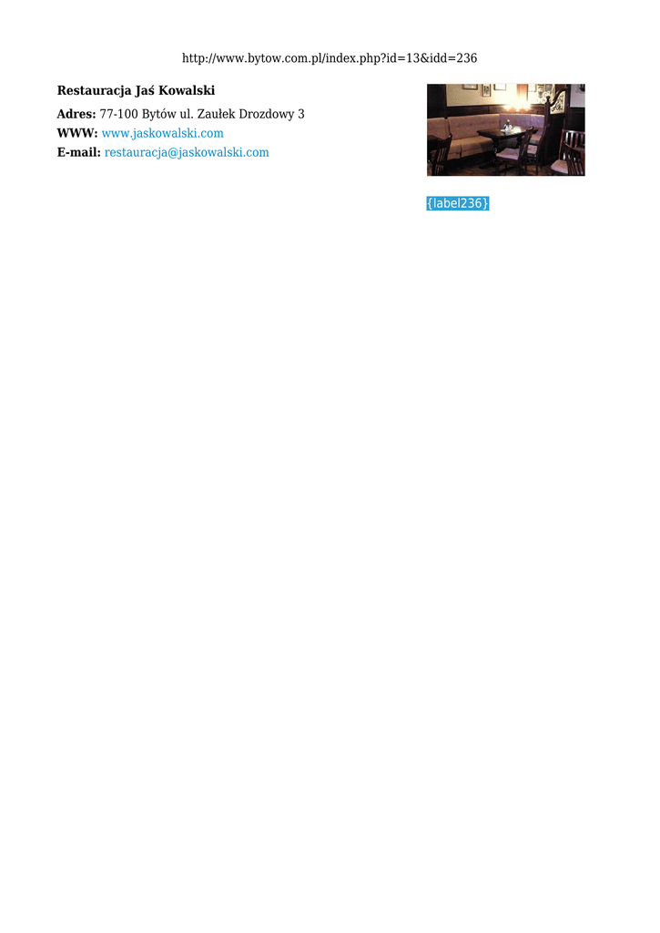 http://www.bytow.com.pl/index.php?id=13&idd=236 Restauracja Jaś Kowalski Adres: 77-100 Bytów ul. Zaułek Drozdowy 3 WWW: www.jaskowalski.com E-mail: [email protected] {label236} Dobra kuchnia, koncerty na żywo oraz wyjątkowy klimat... Jaś Kowalski to nie tylko restauracja z wyśmienitą kuchnią. To miejsce do którego chce się wracać. W klubie organizowane są koncerty, dzięki czemu nasi goście mają okazję na żywo posłuchać muzyki w szczególnosci jazzu i bluesa. koncerty w jasiu Na deskach Jasia Kowalskiego wystąpiły takie gwiazdy jak: Karen Edwards, Aga Zarian, Martyna Jakubowicz, Grażyna Łobaszewska, Mira Kubasińska, Jan Ptaszyn Wróblewski, Jarosław Śmietana, Tomasz Szukalski, Maciej Sikała, Piotr Wojtasik, Roman Puchowski, Henry Hegen, Goran Larsen, a także wielu innych znanych i mniej znanych, świetnych muzyków. W klubie odbywają się również inne imprezy takie jak kameralne spektakle teatralne oraz promocje książek. {label8}