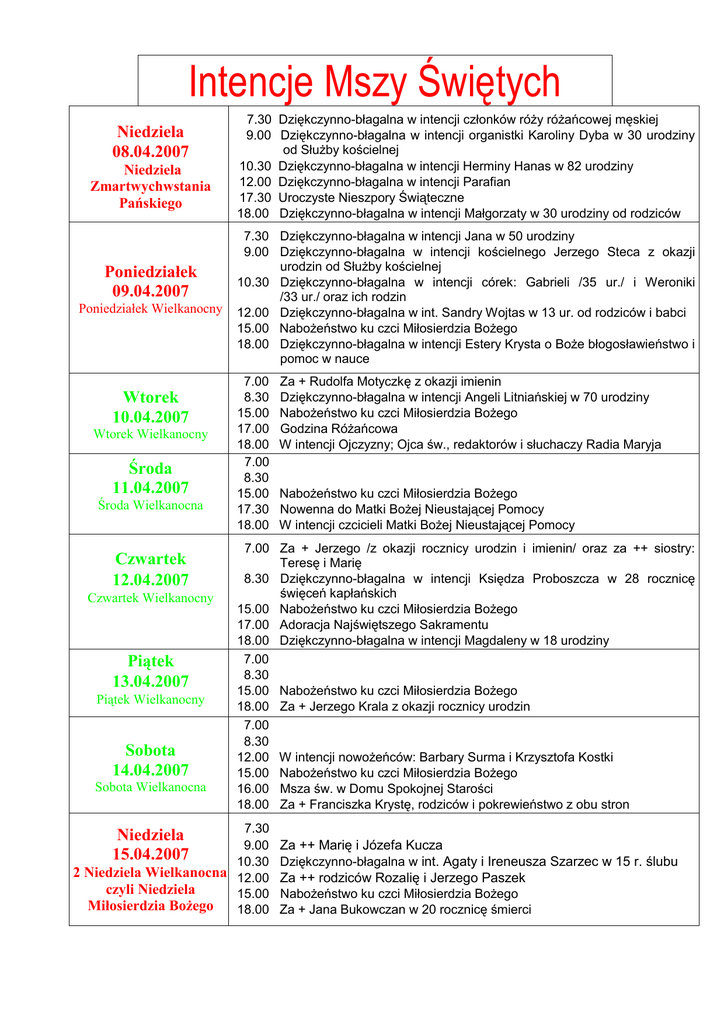 Intencje Mszy Świętych Niedziela 08.04.2007 Niedziela Zmartwychwstania Pańskiego Poniedziałek 09.04.2007 Poniedziałek Wielkanocny Wtorek 10.04.2007 Wtorek Wielkanocny Środa 11.04.2007 Środa Wielkanocna Czwartek 12.04.2007 Czwartek Wielkanocny Piątek 13.04.2007 Piątek Wielkanocny Sobota 14.04.2007 Sobota Wielkanocna 7.30 Dziękczynno-błagalna w intencji członków róŜy róŜańcowej męskiej 9.00 Dziękczynno-błagalna w intencji organistki Karoliny Dyba w 30 urodziny od SłuŜby kościelnej 10.30 Dziękczynno-błagalna w intencji Herminy Hanas w 82 urodziny 12.00 Dziękczynno-błagalna w intencji Parafian 17.30 Uroczyste Nieszpory Świąteczne 18.00 Dziękczynno-błagalna w intencji Małgorzaty w 30 urodziny od rodziców 7.30 Dziękczynno-błagalna w intencji Jana w 50 urodziny 9.00 Dziękczynno-błagalna w intencji kościelnego Jerzego Steca z okazji urodzin od SłuŜby kościelnej 10.30 Dziękczynno-błagalna w intencji córek: Gabrieli /35 ur./ i Weroniki /33 ur./ oraz ich rodzin 12.00 Dziękczynno-błagalna w int. Sandry Wojtas w 13 ur. od rodziców i babci 15.00 NaboŜeństwo ku czci Miłosierdzia BoŜego 18.00 Dziękczynno-błagalna w intencji Estery Krysta o BoŜe błogosławieństwo i pomoc w nauce 7.00 8.30 15.00 17.00 18.00 7.00 8.30 15.00 17.30 18.00 NaboŜeństwo ku czci Miłosierdzia BoŜego Nowenna do Matki BoŜej Nieustającej Pomocy W intencji czcicieli Matki BoŜej Nieustającej Pomocy 7.00 Za + Jerzego /z okazji rocznicy urodzin i imienin/ oraz za ++ siostry: Teresę i Marię 8.30 Dziękczynno-błagalna w intencji Księdza Proboszcza w 28 rocznicę święceń kapłańskich 15.00 NaboŜeństwo ku czci Miłosierdzia BoŜego 17.00 Adoracja Najświętszego Sakramentu 18.00 Dziękczynno-błagalna w intencji Magdaleny w 18 urodziny 7.00 8.30 15.00 NaboŜeństwo ku czci Miłosierdzia BoŜego 18.00 Za + Jerzego Krala z okazji rocznicy urodzin 7.00 8.30 12.00 W intencji nowoŜeńców: Barbary Surma i Krzysztofa Kostki 15.00 NaboŜeństwo ku czci Miłosierdzia BoŜego 16.00 Msza św. w Domu Spokojnej Starości 18.00 Za + Franciszka Krystę, rodziców i pokrewieństwo z obu stron 7.30 9.00 10.30 2 Niedziela Wielkanocna 12.00 czyli Niedziela 15.00 Miłosierdzia BoŜego 18.00 Niedziela 15.04.2007 Za + Rudolfa Motyczkę z okazji imienin Dziękczynno-błagalna w intencji Angeli Litniańskiej w 70 urodziny NaboŜeństwo ku czci Miłosierdzia BoŜego Godzina RóŜańcowa W intencji Ojczyzny; Ojca św., redaktorów i słuchaczy Radia Maryja Za ++ Marię i Józefa Kucza Dziękczynno-błagalna w int. Agaty i Ireneusza Szarzec w 15 r. ślubu Za ++ rodziców Rozalię i Jerzego Paszek NaboŜeństwo ku czci Miłosierdzia BoŜego Za + Jana Bukowczan w 20 rocznicę śmierci