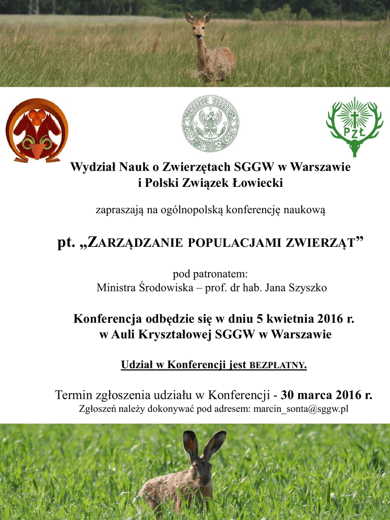 Wydział Nauk o Zwierzętach SGGW w Warszawie i Polski Związek Łowiecki zapraszają na ogólnopolską konferencję naukową pt. „ZARZĄDZANIE POPULACJAMI ZWIERZĄT” pod patronatem: Ministra Środowiska – prof. dr hab. Jana Szyszko Konferencja odbędzie się w dniu 5 kwietnia 2016 r. w Auli Kryształowej SGGW w Warszawie Udział w Konferencji jest BEZPŁATNY. Termin zgłoszenia udziału w Konferencji - 30 marca 2016 r. Zgłoszeń należy dokonywać pod adresem: [email protected] Program konferencji 9:00 - 10:00 10:00 – 10:15 Rejestracja uczestników Otwarcie konferencji 1. Metody zarządzania populacją w celu kontroli jej struktury i tempa wzrostu. – prof. dr hab. Wanda Olech, dr Agnieszka Suchecka 2. k Dynamika liczebności, jej wpływ na środowisko bytowania, a konieczność zarządzania populacją łosia w Polsce. – dr Piotr Wawrzyniak 3. Zarządzanie populacją - Bartłomiej Popczyk 4. Zarządzanie populacją wilka - prof. dr hab. Henryk Okarma Część I 10:15 - 12:45 5. 12:45 - 13:15 bobra Sus Canis scrofa w Polsce. lupus w Polsce. europejskiego Castor 1. Zarządzanie populacją żubra – prof. dr hab. Kajetan Perzanowski 2. Współczesne zagrożenia epizootyczne w populacjach zwierząt dzikich. – prof. dr hab. Krzysztof Śmietanka 3. Sytuacja zajęcy i kuropatw oraz zarządzanie ich populacjami. – dr hab. Marek Panek 4. Prawne i praktyczne instrumenty zarządzania populacjami zwierzyny grubej w lasach. – dr Jan Błaszczyk, dr inż. Bogdan Balik 5. Zmiany środowiska przyrodniczego i ich wpływ na populacjie Bison zwierząt. – prof. dr hab. Kazimierz Sporek, dr Monika Sporek 15:45 – 16:30 16:30 fiber. Przerwa kawowa Część II 13:15 – 15:45 Zarządzanie populacją - Jan Goździewski dzika Dyskusja i podsumowanie Poczęstunek z degustacją dziczyzny bonasus