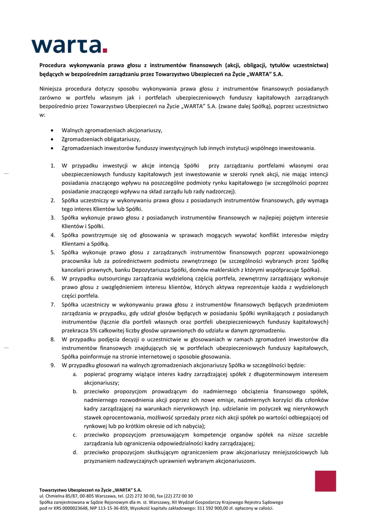 Procedura wykonywania prawa głosu z instrumentów finansowych (akcji, obligacji, tytułów uczestnictwa) będących w bezpośrednim zarządzaniu przez Towarzystwo Ubezpieczeń na Życie „WARTA” S.A. Niniejsza procedura dotyczy sposobu wykonywania prawa głosu z instrumentów finansowych posiadanych zarówno w portfelu własnym jak i portfelach ubezpieczeniowych funduszy kapitałowych zarządzanych bezpośrednio przez Towarzystwo Ubezpieczeń na Życie „WARTA” S.A. (zwane dalej Spółką), poprzez uczestnictwo w: Walnych zgromadzeniach akcjonariuszy, Zgromadzeniach obligatariuszy, Zgromadzeniach inwestorów funduszy inwestycyjnych lub innych instytucji wspólnego inwestowania. 1. W przypadku inwestycji w akcje intencją Spółki przy zarządzaniu portfelami własnymi oraz ubezpieczeniowych funduszy kapitałowych jest inwestowanie w szeroki rynek akcji, nie mając intencji posiadania znaczącego wpływu na poszczególne podmioty rynku kapitałowego (w szczególności poprzez posiadanie znaczącego wpływu na skład zarządu lub rady nadzorczej). Spółka uczestniczy w wykonywaniu prawa głosu z posiadanych instrumentów finansowych, gdy wymaga tego interes Klientów lub Spółki. Spółka wykonuje prawo głosu z posiadanych instrumentów finansowych w najlepiej pojętym interesie Klientów i Spółki. Spółka powstrzymuje się od głosowania w sprawach mogących wywołać konflikt interesów między Klientami a Spółką. Spółka wykonuje prawo głosu z zarządzanych instrumentów finansowych poprzez upoważnionego pracownika lub za pośrednictwem podmiotu zewnętrznego (w szczególności wybranych przez Spółkę kancelarii prawnych, banku Depozytariusza Spółki, domów maklerskich z którymi współpracuje Spółka). W przypadku outsourcingu zarządzania wydzieloną częścią portfela, zewnętrzny zarządzający wykonuje prawo głosu z uwzględnieniem interesu klientów, których aktywa reprezentuje każda z wydzielonych części portfela. Spółka uczestniczy w wykonywaniu prawa głosu z instrumentów finansowych będących przedmiotem zarządzania w przypadku, gdy udział głosów będących w posiadaniu Spółki wynikających z posiadanych instrumentów (łącznie dla portfeli własnych oraz portfeli ubezpieczeniowych funduszy kapitałowych) przekracza 5% całkowitej liczby głosów uprawnionych do udziału w danym zgromadzeniu. W przypadku podjęcia decyzji o uczestnictwie w głosowaniach w ramach zgromadzeń inwestorów dla instrumentów finansowych znajdujących się w portfelach ubezpieczeniowych funduszy kapitałowych, Spółka poinformuje na stronie internetowej o sposobie głosowania. W przypadku głosowań na walnych zgromadzeniach akcjonariuszy Spółka w szczególności będzie: a. popierać programy wiążące interes kadry zarządzającej spółek z długoterminowym interesem akcjonariuszy; b. przeciwko propozycjom prowadzącym do nadmiernego obciążenia finansowego spółek, nadmiernego rozwodnienia akcji poprzez ich nowe emisje, nadmiernych korzyści dla członków kadry zarządzającej na warunkach nierynkowych (np. udzielanie im pożyczek wg nierynkowych stawek oprocentowania, możliwość sprzedaży przez nich akcji spółek po wartości odbiegającej od rynkowej lub po krótkim okresie od ich nabycia); c. przeciwko propozycjom przesuwającym kompetencje organów spółek na niższe szczeble zarządzania lub ograniczenia odpowiedzialności kadry zarządzającej; d. przeciwko propozycjom skutkującym ograniczeniem praw akcjonariuszy mniejszościowych lub przyznaniem nadzwyczajnych uprawnień wybranym akcjonariuszom. 2. 3. 4. 5. 6. 7. 8. 9. Towarzystwo Ubezpieczeń na Życie „WARTA” S.A. ul. Chmielna 85/87, 00-805 Warszawa, tel. (22) 272 30 00, fax (22) 272 00 30 Spółka zarejestrowana w Sądzie Rejonowym dla m. st. Warszawy, XII Wydział Gospodarczy Krajowego Rejestru Sądowego pod nr KRS 0000023648, NIP 113-15-36-859, Wysokość kapitału zakładowego: 311 592 900,00 zł. opłacony w całości.