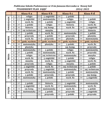 Publiczna Szkoła Podstawowa nr 8 im Janusza Korczaka w Nowej Soli TYGODNIOWY PLAN ZAJĘĆ 2014/ 2015 CZWARTEK ŚRODA WTOREK PONIEDZIAŁEK Klasa 4 a 8/10 303 religia j. angielski wych. fiz j. polski historia 6 300 zaj. techniczne 304 1 2 207 S 3 S 4 300 5 305 6 300 1 2 305 3 311 4 S 5 304 6 301 1 2 8/10 3 S 4 207 5 305 1 2 8/10 3 S 4 207 5 311 305 300 zaj. techniczne 307 8/10 j, angielski wych. fiz religia wych. fiz j, angielski matematyka przyroda j. polski ------------------historia wych. fiz matematyka j. polski przyroda ------------------- 208 305 208 311 112 1 2 8/10 3 112 zaj. komp. 305 4 305 matematyka ------------------------------------- 208 304 207 304 5 6 207 Klasa 4 c j. angielski matematyka j. polski religia zaj. komp. muzyka wych. fiz j. polski przyroda godz. wychow plastyka ------------------j. polski matematyka j. polski przyroda wych. fiz godz. wychow. matematyka plastyka matematyka j. polski religia wych. fiz muzyka przyroda j. angielski przyroda wych. fiz j. polski matematyka ------------------j. polski j. angielski 6 PIĄTEK Klasa 4 b 208 304 303 300 208 S 311 S 8/10 305 304 208 303 S 303 208 311 8/10 303 S 307 301 300 308 208 112 311 S 8/10 304 300 307 208 301 S 8/10 307 S 301 208 j. polski religia j, angielski historia wych. fiz ------------------matematyka przyroda plastyka godz. wychow. j. polski zaj. komp. religia wych. fiz matematyka j. polski j, angielski muzyka zaj. techniczne matematyka j. polski przyroda wych. fiz ------------------j. angielski matematyka wych. fiz przyroda j. polski ------------------- Klasa 4 d 205 311 S 308 303 205 300 306 302 S 301 306 301 304 311 S 205 205 300 306 112 308 306 S 205 308 301 ----------------j. polski religia wych. fiz j. angielski historia j. polski plastyka matematyka godz. wychow. wych. fiz przyroda matematyka przyroda muzyka religia wych. fiz j. polski j. polski zaj. techniczne matematyka zaj. komp. j, angielski ------------------matematyka wych. fiz j. polski j. angielski przyroda -------------------