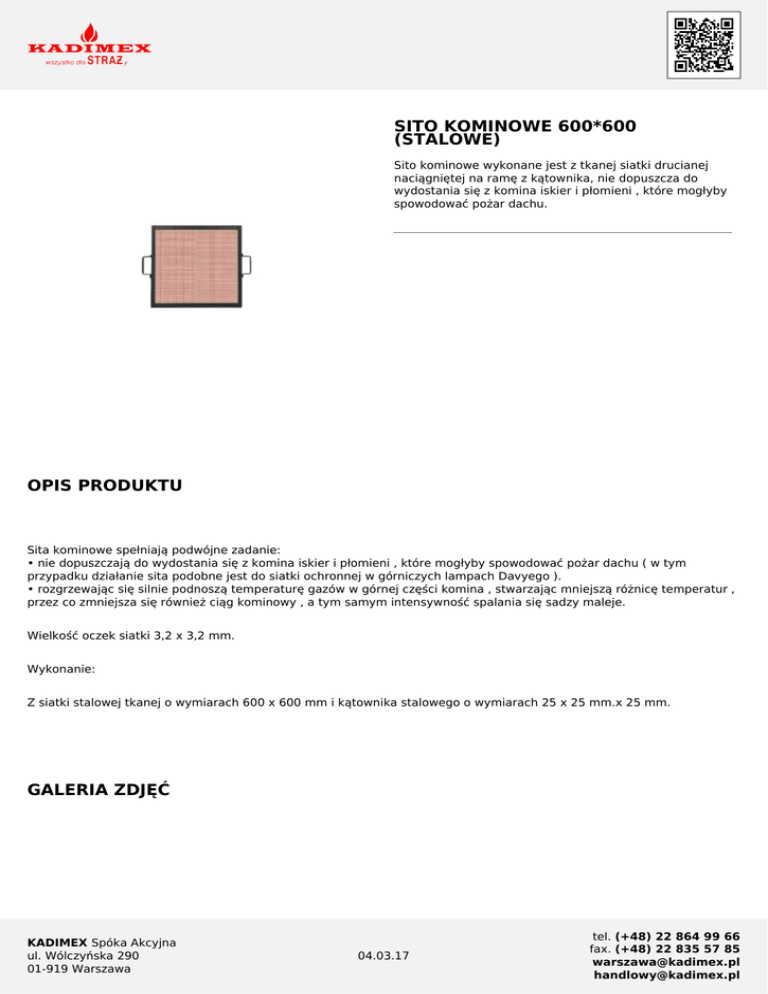 SITO KOMINOWE 600*600 (STALOWE) Sito kominowe wykonane jest z tkanej siatki drucianej naciągniętej na ramę z kątownika, nie dopuszcza do wydostania się z komina iskier i płomieni , które mogłyby spowodować pożar dachu. OPIS PRODUKTU Sita kominowe spełniają podwójne zadanie: • nie dopuszczają do wydostania się z komina iskier i płomieni , które mogłyby spowodować pożar dachu ( w tym przypadku działanie sita podobne jest do siatki ochronnej w górniczych lampach Davyego ). • rozgrzewając się silnie podnoszą temperaturę gazów w górnej części komina , stwarzając mniejszą różnicę temperatur , przez co zmniejsza się również ciąg kominowy , a tym samym intensywność spalania się sadzy maleje. Wielkość oczek siatki 3,2 x 3,2 mm. Wykonanie: Z siatki stalowej tkanej o wymiarach 600 x 600 mm i kątownika stalowego o wymiarach 25 x 25 mm.x 25 mm. GALERIA ZDJĘĆ KADIMEX Spóka Akcyjna ul. Wólczyńska 290 01-919 Warszawa 04.03.17 tel. (+48) 22 864 99 66 fax. (+48) 22 835 57 85 [email protected] [email protected] sito-kominowe KADIMEX Spóka Akcyjna ul. Wólczyńska 290 01-919 Warszawa 04.03.17 tel. (+48) 22 864 99 66 fax. (+48) 22 835 57 85 [email protected] [email protected]