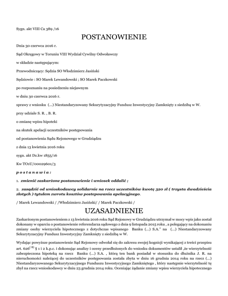 Sygn. akt VIII Ca 389 /16 POSTANOWIENIE Dnia 30 czerwca 2016 r. Sąd Okręgowy w Toruniu VIII Wydział Cywilny Odwoławczy w składzie następującym: Przewodniczący: Sędzia SO Włodzimierz Jasiński Sędziowie : SO Marek Lewandowski ; SO Marek Paczkowski po rozpoznaniu na posiedzeniu niejawnym w dniu 30 czerwca 2016 r. sprawy z wniosku (...) Niestandaryzowany Sekurytyzacyjny Fundusz Inwestycyjny Zamknięty z siedzibą w W. przy udziale S. R. , B. R. o zmianę wpisu hipoteki na skutek apelacji uczestników postępowania od postanowienia Sądu Rejonowego w Grudziądzu z dnia 13 kwietnia 2016 roku sygn. akt Dz.kw 1855/16 Kw TO1U/00029601/3 postanawia: 1. zmienić zaskarżone postanowienie i wniosek oddalić ; 2. zasądzić od wnioskodawcy solidarnie na rzecz uczestników kwotę 320 zł ( trzysta dwadzieścia złotych ) tytułem zwrotu kosztów postepowania apelacyjnego. / Marek Lewandowski / /Włodzimierz Jasiński/ / Marek Paczkowski / UZASADNIENIE Zaskarżonym postanowieniem z 13 kwietnia 2016 roku Sąd Rejonowy w Grudziądzu utrzymał w mocy wpis jako został dokonany w oparciu o postanowienie referendarza sądowego z dnia 9 listopada 2015 roku , a polegający na dokonaniu zmiany osoby wierzyciela hipotecznego z dotychczas wpisanego Banku (...) S.A.” na (...) Niestandaryzowany Sekurytyzacyjny Fundusz Inwestycyjny Zamknięty z siedzibą w W. Wydając powyższe postanowienie Sąd Rejonowy odwołał się do zakresu swojej kognicji wynikającej z treści przepisu art. 626( 8) § 1 i 2 k.p.c. i dokonując analizy i oceny przedłożonych do wniosku dokumentów ustalił ,że wierzytelność zabezpieczona hipoteką na rzecz Banku (...) S.A. , którą ten bank posiadał w stosunku do dłużnika J. R. na nieruchomości należącej do uczestników postępowania została zbyta w dniu 16 grudnia 2014 roku na rzecz (...) Niestandaryzowanego Sekurytyzacyjnego Funduszu Inwestycyjnego Zamkniętego , który następnie wierzytelność tę zbył na rzecz wnioskodawcy w dniu 23 grudnia 2014 roku. Oceniając żądanie zmiany wpisu wierzyciela hipotecznego Sąd Rejonowy podniósł , iż wnioskodawca wykazał załączonymi do wniosku dokumentami swoje następstwo prawne , samo zaś żądanie wpisu zmiany wierzyciela nie dotyczy zmiany treści wierzytelności hipotecznej i wtym zakresie Sąd Rejonowy odwołał się do przepisu art. 68( 4) u.k.w.h. wskazując ,że nie jest w takim przypadku wymagana zgoda właściciela nieruchomości na zmianę wpisu wierzyciela. W apelacji uczestników postepowania zaskarżającej postanowienie w całości podniesiono zarzut naruszenia przepisu art. 79 ust 1 w zw. z art. 67 i art. 34 u.k.w.h. poprzez błędną ich wykładnię polegającą na przyjęciu , iż wnioskodawca stał się wierzycielem hipotecznym legitymowanym do wniesienia przedmiotowego wniosku o dokonanie wpisu zmiany wierzyciela hipotecznego na swoja rzecz podczas gdy skutek zawarcia umowy cesji Banku (...) S.A. z(...) Niestandaryzowanym Sekurytyzacyjnym Funduszem Inwestycyjnym Zamkniętym nie doprowadził do zmiany wierzyciela , gdyż przed zbyciem nieruchomości nie dokonał on wpisu hipoteki na swoją rzecz. Nie uzyskał więc statusu wierzyciela hipotecznego. W konsekwencji apelacja zarzucała naruszenie przepisu art. 629( 9) k.p.c. poprzez jego niezastosowanie i w efekcie uwzględnienie wniosku o wpis w sytuacji zaistnienia braku podstaw do dokonania wpisu. Sąd Okręgowy ustalił i zważył, co następuje: Apelacja jest zasadna. Z niekwestionowanych bowiem w sprawie ustaleń faktycznych Sądu pierwszej instancji wynikało , iż wnioskodawca domagając się dokonania wpisu polegającego na zmianie ujawnionego w księdze wieczystej wierzyciela hipotecznego Banku (...) poprzez jego wykreślenie i wpisanie siebie jako wierzyciela hipotecznego , który nabył wierzytelność zabezpieczoną hipoteką na nieruchomości stanowiącej własność uczestników postepowania od osoby wcześniej nabywającą wierzytelność hipoteczną i nie ujawniającej tego faktu poprzez dokonanie zmiany wpisu wierzyciela hipotecznego na swoją rzecz ((...) Niestandaryzowany Sekurytyzacyjny Fundusz Inwestycyjny Zamknięty). W świetle powyższego zarzucane w apelacji naruszenie przepisu art. 79 ust 1 u.k.w.h. w zakresie tam opisanym jest zasadne. Trafnie wskazał Sąd Rejonowy , że przedmiotem rozstrzygnięcia jest wpis zmiany wierzyciela hipotecznego w związku z kolejnym przelewem wierzytelności zabezpieczonej hipoteką. Ta trafna konstatacja nakazywała jednak dokonanie oceny , czy kolejny przelew wierzytelności był skuteczny bowiem w ramach postępowania wieczystoksięgowego badaniu podlega także materialna podstawa wpisu ( por. np. postanowienie SN z 1 kwietnia 2005 roku , III CK 446/04 ; czy też postanowienie z 18 czerwca 20099 roku II CSK 4/09 ). Tym czasem Sąd Rejonowy odwołał się zupełnie do nie mającej związku z przedmiotem sprawy podstawy prawnej tj. art. . 68( 4) u.k.w.h. wskazując ,że nie jest w takim przypadku wymagana zgoda właściciela nieruchomości , a uszło jego uwadze , iż art. 79 ust 1 u.k.w.h. normuje przeniesienie wierzytelności zabezpieczonej hipoteką wskazując jednocześnie , iż nie jest możliwe przeniesienie wierzytelności bez przeniesienia hipoteki i odwrotnie hipoteka nie może być przeniesiona bez wierzytelności , którą zabezpiecza. Wierzytelność Banku (...)S.A. była zabezpieczona hipoteką i została razem z nią przeniesiona na (...) Niestandaryzowany Sekurytyzacyjny Fundusz Inwestycyjny Zamknięty. Jest ona jednak prawem rzeczowym ( art. 244 § 1 k.c.) i do przeniesienia takiego prawa , gdy jest ono ujawnione w księdze wieczystej potrzebny jest także wpis tego prawa do księgi ( art. 245( 1) k.c.) , który ma charakter konstytutywny. Oznacza to , że przed wpisem hipoteki do księgi wieczystej nie przeszła na (...) Finanse I (...) Fundusz Inwestycyjny Zamknięty zabezpieczona hipoteką wierzytelność , a więc tym samym (...) Finanse I (...) Fundusz Inwestycyjny Zam