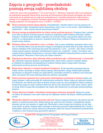 Zajęcia z geografii - przedszkolaki poznają swoją najbliższą okolicę „Gdzie jest moje nowe przedszkole?”,”Co to jest ‘preria’?”. Naturalna ciekawość dzieci jest podstawą do poznawania geografii. Illinois Early Learning and Development Benchmarks wymagają, aby dzieci orientowały się w podstawowych pojęciach geograficznych i potrafiły zlokalizować różne miejsca i obiekty w ich najbliższym otoczeniu. Poniższe sugestie mogą okazać się pomocne w dostosowaniu twojego programu do wymaganych norm: 17.A.ECa i 17.A.ECb. Dzieci powinny poznać swoją okolicę. Przedszkolaki i młodsze dzieci uczą się poprzez ob- serwowanie świata, szczególnie jeżeli rozmawiasz z nimi o tym, co was otacza. „Jaka hałaśliwa ta ciężarówka”, „Mm, czujesz zapach pieczonego chleba?” Zwracaj uwagę przedszkolaków na różne rzeczy podczas spaceru. Przygotuj listę i zabierz ją ze sobą na spacer. Podczas spaceru możesz ją uzupełniać. Jakie widzimy zwierzęta, rośliny, maszyny i budynki? Jakie dźwięki i zapachy nas otaczają? Dzieci mogą zrobić zdjęcia lub narysować to, co zapamiętały ze spaceru i pokazać swoje prace rodzicom. Mogą też namalować na ścianie swoją okolicę. Zachęcaj dzieci do mówienia o tym, co widzą. Gdy ty sama dokładnie opisujesz różne miejsca, to również dzieci uczą się zwracać uwagę na szczegóły. Już kiedy dzieci są małe dobrze jest używać określeń, które oznaczają kierunek lub położenie („nad”, „na lewo”, itd). Dzieci również muszą poznać pojęcia opisujące ukształtowanie terenu np. „pagórek”, „plaża” oraz słowa oznaczające kolory, kształty, temperaturę i wymiary. Takie określenia będą przydatne podczas wycieczek pieszych:”Skręcimy w lewo przy tym dużym drzewie”. Zaproponuj dzieciom, żeby zbierały różne przedmioty jako „dokumentację” z wycieczki np. wizytówki mijanych sklepów i przedsiębiorstw, ulotki, liście, nasiona i kamyki. Można je wkładać do sakiewek lub plastikowych torebek. Później dzieci mogą zrobić wystawę uzbieranych podczas spaceru przedmiotów. Rozmawiaj z dziećmi o różnych środkach transportu. W jaki sposób przemieszczają się ludzie, rzeczy i pomysły w naszej okolicy–koleją, samochodem, drogą wodną? Jakie pojazdy spotykamy na drogach? Dokąd one jadą? Klocki, niewielkie zabawki na kółkach oraz materiały takie, jak piasek lub woda ułatwiają dzieciom zabawy z geografią. Dzieci powinny zapoznać się z pomocami ułatwiającymi orientację w terenie takimi, jak mapy, kompas i różne przyrządy do wykonywania pomiarów. Dzieci mogą nie rozumieć jeszcze ich działania, ale dobrze jest jeżeli wcześnie zaczną uczyć się nimi posługiwać. Można umieścić laminowaną mapę na stole i pokazać dzieciom jak na niej zaznaczono rzeki, góry, miasta i główne drogi. Dzieci mogą tylko przyglądać się mapie albo skopiować ją używając przezroczystego papieru. Czytaj dzieciom książki z obrazkami zawierające elementy geografii. Mogą one zachęcić dzieci do dyskusji o tym czym różni się ich najbliższa okolica od innych, daleko położonych miejsc. Wychodź z dziećmi na spacery przez cały rok. Dzieci mogą porównywać, jak zmienia się ich okolica w różnych porach roku. Mogą wybrać np. park lub inne miejsce i szczegółowo opisać słowami, jak się ono zmienia w ciągu roku. Wycieczki w teren mogą mieć ustalony cel np. zbieranie śmieci w parku. Zadania takie rozwijają w dzieciach poczucie odpowiedzialności i troski o środowisko. (Dzieciom należy zabronić podnoszenia szkła lub ostrych metalowych przedmiotów i każdemu z nich wręczyć parę gumowych rękawic.) English Title: Neighborhood Geography with Young Children Early Learning Project 29 Children’s Research Center University of Illinois at Urbana-Champaign 51 Gerty Dr.Champaign, IL 61820-7469 Telephone: 217-333-1386Fax: 217-244-7732 Toll-free: 877-275-3227 Email: [email protected] Internet: http://illinoisearlylearning.org Illinois State Board of Education Więcej stron z poradami możesz znaleźć pod adresem http://illinoisearlylearning.org rev. 9/13