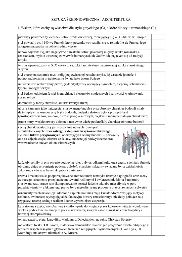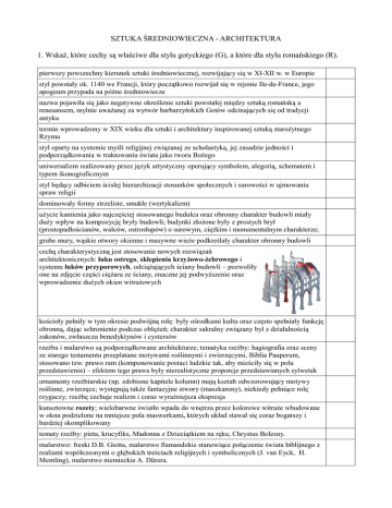 SZTUKA ŚREDNIOWIECZNA - ARCHITEKTURA 1. Wskaż, które cechy są właściwe dla stylu gotyckiego (G), a które dla stylu romańskiego (R). pierwszy powszechny kierunek sztuki średniowiecznej, rozwijający się w XI-XII w. w Europie styl powstały ok. 1140 we Francji, który początkowo rozwijał się w rejonie Ile-de-France, jego apogeum przypada na późne średniowiecze nazwa pojawiła się jako negatywne określenie sztuki powstałej między sztuką romańską a renesansem, mylnie uważanej za wytwór barbarzyńskich Gotów odcinających się od tradycji antyku termin wprowadzony w XIX wieku dla sztuki i architektury inspirowanej sztuką starożytnego Rzymu styl oparty na systemie myśli religijnej związanej ze scholastyką, jej zasadzie jedności i podporządkowania w traktowaniu świata jako tworu Bożego uniwersalizm realizowany przez język artystyczny operujący symbolem, alegorią, schematem i typem ikonograficznym styl będący odbiciem ścisłej hierarchizacji stosunków społecznych i surowości w ujmowaniu spraw religii dominowały formy strzeliste, smukłe (wertykalizm) użycie kamienia jako najczęściej stosowanego budulca oraz obronny charakter budowli miały duży wpływ na kompozycję bryły budowli; budynki złożone były z prostych brył (prostopadłościanów, walców, ostrosłupów) o surowym, ciężkim i monumentalnym charakterze; grube mury, wąskie otwory okienne i masywne wieże podkreślały charakter obronny budowli cechą charakterystyczną jest stosowanie nowych rozwiązań architektonicznych: łuku ostrego, sklepienia krzyżowo-żebrowego i systemu łuków przyporowych, odciążających ściany budowli – pozwoliły one na zdjęcie części ciężaru ze ściany, znaczne jej podwyższenie oraz wprowadzenie dużych okien witrażowych kościoły pełniły w tym okresie podwójną rolę: były ośrodkami kultu oraz często spełniały funkcję obronną, dając schronienie podczas oblężeń; charakter sakralny związany był z działalnością zakonów, zwłaszcza benedyktynów i cystersów rzeźba i malarstwo są podporządkowane architekturze; tematyka rzeźby: hagiografia oraz sceny ze starego testamentu przeplatane motywami roślinnymi i zwierzęcymi, Biblia Pauperum, stosowano tzw. prawo ram (komponowanie postaci ludzkie tak, aby mieściły się w polu przedstawienia) – efektem tego prawa były nierealistyczne proporcje przedstawianych sylwetek ornamenty rzeźbiarskie (np. zdobione kapitele kolumn) mają kształt odwzorowujący motywy roślinne, zwierzęce; występują także fantazyjne stwory (maszkarony), niekiedy pełniące rolę rzygaczy; rzeźbę cechuje realizm i coraz wyraźniejsza ekspresja kunsztowne rozety; wielobarwne światło wpada do wnętrza przez kolorowe witraże wbudowane w okna podzielone na mniejsze pola maswerkami, których układ stawał się coraz bogatszy i bardziej skomplikowany tematy rzeźby: pieta, krucyfiks, Madonna z Dzieciątkiem na ręku, Chrystus Bolesny. malarstwo: freski D.B. Giotta, malarstwo flamandzkie stanowiące połączenie świata biblijnego z realiami współczesnymi o głębokich treściach religijnych i symbolicznych (J. van Eyck, H. Memling), malarstwo niemieckie A. Dürera. 2. Przyporządkuj nazwy obrazkom: A) sklepienie krzyżowe B) sklepienie krzyżowo – żebrowe C) sklepienie kolebkowe. Wskaż, które typy sklepień występowały w stylu gotyckim, a które w romańskim. 3. Podaj nazwy wskazanych na rysunkach elementów stylu gotyckiego: sklepienie żebrowe, system łuków przyporowych, rozeta, maswerk, ostrołuk, kwiaton*. *Pinakle (inaczej fiala, sterczyna) - w architekturze gotyckiej pionowy element dekoracyjny w postaci smukłej czworobocznej wieżyczki, zakończonej od góry ostrosłupem, którego krawędzie dekorowane są żabkami i zwieńczonej kwiatonem. 4. Określ styl architektoniczny budowli przedstawionych na rysunkach.