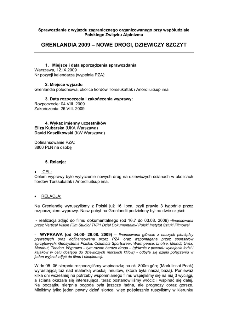 Sprawozdanie z wyjazdu zagranicznego organizowanego przy współudziale Polskiego Związku Alpinizmu GRENLANDIA 2009 – NOWE DROGI, DZIEWICZY SZCZYT 1. Miejsce i data sporządzenia sprawozdania Warszawa, 12.IX.2009 Nr pozycji kalendarza (wypełnia PZA): 2. Miejsce wyjazdu Grenlandia południowa, okolice fiordów Torssukattak i Anordliuitsup ima 3. Data rozpoczęcia i zakończenia wyprawy: Rozpoczęcie: 04.VIII. 2009 Zakończenia: 26.VIII. 2009 4. Wykaz imienny uczestników Eliza Kubarska (UKA Warszawa) David Kaszlikowski (KW Warszawa) Dofinansowanie PZA: 3800 PLN na osobę 5. Relacja: • CEL: Celem wyprawy było wytyczenie nowych dróg na dziewiczych ścianach w okolicach fiordów Torssukatak i Anordliuitsup ima. • RELACJA: Na Grenlandię wyruszyliśmy z Polski już 16 lipca, czyli prawie 3 tygodnie przez rozpoczęciem wyprawy. Nasz pobyt na Grenlandii podzielony był na dwie części: - realizacja zdjęć do filmu dokumentalnego (od 16.7 do 03.08. 2009) -finansowana przez Vertical Vision Film Studio/ TVP1 Dział Dokumentalny/ Polski Instytut Sztuki Filmowej - WYPRAWA (od 04.08- 26.08. 2009) – finansowana głównie z naszych pieniędzy prywatnych oraz dofinansowana przez PZA oraz wspomagana przez sponsorów sprzętowych: Geosystems Polska, Columbia Sportswear, Warmpeace, Lhotse, Meindl, Uvex, Marabut, Tendon. Wyprawa – tym razem bardzo droga – (głównie z powodu wynajęcia łodzi i kajaków w celu dostępu do dziewiczych morskich klifów) - odbyła się dzięki połączeniu w jeden wyjazd zdjęć do filmu i eksploracji. W dn.05- 06 sierpnia rozpoczęliśmy wspinaczkę na ok. 800m górę (Marlulissat Peak) wyrastającą tuż nad maleńką wioską Innuitów, (która była naszą bazą). Ponieważ kilka dni wcześniej na potrzeby wspomnianego filmu wspięliśmy się na nią 3 wyciągi, a ściana okazała się interesująca, teraz postanowiliśmy wrócić i wspinać się dalej. Na początku sierpnia pogoda była jeszcze ładna, ale prognozy coraz gorsze. Mieliśmy tylko jeden pewny dzień słońca, więc pośpiesznie ruszyliśmy w kierunku szczytu. Droga zaczyna się wielkim zacięciem i płytami o długości ok. 250-300 m. Płyty oferują techniczne wspinanie z wyjątkiem jednego siłowego wyciągu przez dwa okapy. Ok 22.00 byliśmy jakieś 400-500m nad wioską - 2 wyciągi ponad półką dzielącą ścianę. Znaleźliśmy maleńką półeczkę i zabiwakowaliśmy. Księżyc był w pełni, ale zaczęły się już zbierać ciężkie chmury. O świcie, zaniepokojeni zbliżającym się deszczem, ruszyliśmy dalej. (Zagrożenie deszczem było o tyle problemem, że nie mieliśmy wystarczająco sprzętu do wycofów: płacht biwakowych, ani – co oczywiste stanowisk pod sobą. Jedyną opcją było zejście z tej ściany przez szczyt do sąsiedniej doliny.) Po kilku godzinach doszliśmy do wielkiego zacięcia łączącego dwie ściany. W prawo wspinaczka była trudna i tarciowa, plus pionowa ściana z cienkimi ryskami, w lewo teren wydawał się możliwy do przejścia, nawet jeżeli za chwile spadłby deszcz. Poszliśmy tam gdzie szybciej, w lewo, przez wybitnie niebezpieczny trawers w ekspozycji - przez ruchome kolumny głazów. Na szczycie stanęliśmy ok. 16.00. Do wioski zeszliśmy tak jak planowaliśmy. (Mieszkańcy Aappillattoq przyjęli nas bardzo radośnie - okazało się, że cały czas obserwowali naszą wspinaczkę.) Niestety pogoda załamała się na kolejne dni (od 07.08 do 16.08) Padało niemal bez przerwy, a ściany były mokre. W międzyczasie udało nam się tylko zrobić rekonesans łodzią po okolicznych fiordach. Wypatrzyliśmy kolejne ciekawe ściany i czekaliśmy na lepsze prognozy. Pojawiły się dopiero tydzień przed naszym wyjazdem. 17 sierpnia z pomocą Themo (naszego gospodarza) i jego łódki podpłynęliśmy pod jeszcze mokrą ścianę w Torssukkattak fiord. (dziewiczy masyw górski upatrzyliśmy sobie już 2 lata temu podczas wyprawy na kfif Qaqarsusia) „Przypłyń po nas za 3 dni”- poprosiliśmy i zaczęliśmy się „wspinać” przez pionowe… jagody. Potem zaczęły się pojawiać progi skalne- najpierw komin, potem płyty- w tym jedna znacznie trudniejsza od innych przecięta dwoma cienkimi ryskami na alieny i małe kostki. Wieczorem poprzejsciu ok. 700m terenu nocleg w kolebie. O świcie obudziliśmy się w wilgotnej chmurze. Przed nami 500 m ściana, widoczność bardzo słaba. Postanowiliśmy wspinać się wypatrzoną z poziomu morza linią rys i kominów. W kolebie zostawiliśmy sprzęt biwakowy i prawie na lekko ruszyliśmy. Ściana była ciągle wilgotna, ale udało się przejść przez ściek i wystartowaliśmy przez małą przewieszkę. Potem pokazało się nieco słońca. Doszliśmy do ogromnego mokrego komina z zaklinowanymi głazami. („Przynajmniej będzie, z czego zjeżdżać”.) Jego prowadzenie wypadło na mnie: wspinałem się przez śliski komin (VII+R) bez asekuracji, a potem przez zaklinowane bouldery. Zaczęło padać. Po drugiej stronie fiordu niebieskie niebo, a dokładnie nad nami zatrzymała się czarna chmura. Rozpadało się bardziej. Mieliśmy jakieś 200 m do szczytu. Wspinaliśmy się jednak dalej, na przemian. Po ok godzinie przestało padać, za to zrobiło się bardzo zimno. O 21.00, po 10 wyciągach zrobionych tego dnia, stanęliśmy na szczycie. Postawiliśmy kopczyk i zaczęliśmy nocne (500m) zjazdy, podczas których musieliśmy zostawić większą część naszych taśm. Podczas zjazdu zainstalowaliśmy 2 spity. O 3.00 dojechaliśmy do półki, a następnego dnia zjeżdżaliśmy i zewspinywaliśmy się do poziomu morza. Wieczorem 3-go dnia przypłynął po nas Themo. • PODSUMOWANIE WYPRAWY: Podczas wyprawy udało nam się wytyczyć 2 nowe drogi w tym zdobyć jeden dziewiczy szczyt: - Nowa droga „2 hobbits from the moon” (700-800m, VII+ max, 23 wyciągi, 2.08III pierwsze wyciągi dla filmu; kontynuacja 5-6.08, 2 spity „filmowe” na początku drogi) - sam szczyt zdobyty wcześniej łatwym szlakiem z in