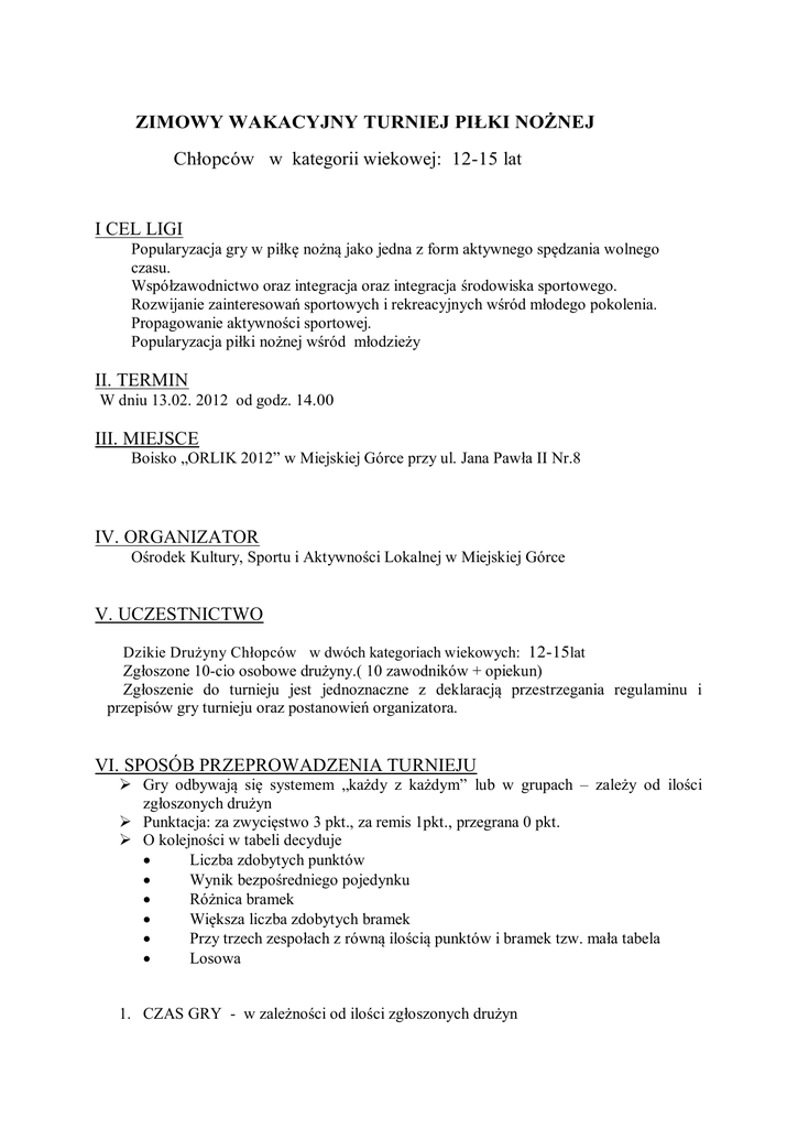 ZIMOWY WAKACYJNY TURNIEJ PIŁKI NOŻNEJ Chłopców w kategorii wiekowej: 12-15 lat I CEL LIGI Popularyzacja gry w piłkę nożną jako jedna z form aktywnego spędzania wolnego czasu. Współzawodnictwo oraz integracja oraz integracja środowiska sportowego. Rozwijanie zainteresowań sportowych i rekreacyjnych wśród młodego pokolenia. Propagowanie aktywności sportowej. Popularyzacja piłki nożnej wśród młodzieży II. TERMIN W dniu 13.02. 2012 od godz. 14.00 III. MIEJSCE Boisko „ORLIK 2012” w Miejskiej Górce przy ul. Jana Pawła II Nr.8 IV. ORGANIZATOR Ośrodek Kultury, Sportu i Aktywności Lokalnej w Miejskiej Górce V. UCZESTNICTWO Dzikie Drużyny Chłopców w dwóch kategoriach wiekowych: 12-15lat Zgłoszone 10-cio osobowe drużyny.( 10 zawodników + opiekun) Zgłoszenie do turnieju jest jednoznaczne z deklaracją przestrzegania regulaminu i przepisów gry turnieju oraz postanowień organizatora. VI. SPOSÓB PRZEPROWADZENIA TURNIEJU Gry odbywają się systemem „każdy z każdym” lub w grupach – zależy od ilości zgłoszonych drużyn Punktacja: za zwycięstwo 3 pkt., za remis 1pkt., przegrana 0 pkt. O kolejności w tabeli decyduje Liczba zdobytych punktów Wynik bezpośredniego pojedynku Różnica bramek Większa liczba zdobytych bramek Przy trzech zespołach z równą ilością punktów i bramek tzw. mała tabela Losowa 1. CZAS GRY - w zależności od ilości zgłoszonych drużyn VII. PRZEPISY GRY w załączniku VIII. NAGRODY Przewidziane są dla trzech najlepszych drużyn. IX. POSTANOWIENIA KOŃCOWE Za nieprzestrzeganie regulaminu i przepisów gry, drużyna może zostać ukarana lub zostanie wykluczona z turnieju. Karę orzeka organizator turnieju Organizator nie ponosi odpowiedzialności prawnej za skutki wypadków w czasie gry Każdy zawodnik może występować tylko w jednej drużynie biorącej udział w turnieju Do zmian niniejszego regulaminu uprawniony jest jedynie organizator Wszystkie sprawy sporne nieobjęte regulaminem rozstrzyga organizator Drużyny zobowiązane są do przedstawienia na piśmie imiennego wykazu zawodników Organizator nie zapewnia ubezpieczenia zawodników od następstw nieszczęśliwych wypadków w czasie zawodów, Organizator nie odpowiada za rzeczy pozostawione bez zabezpieczenia, Zawodnicy powinni posiadać dokument potwierdzający tożsamość, Opiekunowie drużyn proszeni są o potwierdzenie przybycia, X. INNE Dojazd zespołów na koszt własny / rodzice / Zgłoszenia drużyn do 06.02.2012 „Orlik” od wtorku – piątku w godz. 15,00-20,00, Tel. 605542408 lub e-mail:[email protected] Organizator PRZEPISY GRY I. LICZBA ZAWODNIKÓW 1. w czasie gry drużyna składa się z 6 zawodników ( w tym bramkarz) oraz do 4 zawodników rezerwowych - wiek 12-15 lat 2. gra może być rozpoczęta, gdy drużyna liczy min. czterech zawodników. Jeżeli w wyniku wykluczenia w którymkolwiek zespole pozostanie mniej niż trzech zawodników zawody należy zakończyć. 3. liczba zmian w czasie gry jest dowolna, niewymagająca przerwy w grze (dozwolone są tzw. zmiany powrotne). Zmiana bramkarza winna być dokonana tylko w przypadku, gdy piłka jest poza grą i za zgodą sędziego. 4. zmiany zawodników dokonujemy tylko w strefie zmian (wyznaczonej przez Organizatora). Zawodnik rezerwowy może wejść na boisko w strefie zmian. Nieprawidłowa zmiana może być ukarana przez sędziego karą indywidualną dla zawodnika wchodzącego. II. UBIÓR ZAWODNIKA 1. Zawodnicy zobowiązani są występować w strojach sportowych, w obuwiu przeznaczonym do piłki nożnej ( nie wolno w wkrętach) 2. Zawodnik nie może mieć na sobie w czasie gry niczego, co mogłoby zagrażać bezpieczeństwu innych zawodników III. GRA NIEDOZWOLONA I NIEWŁAŚCIWE ZACHOWANIE Obowiązują postanowienia PZPN zgodnie z przepisami gry w piłkę nożną z następującymi zmianami: zawodnik winien być napomniany gdy: uporczywie naruszy przepisy gry okazuje czynne lub słowne niezadowolenie z decyzji sędziego zachowuje się nie sportowo dokona niewłaściwej zmiany zawodnik zostaje wykluczony z gry, jeżeli: zachowuje się rażąco nie sportowo, w sposób brutalny używa obelżywych słów będąc napomnianym po raz kolejny przekracza przepisy gry lub zachowuje się w sposób nie sportowy w przypadku napomnień lub wykluczeń sędzia oprócz kar indywidualnych zarządza rzut wolny pośredni przeciw drużynie, której zawodnik przewinił IV. KARY INDYWIDUALNE 1. stosuje się następujące kary indywidualne: napomnienie słowne wykluczenie- 1 minuta wykluczenie-2 minuty czerwona kartka 2. zawodnik ukarany karą minutową, w przypadku utraty bramki przez jego zespół może wejść na boisko przed upływem kary. Zawodnik ukarany czerwoną kartką zostaje wykluczony z gry do końca meczu, a drużyna gra w osłabieniu przez dwie minuty 3. ewentualną wyższą karę indywidualną lub zespołową orzeka Komisja Turnieju V. RZUT KARNY Rzut karny wykonuje się z odległości 9 metrów od bramki. VI. WRZUT Wznowienie z autu - nogą Wznowienie od bramki - nogą Organizator