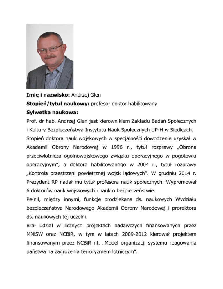 Imię i nazwisko: Andrzej Glen Stopień/tytuł naukowy: profesor doktor