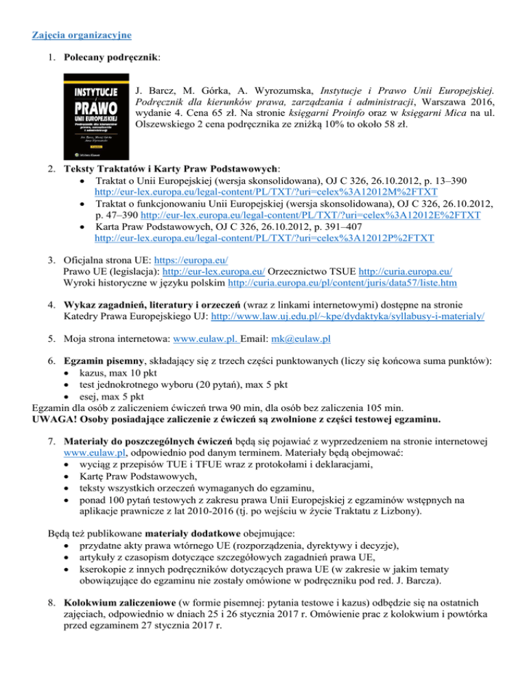 Zajęcia organizacyjne 1. Polecany podręcznik: J. Barcz, M. Górka, A. Wyrozumska, Instytucje i Prawo Unii Europejskiej. Podręcznik dla kierunków prawa, zarządzania i administracji, Warszawa 2016, wydanie 4. Cena 65 zł. Na stronie księgarni Proinfo oraz w księgarni Mica na ul. Olszewskiego 2 cena podręcznika ze zniżką 10% to około 58 zł. 2. Teksty Traktatów i Karty Praw Podstawowych: Traktat o Unii Europejskiej (wersja skonsolidowana), OJ C 326, 26.10.2012, p. 13–390 http://eur-lex.europa.eu/legal-content/PL/TXT/?uri=celex%3A12012M%2FTXT Traktat o funkcjonowaniu Unii Europejskiej (wersja skonsolidowana), OJ C 326, 26.10.2012, p. 47–390 http://eur-lex.europa.eu/legal-content/PL/TXT/?uri=celex%3A12012E%2FTXT Karta Praw Podstawowych, OJ C 326, 26.10.2012, p. 391–407 http://eur-lex.europa.eu/legal-content/PL/TXT/?uri=celex%3A12012P%2FTXT 3. Oficjalna strona UE: https://europa.eu/ Prawo UE (legislacja): http://eur-lex.europa.eu/ Orzecznictwo TSUE http://curia.europa.eu/ Wyroki historyczne w języku polskim http://curia.europa.eu/pl/content/juris/data57/liste.htm 4. Wykaz zagadnień, literatury i orzeczeń (wraz z linkami internetowymi) dostępne na stronie Katedry Prawa Europejskiego UJ: http://www.law.uj.edu.pl/~kpe/dydaktyka/syllabusy-i-materialy/ 5. Moja strona internetowa: www.eulaw.pl. Email: [email protected] 6. Egzamin pisemny, składający się z trzech części punktowanych (liczy się końcowa suma punktów): kazus, max 10 pkt test jednokrotnego wyboru (20 pytań), max 5 pkt esej, max 5 pkt Egzamin dla osób z zaliczeniem ćwiczeń trwa 90 min, dla osób bez zaliczenia 105 min. UWAGA! Osoby posiadające zaliczenie z ćwiczeń są zwolnione z części testowej egzaminu. 7. Materiały do poszczególnych ćwiczeń będą się pojawiać z wyprzedzeniem na stronie internetowej www.eulaw.pl, odpowiednio pod danym terminem. Materiały będą obejmować: wyciąg z przepisów TUE i TFUE wraz z protokołami i deklaracjami, Kartę Praw Podstawowych, teksty wszystkich orzeczeń wymaganych do egzaminu, ponad 100 pytań testowych z zakresu prawa Unii Europejskiej z egzaminów wstępnych na aplikacje prawnicze z lat 2010-2016 (tj. po wejściu w życie Traktatu z Lizbony). Będą też publikowane materiały dodatkowe obejmujące: przydatne akty prawa wtórnego UE (rozporządzenia, dyrektywy i decyzje), artykuły z czasopism dotyczące szczegółowych zagadnień prawa UE, kserokopie z innych podręczników dotyczących prawa UE (w zakresie w jakim tematy obowiązujące do egzaminu nie zostały omówione w podręczniku pod red. J. Barcza). 8. Kolokwium zaliczeniowe (w formie pisemnej: pytania testowe i kazus) odbędzie się na ostatnich zajęciach, odpowiednio w dniach 25 i 26 stycznia 2017 r. Omówienie prac z kolokwium i powtórka przed egzaminem 27 stycznia 2017 r.