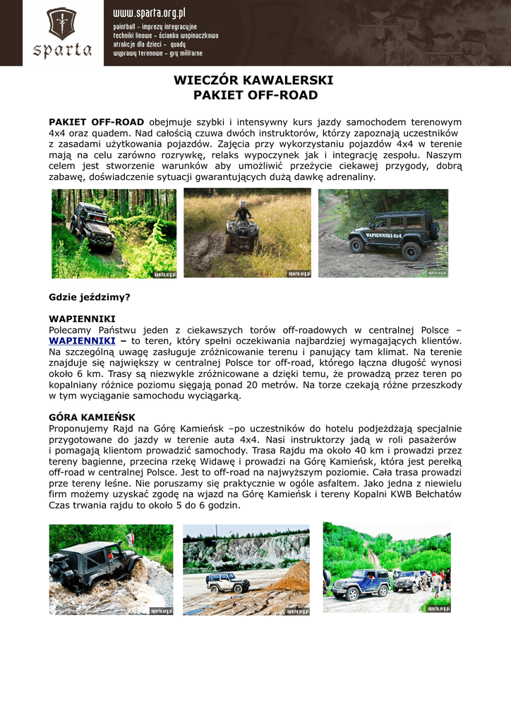 WIECZÓR KAWALERSKI PAKIET OFF-ROAD PAKIET OFF-ROAD obejmuje szybki i intensywny kurs jazdy samochodem terenowym 4x4 oraz quadem. Nad całością czuwa dwóch instruktorów, którzy zapoznają uczestników z zasadami użytkowania pojazdów. Zajęcia przy wykorzystaniu pojazdów 4x4 w terenie mają na celu zarówno rozrywkę, relaks wypoczynek jak i integrację zespołu. Naszym celem jest stworzenie warunków aby umożliwić przeżycie ciekawej przygody, dobrą zabawę, doświadczenie sytuacji gwarantujących dużą dawkę adrenaliny. Gdzie jeździmy? WAPIENNIKI Polecamy Państwu jeden z ciekawszych torów off-roadowych w centralnej Polsce – WAPIENNIKI – to teren, który spełni oczekiwania najbardziej wymagających klientów. Na szczególną uwagę zasługuje zróżnicowanie terenu i panujący tam klimat. Na terenie znajduje się największy w centralnej Polsce tor off-road, którego łączna długość wynosi około 6 km. Trasy są niezwykle zróżnicowane a dzięki temu, że prowadzą przez teren po kopalniany różnice poziomu sięgają ponad 20 metrów. Na torze czekają różne przeszkody w tym wyciąganie samochodu wyciągarką. GÓRA KAMIEŃSK Proponujemy Rajd na Górę Kamieńsk –po uczestników do hotelu podjeżdżają specjalnie przygotowane do jazdy w terenie auta 4x4. Nasi instruktorzy jadą w roli pasażerów i pomagają klientom prowadzić samochody. Trasa Rajdu ma około 40 km i prowadzi przez tereny bagienne, przecina rzekę Widawę i prowadzi na Górę Kamieńsk, która jest perełką off-road w centralnej Polsce. Jest to off-road na najwyższym poziomie. Cała trasa prowadzi prze tereny leśne. Nie poruszamy się praktycznie w ogóle asfaltem. Jako jedna z niewielu firm możemy uzyskać zgodę na wjazd na Górę Kamieńsk i tereny Kopalni KWB Bełchatów Czas trwania rajdu to około 5 do 6 godzin. Nasze pojazdy – Quad Polaris Sportsman 500 /wynajmowany na godziny/ – Quady Yamaha Grizzly /wynajmowany na cały dzień/ – Samochód terenowy 4 x4 /wynajmowany na godziny/ Do samochodu wchodzą 3-4 osoby oraz instruktor. Cena pakietu off-road dla 10 osób wynosi 110 zł/ osobę Zawiera ona: • jazdę samochodem terenowym oraz quadem na torze off-roadowym Wapiennikach przez 2 godziny gdzie każdy będzie mógł spróbować swoich sił, • korzystanie z miejsca ogniskowego i grilla na wyłączność, • ubezpieczenie NNW, • ognisko z kiełbaskami. Cena pakietu off-road dla 10 osób wynosi 535 zł/osobę Zawiera ona: • wjazd na Górę Kamieńsk, • jazdę 3 samochodami terenowymi, • organizację rajdu, • ubezpieczenie NNW, • ognisko z kiełbaskami. Istnieje możliwość wynajęcia pojazdów na godziny: Quad Polaris Sportsman 1 h – 160 zł Każda kolejna godzina – 150 zł Quady Yamaha Grizzly wynajmowane są tylko i wyłącznie na cały dzień Koszt wynajęcia 800 zł. Jazda samochodem terenowym 1 h – 250 zł Każda kolejna godzina – 200 zł w