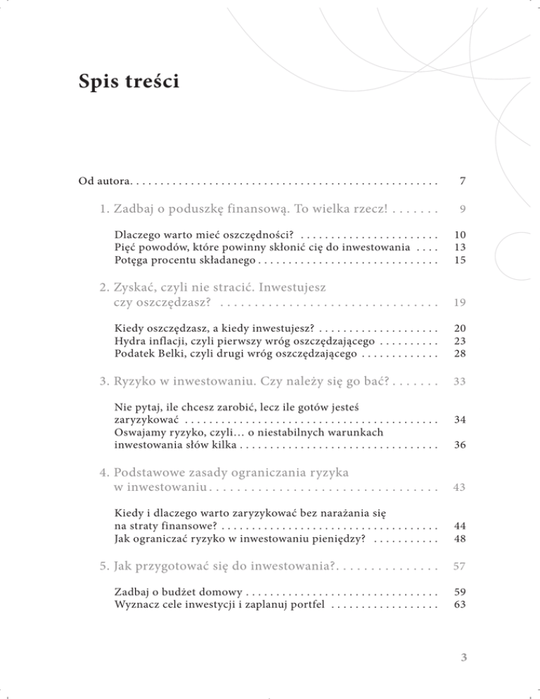 Spis treści Od autora. . . . . . . . . . . . . . . . . . . . . . . . . . . . . . . . . . . . . . . . . . . . . . . . . . . 7 1. Zadbaj o poduszkę finansową. To wielka rzecz! . . . . . . . 9 Dlaczego warto mieć oszczędności? . . . . . . . . . . . . . . . . . . . . . . . Pięć powodów, które powinny skłonić cię do inwestowania . . . . Potęga procentu składanego . . . . . . . . . . . . . . . . . . . . . . . . . . . . . . 10 13 15 2. Zyskać, czyli nie stracić. Inwestujesz czy oszczędzasz? . . . . . . . . . . . . . . . . . . . . . . . . . . . . . . . . 19 Kiedy oszczędzasz, a kiedy inwestujesz? . . . . . . . . . . . . . . . . . . . . Hydra inflacji, czyli pierwszy wróg oszczędzającego . . . . . . . . . . Podatek Belki, czyli drugi wróg oszczędzającego . . . . . . . . . . . . . 20 23 28 3. Ryzyko w inwestowaniu. Czy należy się go bać? . . . . . . . 33 Nie pytaj, ile chcesz zarobić, lecz ile gotów jesteś zaryzykować . . . . . . . . . . . . . . . . . . . . . . . . . . . . . . . . . . . . . . . . . . Oswajamy ryzyko, czyli… o niestabilnych warunkach inwestowania słów kilka . . . . . . . . . . . . . . . . . . . . . . . . . . . . . . . . . 34 36 4. Podstawowe zasady ograniczania ryzyka w inwestowaniu . . . . . . . . . . . . . . . . . . . . . . . . . . . . . . . . . 43 Kiedy i dlaczego warto zaryzykować bez narażania się na straty finansowe? . . . . . . . . . . . . . . . . . . . . . . . . . . . . . . . . . . . . Jak ograniczać ryzyko w inwestowaniu pieniędzy? . . . . . . . . . . . 44 48 5. Jak przygotować się do inwestowania?. . . . . . . . . . . . . . . 57 Zadbaj o budżet domowy . . . . . . . . . . . . . . . . . . . . . . . . . . . . . . . . Wyznacz cele inwestycji i zaplanuj portfel . . . . . . . . . . . . . . . . . . 59 63 3 6. Wszystko, co chciałbyś wiedzieć o lokatach bankowych . . . . . . . . . . . . . . . . . . . . . . . . . . . . . . . . . . . . 69 Czym różnią się między sobą lokaty bankowe? . . . . . . . . . . . . . . . Od czego zależy oprocentowanie lokat? . . . . . . . . . . . . . . . . . . . . Jakie błędy w wyborze lokat popełniamy najczęściej? . . . . . . . . . Jakie „lokatowe” sztuczki stosują banki? . . . . . . . . . . . . . . . . . . . . Konto oszczędnościowe zamiast lokaty? . . . . . . . . . . . . . . . . . . . . 70 72 74 76 78 7. Obligacje skarbowe, czyli pożycz rządowi . . . . . . . . . . . . 81 Wstęp do inwestowania w obligacje . . . . . . . . . . . . . . . . . . . . . . . Kupujemy obligacje skarbowe . . . . . . . . . . . . . . . . . . . . . . . . . . . . Obligacje nie tylko skarbowe . . . . . . . . . . . . . . . . . . . . . . . . . . . . . 82 87 91 8. Wybrane formy inwestowania na rynku kapitałowym . . . . . . . . . . . . . . . . . . . . . . . . . . . . . . . . . . . 95 Fundusze inwestycyjne . . . . . . . . . . . . . . . . . . . . . . . . . . . . . . . . . . Polisy ubezpieczeniowe typu inwestycyjnego (tzw. unit-linki) . . . . . . . . . . . . . . . . . . . . . . . . . . . . . . . . . . . . . . . Produkty strukturyzowane . . . . . . . . . . . . . . . . . . . . . . . . . . . . . . . Inwestycje indeksowe – ETF. . . . . . . . . . . . . . . . . . . . . . . . . . . . . . Akcje . . . . . . . . . . . . . . . . . . . . . . . . . . . . . . . . . . . . . . . . . . . . . . . . 96 103 112 117 118 9. Czy ubezpieczenie może być inwestycją?. . . . . . . . . . . . . 123 Sprawdź, co masz w polisie . . . . . . . . . . . . . . . . . . . . . . . . . . . . . . 124 Czy warto traktować polisę z funduszem jako inwestycję? . . . . . 127 10. ABC funduszy inwestycyjnych . . . . . . . . . . . . . . . . . . . . . 129 Czym różnią się od siebie fundusze? . . . . . . . . . . . . . . . . . . . . . . . Rodzaje funduszy . . . . . . . . . . . . . . . . . . . . . . . . . . . . . . . . . . . . . . Ile kosztuje inwestycja w fundusz? . . . . . . . . . . . . . . . . . . . . . . . . . Jak wybrać dla siebie fundusz? . . . . . . . . . . . . . . . . . . . . . . . . . . . Cztery dylematy początkującego klienta funduszy . . . . . . . . . . . Jak założyć rejestr w funduszu? . . . . . . . . . . . . . . . . . . . . . . . . . . . 4 www.samosedno.com.pl 130 135 148 151 153 154 11. Dlaczego warto inwestować nie tylko w Polsce? . . . . . . . 159 Przegląd atrakcyjnych rynków zagranicznych . . . . . . . . . . . . . . . 161 Jak inwestować za granicą? . . . . . . . . . . . . . . . . . . . . . . . . . . . . . . 165 12. Zanim pójdziesz z pieniędzmi na giełdę . . . . . . . . . . . . . 171 Jak pracuje giełda?. . . . . . . . . . . . . . . . . . . . . . . . . . . . . . . . . . . . . . Jak sprzedać lub kupić akcje? . . . . . . . . . . . . . . . . . . . . . . . . . . . . . Indeksy giełdowe . . . . . . . . . . . . . . . . . . . . . . . . . . . . . . . . . . . . . . Jak kupić akcje na tzw. rynku pierwotnym? . . . . . . . . . . . . . . . . . 172 174 175 177 13. Jak wybrać dla siebie spółkę? . . . . . . . . . . . . . . . . . . . . . . 181 Złote zasady początkującego inwestora . . . . . . . . . . . . . . . . . . . . 183 Rozstrzygamy pierwsze dylematy. . . . . . . . . . . . . . . . . . . . . . . . . . 186 Kryteria wyboru spółki . . . . . . . . . . . . . . . . . . . . . . . . . . . . . . . . . . 189 14. Analiza fundamentalna i techniczna. Emocje i rozum na giełdzie . . . . . . . . . . . . . . . . . . . . . . . . . . . . . . . . . . . . . 195 Metody wyceny spółek giełdowych . . . . . . . . . . . . . . . . . . . . . . . . 196 Podstawy analizy fundamentalnej, czyli ile warta jest złotówka . . . . . . . . . . . . . . . . . . . . . . . . . . . . . . . . . . . . . . . . . . . . . 198 Emocje na giełdzie, czyli analiza wykresów . . . . . . . . . . . . . . . . . 202 15. Krótki przegląd inwestycji alternatywnych . . . . . . . . . . . 215 Fundusze inwestycyjne typu hedge . . . . . . . . . . . . . . . . . . . . . . . . . Złoto i inne kruszce . . . . . . . . . . . . . . . . . . . . . . . . . . . . . . . . . . . . Nieruchomości . . . . . . . . .