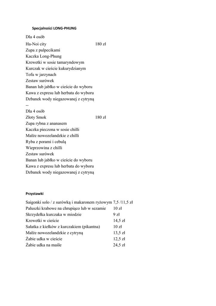 Specjalności LONG-PHUNG Dla 4 osób Ha-Noi city 180 zł Zupa z pulpecikami Kaczka Long-Phung Krewetki w sosie tamaryndowym Kurczak w cieście kukurydzianym Tofu w jarzynach Zestaw surówek Banan lub jabłko w cieście do wyboru Kawa z expresu lub herbata do wyboru Dzbanek wody niegazowanej z cytryną -Dla 4 osób Złoty Smok 180 zł Zupa rybna z ananasem Kaczka pieczona w sosie chilli Małże nowozelandzkie z chilli Ryba z porami i cebulą Wieprzowina z chilli Zestaw surówek Banan lub jabłko w cieście do wyboru Kawa z expresu lub herbata do wyboru Dzbanek wody niegazowanej z cytryną Przystawki Saigonki solo / z surówką i makaronem ryżowym 7,5 /11,5 zł Paluszki krabowe na chrupiąco lub w sezamie 10 zł Skrzydełka kurczaka w miodzie 9 zł Krewetki w cieście 14,5 zł Sałatka z kiełków z kurczakiem (pikantna) 10 zł Małże nowozelandzkie z cytryną 13,5 zł Żabie udka w cieście 12,5 zł Żabie udka na maśle 24,5 zł Zupy Zupa Long-Phung 11,5 zł Zupa Szefowej 10 zł Zupa wonton 10 zł Zupa po pekińsku 10 zł Zupa rybna z ananasem (ostra) 8,5 zł Zupa z krabów lub z owoców morza 10 zł Zupa z krewetkami koktajlowymi 10 zł Zupa krem z kurczaka 9 zł Zupa z makaronem ryżowym i rybą lub pulpecikami wieprzowymi 9,5 zł Zupa z makaronem sojowym lub ryżowym i kurczakiem 7,5 zł Zupa z makaronem sojowym lub ryżowym i wołowiną 8,5 zł Dania z kaczki Kaczka LONG-PHUNG 30 zł Kaczka po tajsku 30 zł Kaczka pieczona w sosie pikantnym lub z owocami 30 zł Dania z indyka Udziec z indyka gotowany na parze 22 zł Udziec z indyka pieczony na gorącym półmisku 22 zł Udziec z indyka duszony z lotosem w kociołku 25 zł Wątróbka z indyka z ananasem 15,5 zł Wątróbka z indyka na chrupiąco 15,5 zł Wątróbka z indyka z cebulą 15,5 zł Dania z kurczaka Kurczak na chrupiąco z sosem (słodko-kwaśny lub pikantny) 17,5 zł Kurczak po syczuańsku (ostry) 18,5 zł Kurczak z bambusem i grzybami Mun-poko 18 zł Kurczak w cieście migdałowym 19,5 zł Kurczak Kung-pao 17,5 zł Kurczak w sosie curry 17,5 zł Kurczak z czosnkiem na maśle 17 zł Kurczak „5 smaków” 18 zł Filet z kurczaka w jarzynach na parze Polędwiczki sauté z orzechami nerkowca Udko kurczaka na gorącym półmisku Udko kurczaka Long-Phung Dania z wieprzowiny Wieprzowina LONG-PHUNG 19 zł Wieprzowina z grzybami i bambusem 18,5 zł Wieprzowina po tajsku 19 zł Wieprzowina prażona z chilli 18,5 zł Wieprzowina z fasolką płaskostrąkową lub brokułami 17,5 zł Polędwica wieprzowa z orzechami nerkowca 24 zł Polędwica wieprzowa w jarzynach na parze 23,5 zł Karkówka na gorącym półmisku 19,5 zł Pulpety wieprzowe w sosie grzybowym 19,5 zł Żeberka w sosie chilli 21 zł Żeberka pieczone w sosie tamardyndowym 21 zł Golonka Long-Phung 24 zł Golonka w sosie pikantnym 24 zł Dania z wołowiny Polędwica LONG-PHUNG 49,5 zł Polędwica Szefa kuchni 48 zł Wołowina z warzywami 21 zł Wołowina z porami i selerem naciowym 21 zł Wołowina z chili i trawą cytrynową 22,5 zł Wołowina z fasolką płasko strąkową 21 zł Wołowina z brokułami 21 zł Befsztyk wołowy 30 zł Dania z cielęciny Cielęcina w sosie „5 smaków” 25 zł Cielęcina na parze w sosie cytrynowym 27 zł Stek cielęcy na gorącym półmisku 32 zł 17 zł 18,5 zł 17 zł 18,5 zł Dania z owoców morza Krewetki w cieście sezamowym lub w chrupiącej panierce 29,5 zł Krewetki w sosie pikantnym lub słodko-kwaśnym 29,5 zł Krewetki na maśle 30 zł Węgorz z trawą cytrynową i chili 35 zł Węgorz na parze 35 zł Ośmiornice w sosie pikantnym 22,5 zł Żabie udka w sosie curry 24,5 zł Kalmary w jarzynach 25 zł Kalmary na chrupiąco 25 zł Małże w sosie pikantnym lub sosie tamaryndowym 25,5 zł Małże w jarzynach lub sosie cytrynowym 25,5 zł Owoce morza z chili lub cebulą i selerem naciowym 22,5 zł Dania z ryb Ryba z czosnkiem na maśle 15,5 zł Ryba z porami i selerem naciowym 15,5 zł Łosoś Long-Phung 27 zł Łosoś w sosie cytrynowym lub na maśle 26,5 zł Łosoś lub halibut na parze 26,5 zł Halibut w sosie warzywnym 26,5 zł Pstrąg na chrupiąco na maśle lub w sosie chili 20,5 zł Dania z tofu Tofu w sosie pomidorowym 14 zł Tofu w sosie curry 15 zł Tofu po syczuańsku 16,5 zł Tofu smażone z kiełkami 15 zł Dania warzywne Bakłażan w sosie chilli 17,5 zł Cukinia faszerowana 17,5 zł Fasola płasko strąkowa z czosnkiem 13,5 zł Brokuły smażone z pomidorami i czosnkiem 13,5 zł Warzywa smażone w stylu Hoi An Kiełki smażone 13,5 zł 14 zł Makaron i ryż RYŻ SMAŻONY (do wyboru) z kurczakiem 14,5 zł z wieprzowiną 14,5 zł z wołowiną 17 zł z krewetkami koktajlowymi 17,5 zł z warzywami 13 zł -MAKARON CHIŃSKI SMAŻONY (do wyboru) z kurczakiem 14,5 zł z wieprzowiną 14 zł z wołowiną 17 zł z krewetkami koktajlowymi 17,5 zł z kaczką 18 zł z warzywami 13 zł -MAKARON SOJOWY SMAŻONY (do wyboru) z kurczakiem 14,5 zł z wieprzowiną 14,5 zł z wołowiną 17 zł z krewetkami koktajlowymi 17,5 zł z warzywami 13,5 zł Surówki Surówka z białej kapusty 4 zł Surówka z marchwi 4 zł Surówka z ogórków konserwowych 5 zł Surówka z ogórków pikantna 5 zł Surówka z kiełków 6 zł Surówka z bambusa pikantna 6 zł Surówka z czerwonej kapusty 5 zł Zestaw surówek do wyboru (3 rodzaje) 7,5 zł Dodatki Ryż biały 2,5 zł Makaron sojowy gotowany 5 zł Ryż żółty z czosnkiem 5 zł Makaron chiński gotowany 5 zł Frytki 5,5 zł Desery Banan w cieście 6 zł Ananas w cieście 6 zł Jabłko w cieście 6 zł Lody z bitą śmietaną 10 zł Banan pieczony w sosie kakaowym 7 zł Lody w cieście 5 zł Sałatka owocowa z bitą śmietaną 10 zł