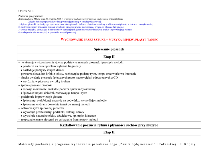 Obszar VIII. Podstawa programowa: Rozporządzenie MEN z dnia 23 grudnia 2008 r. w sprawie podstawy programowej wychowania przedszkolnego Dziecko kończące przedszkole i rozpoczynające naukę w szkole podstawowej: 1) śpiewa piosenki z dziecięcego repertuaru oraz łatwe piosenki ludowe; chętnie uczestniczy w zbiorowym śpiewie, w tańcach i muzykowaniu; 2) dostrzega zmiany dynamiki, tempa i wysokości dźwięku utworu muzycznego, wyraża je, pląsając lub tańcząc; 3) tworzy muzykę, korzystając z instrumentów perkusyjnych (oraz innych przedmiotów), a także improwizuje ją ruchem; 4) w skupieniu słucha muzyki, w tym także muzyki poważnej. WYCHOWANIE PRZEZ SZTUKĘ – MUZYKA I ŚPIEW, PLĄSY I TANIEC Śpiewanie piosenek Etap II wykonuje ćwiczenia emisyjne na podstawie znanych piosenek i prostych melodii powtarza za nauczycielem wybrane fragmenty naśladuje pomysły innych dzieci powtarza słowa lub krótkie teksty, zachowując podany rytm, tempo oraz właściwą intonację słucha uważnie piosenek śpiewanych przez nauczyciela i odtwarzanych z CD wyróżnia w piosence zwrotkę i refren śpiewa poznane piosenki rozwija możliwości wokalne poprzez śpiew indywidualny śpiewa z innymi dziećmi, zachowując tempo i rytm podejmuje improwizacje głosem śpiewa np. o ulubionej zabawie na podwórku, wymyślając melodię śpiewa na wybrany dowolnie temat do znanej melodii odtwarza rytm śpiewanej piosenki wykonuje proste ruchy: podskoki, skłony, obroty wywołuje naturalne efekty dźwiękowe, np. tupie, klaszcze rozpoznaje znane piosenki po usłyszeniu fragmentów melodii Kształtowanie poczucia rytmu i płynności ruchów przy muzyce Etap II 1 Materiały pochodzą z programu wychowania przedszkolnego „Zanim będę uczniem”E.Tokarskiej i J. Kopały Obszar VIII. umie ustawić się w dwóch kołach, szeregu, parach, luźnej grupie na umówioną melodię potrafi właściwie reagować ruchem na zmianę tempa, dynamiki i wysokości dźwięku, np. przechodzi z biegu do podskoków, z chodzenia na palcach do chodzenia na piętach uczestniczy aktywnie w zabawach przy akompaniamencie muzycznym potrafi przedstawiać ruchem treść piosenek powtarza rytmiczne ruchy improwizowane przez inne dziecko wykonuje improwizacje ruchowe na podany temat naśladuje ruchem postaci, czynności, rzeczy Poznawanie sposobów wykorzystania instrumentów muzycznych Etap II rozpoznaje i nazywa instrumenty perkusyjne, np.: bębenek, tamburyn, trójkąt, kołatka umie zagrać na wybranym instrumencie perkusyjnym naśladuje przy pomocy instrumentów znane odgłosy, np. wiatru, deszczu wybrzmiewa rytm muzyki i piosenek na instrumentach i przyborach, w tym wykonanych samodzielnie, np. butelka plastikowa z piaskiem, metalowa puszka z fasolą podejmuje w swobodnych zabawach improwizacje instrumentalno-muzyczne Wyrabianie wrażliwości muzycznej Etap II różnicuje natężenie dźwięków z otoczenia: ciszę i hałas rozpoznaje rejestry dźwięku: wysoki, średni i niski określa w muzyce tempo: szybkie, średnie i wolne odróżnia dynamikę o różnym natężeniu (głośno, cicho, średnio) oraz o natężeniu stopniowanym (coraz ciszej, coraz głośniej) rozróżnia dźwięki kilku instrumentów, np. fl etu, pianina, grzechotki, dzwonków potrafi określić charakter muzyki (wesoła, skoczna, smutna) słucha z uwagą muzyki instrumentalnej z nagrań i na przedszkolnych koncertach 2 Materiały pochodzą z programu wychowania przedszkolnego „Zanim będę uczniem”E.Tokarskiej i J. Kopały Obszar VIII. Odtwarzanie prostych układów tanecznych Etap II odtwarza proste formy taneczne, bazując na kroku podstawowym, np. krok dosuwany, przytup, naprzemienne wysuwanie stóp do przodu, dosuwanie nogi do nogi w miejscu uczestniczy w okolicznościowych inscenizacjach muzycznych wykonuje proste układy taneczne, np. taniec ludowy „Grozik” (Poszło dziewczę po ziele) Sposoby realizacji: śpiewnie piosenek – jest najbliższą dzieciom formą ekspresji muzycznej, kształtującą ich muzykalność, ćwiczącą słuch i pamięć. Piosenka powinna towarzyszyć w różnych sytuacjach czynnościowych, pełni funkcję uspakajającą i wyciszającą; zabawy rytmiczne ze śpiewem – polegają na odtwarzaniu rytmu śpiewanej piosenki za pomocą prostych elementów ruchu: podskoków, klaskania, tupania, skłonów. Wykorzystujemy nich piosenki o wyraźnym, prostym rytmie i łatwej do zapamiętania melodii; zabawy rytmiczne przy akompaniamencie – polegają na podporządkowaniu ruchu muzyce: bez podpowiedzi dzieci rozpoznają, co przy muzyce można wykonać, np. marsz, bieg, podskoki; zabawy ruchowo – muzyczno – słowne prowadzone metodą Karola Orffa – wywołują ekspresję i rozwijają inwencję twórczą poprzez powiązanie ruchu z muzyką, grę na instrumentach i śpiewanie piosenek. W proponowanych ćwiczeniach muzyka, ruch oraz żywe słowo uzupełniają się wzajemnie, ale w konkretnych działaniach dominuje zwykle jeden z wymienionych elementów, inne zaś odgrywają rolę towarzyszącą; opracowywanie opowieści muzycznych – na podstawie tekstów literackich, scenek rodzajowych czy teatrzyków, z wykorzystaniem instrumentów muzycznych i przyborów akustycznych – rozwijają pomysłowość i aktywną, twórczą postawę dzieci; nauka tańca – usprawnia ruchowo, kształtuje umiejętność wyodrębniania części piosenek i innych utworów, a także zauważania powtórzeń, podobieństw i kontrastów; nauka tańca ludowego – ćwiczy pamięć muzyczno-ruchową poprzez zapamiętywanie figur i układów tanecznych; 3 Materiały pochodzą z programu wychowania przedszkolnego „Zanim będę uczniem”E.Tokarskiej i J. Kopały Obszar VIII. gra na instrumentach perkusyjnych, w tym wygrywanie rytmów i melodii – zapoznaje dzieci z brzmieniem instrumentów, uczy sposobu wygrywania dźwięków i ich różnicowania. Samodzielne muzykowanie rozwija wyobraźnię muzyczną i inwencję twórczą; słuchanie utworów muzycz