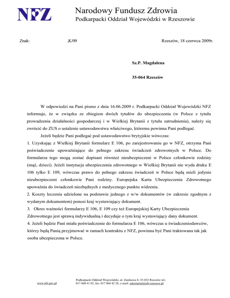 Narodowy Fundusz Zdrowia Podkarpacki Oddział Wojewódzki w Rzeszowie Znak: Rzeszów, 18 czerwca 2009r. ,K/09 Sz.P. Magdalena 35-064 Rzeszów W odpowiedzi na Pani pismo z dnia 16.06.2009 r. Podkarpacki Oddział Wojewódzki NFZ informuje, że w związku ze zbiegiem dwóch tytułów do ubezpieczenia (w Polsce z tytułu prowadzenia działalności gospodarczej i w Wielkiej Brytanii z tytułu zatrudnienia), należy się zwrócić do ZUS o ustalenie ustawodawstwa właściwego, któremu powinna Pani podlegać. Jeżeli będzie Pani podlegać pod ustawodawstwo brytyjskie wówczas: 1. Uzyskując z Wielkiej Brytanii formularz E 106, po zarejestrowaniu go w NFZ, otrzyma Pani poświadczenie upoważniające do pełnego zakresu świadczeń zdrowotnych w Polsce. Do formularza tego mogą zostać dopisani również nieubezpieczeni w Polsce członkowie rodziny (mąż, dzieci). Jeżeli instytucja ubezpieczenia zdrowotnego w Wielkiej Brytanii nie wyda druku E 106 tylko E 109, wówczas prawo do pełnego zakresu świadczeń w Polsce będą mieli jedynie nieubezpieczeni członkowie Pani rodziny. Europejska Karta Ubezpieczenia Zdrowotnego upoważnia do świadczeń niezbędnych z medycznego punktu widzenia. 2. Koszty leczenia udzielone na podstawie jednego z w/w dokumentów (w zakresie zgodnym z wydanym dokumentem) ponosi kraj wystawiający dokument. 3. Okres ważności formularzy E 106, E 109 czy też Europejskiej Karty Ubezpieczenia Zdrowotnego jest sprawą indywidualną i decyduje o tym kraj wystawiający dany dokument. 4. Jeżeli będzie Pani miała poświadczenie do formularza E 106, wówczas u świadczeniodawców, którzy będą Panią przyjmować w ramach kontraktu z NFZ, powinna być Pani traktowana tak jak osoba ubezpieczona w Polsce. www.nfz.gov.pl Podkarpacki Oddział Wojewódzki, ul. Zamkowa 8, 35-032 Rzeszów tel.: 017 860 41 02, fax: 017 860 42 28, e-mail: [email protected] 5. Jeżeli uzyska Pani z Wielkiej Brytanii jedynie Europejską Kartę Ubezpieczenia Zdrowotnego, wówczas za świadczenia wykonane w trybie planowym (w tym badania profilaktyczne) będzie musiała Pani zapłacić. Osoba ubezpieczona w jednym z krajów UE/EOG, chcąc skorzystać z planowego leczenia w innym kraju, może się starać o wydanie zgody na to leczenie - formularz E 112. Kraj wystawiający E 112 określa kryteria niezbędne do wydania tego druku. 6. Jeżeli posiadając jedynie Europejską Kartę Ubezpieczenia Zdrowotnego otrzyma Pani rachunek za planowe leczenie w Polsce, należy się zwrócić do brytyjskiej instytucji ubezpieczenia zdrowotnego z zapytaniem, czy może się Pani starać o zwrot tych kosztów. 7. Podstawa prawna: - Rozporządzenie Rady (EWG) nr 1408/71 w sprawie stosowania systemów zabezpieczenia społecznego do pracowników najemnych, osób prowadzących działalność na własny rachunek i do członków ich rodzin przemieszczających się we Wspólnocie. - Rozporządzenie Rady (EWG) nr 574/72 z dnia 21 marca 1972 r. w sprawie wykonywania rozporządzenia (EWG) nr 1408/71 w sprawie stosowania systemów zabezpieczenia społecznego do pracowników najemnych, osób prowadzących działalność na własny rachunek i do członków ich rodzin przemieszczających się we Wspólnocie. W sprawach dotyczących możliwości uzyskania formularzy E 106, E 109, E 112 czy też ewentualnego zwrotu kosztów należy się zwrócić do brytyjskiej instytucji: The Pension Service, Tyneview Park, Medical Benefits, Newcastle upon Tyne, NE98 1BA Wielka Brytania, tel. (0044) 191 21 81999. W razie dodatkowych pytań, prosimy o kontakt z Wydziałem Współpracy Międzynarodowej POW NFZ tel. (017) 86-04-166. _ Z poważaniem Z-ca DYREKTORA ds. Ekonomiczno-Finansowych Podkarpackiego Oddziału Wojewódzkiego NARODOWEGO FUNDUSZU ZDROWIA z siedzibą w Rzeszowie Katarzyna Kowalewsa 1. 2. Adresat A/a