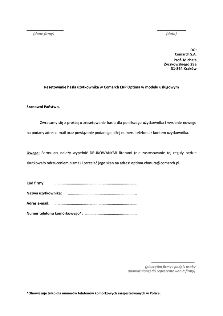 __________________ (dane firmy) ______________ (data) DO: Comarch S.A. Prof. Michała Życzkowskiego 29a 31-864 Kraków Resetowanie hasła użytkownika w Comarch ERP Optima w modelu usługowym Szanowni Państwo, Zwracamy się z prośbą o zresetowanie hasła dla poniższego użytkownika i wysłanie nowego na podany adres e-mail oraz powiązanie podanego niżej numeru telefonu z kontem użytkownika. Uwaga: Formularz należy wypełnić DRUKOWANYMI literami (nie zastosowanie tej reguły będzie skutkowało odrzuceniem pisma) i przesłać jego skan na adres: [email protected]. Kod firmy: ………………………………………………………………………… Nazwa użytkownika: Adres e-mail: ………………………………………………………….... ………………………………………………………………………… Numer telefonu komórkowego*: ……………………………………………… ______________________ (pieczątka firmy i podpis osoby upoważnionej do reprezentowania firmy) *Obowiązuje tylko dla numerów telefonów komórkowych zarejestrowanych w Polsce.