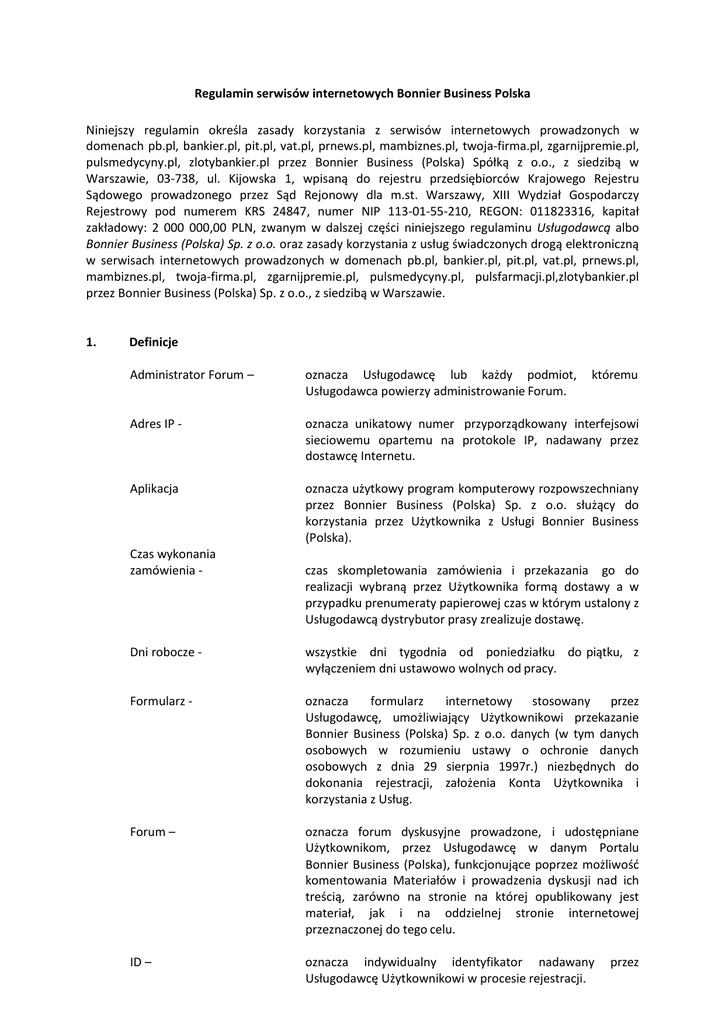 Regulamin serwisów internetowych Bonnier Business Polska Niniejszy regulamin określa zasady korzystania z serwisów internetowych prowadzonych w domenach pb.pl, bankier.pl, pit.pl, vat.pl, prnews.pl, mambiznes.pl, twoja-firma.pl, zgarnijpremie.pl, pulsmedycyny.pl, zlotybankier.pl przez Bonnier Business (Polska) Spółką z o.o., z siedzibą w Warszawie, 03-738, ul. Kijowska 1, wpisaną do rejestru przedsiębiorców Krajowego Rejestru Sądowego prowadzonego przez Sąd Rejonowy dla m.st. Warszawy, XIII Wydział Gospodarczy Rejestrowy pod numerem KRS 24847, numer NIP 113-01-55-210, REGON: 011823316, kapitał zakładowy: 2 000 000,00 PLN, zwanym w dalszej części niniejszego regulaminu Usługodawcą albo Bonnier Business (Polska) Sp. z o.o. oraz zasady korzystania z usług świadczonych drogą elektroniczną w serwisach internetowych prowadzonych w domenach pb.pl, bankier.pl, pit.pl, vat.pl, prnews.pl, mambiznes.pl, twoja-firma.pl, zgarnijpremie.pl, pulsmedycyny.pl, pulsfarmacji.pl,zlotybankier.pl przez Bonnier Business (Polska) Sp. z o.o., z siedzibą w Warszawie. 1. Definicje Administrator Forum – oznacza Usługodawcę lub każdy podmiot, Usługodawca powierzy administrowanie Forum. Adres IP - oznacza unikatowy numer przyporządkowany interfejsowi sieciowemu opartemu na protokole IP, nadawany przez dostawcę Internetu. Aplikacja oznacza użytkowy program komputerowy rozpowszechniany przez Bonnier Business (Polska) Sp. z o.o. służący do korzystania przez Użytkownika z Usługi Bonnier Business (Polska). Czas wykonania zamówienia - któremu czas skompletowania zamówienia i przekazania go do realizacji wybraną przez Użytkownika formą dostawy a w przypadku prenumeraty papierowej czas w którym ustalony z Usługodawcą dystrybutor prasy zrealizuje dostawę. Dni robocze - wszystkie dni tygodnia od poniedziałku do piątku, z wyłączeniem dni ustawowo wolnych od pracy. Formularz - oznacza formularz internetowy stosowany przez Usługodawcę, umożliwiający Użytkownikowi przekazanie Bonnier Business (Polska) Sp. z o.o. danych (w tym danych osobowych w rozumieniu ustawy o ochronie danych osobowych z dnia 29 sierpnia 1997r.) niezbędnych do dokonania rejestracji, założenia Konta Użytkownika i korzystania z Usług. Forum – oznacza forum dyskusyjne prowadzone, i udostępniane Użytkownikom, przez Usługodawcę w danym Portalu Bonnier Business (Polska), funkcjonujące poprzez możliwość komentowania Materiałów i prowadzenia dyskusji nad ich treścią, zarówno na stronie na której opublikowany jest materiał, jak i na oddzielnej stronie internetowej przeznaczonej do tego celu. ID – oznacza indywidualny identyfikator nadawany Usługodawcę Użytkownikowi w procesie rejestracji. przez Konto Użytkownika - baza zawierająca dane Użytkownika służące do realizacji Usług przez Usługodawcę i korzystania przez Użytkownika z Usług. Ze względu na zakres usług świadczonych w Portalach Bonnier Business (Polska), korzystanie z usług w poszczególnych Portalach Bonnier Business (Polska) może być uzależnione od posiadania odrębnych Kont Użytkownika. Koszyk – elektroniczny element działania Sklepu, za pomocą którego Użytkownik precyzuje szczegóły zamówienia takie jak: nazwa lub rodzaj zamawianego produktu, liczba produktów, adres dostawy, dane do faktury, sposób dostawy, sposób płatności, itp. Materiały – oznaczają wszelkie treści tekstowe oraz utrwalenia wizualne, audialne i audiowizualne, w tym bazy danych i aplikacje publikowane, zamieszczane lub stosowane przez Usługodawcę w Portalach Bonnier Business (Polska) lub za ich pośrednictwem. Newsletter - oznacza list elektroniczny przesyłany przez Bonnier Business (Polska) Sp. z o.o. za zgodą Użytkownika, na adres poczty elektronicznej podany w Formularzu, zawierający informacje finansowo- gospodarcze, marketingowe lub handlowe, opatrzony elementami wizualizacyjnymi Bonnier Business (Polska) Sp. z o.o., jednoznacznie wskazującymi na nadawcę listu. Pakiet - oznacza zestaw towarów i uprawnień do korzystania z płatnych Usług, nabywanych łącznie. Pakiety określa pkt. 2.4. Regulaminu, z zastrzeżeniem że Usługodawca może udostępniać Użytkownikom inne Pakiety w zależności od rozwoju oferowanych Usług w ramach Portali Bonnier Business (Polska). Partner - oznacza podmiot współpracujący z Bonnier Business (Polska) Sp. z o.o. PDF – format zapisu danych w pliku którą można odczytać po pobraniu na dowolne urządzenie elektroniczne, wyposażone w czytnik PDF (np. Adobe Reader) oraz inne dokumenty dostępne w formie elektronicznej. Portal pb.pl - oznacza portal internetowy prowadzony przez Usługodawcę w domenie pb.pl wraz z wszystkimi serwisami powiązanymi, zgodnie z funkcjonalnościami oferowanymi w Portalu pb.pl i jego treścią. Portal bankier.pl - oznacza portal internetowy prowadzony przez Usługodawcę w domenie bankier.pl wraz z wszystkimi serwisami powiązanymi, zgodnie z funkcjonalnościami oferowanymi w Portalu bankier.pl i jego treścią. Portal vat.pl - oznacza portal internetowy prowadzony przez Usługodawcę w domenie vat.pl wraz z wszystkimi serwisami powiązanymi, zgodnie z funkcjonalnościami oferowanymi w Portalu vat.pl i jego treścią. Portal pit.pl - oznacza portal internetowy prowadzony przez Usługodawcę w domenie pit.pl wraz z wszystkimi serwisami powiązanymi, zgodnie z funkcjonalnościami oferowanymi w Portalu pit.pl i jego treścią. Portal prnews.pl - oznacza portal internetowy prowadzony przez Usługodawcę w domenie prnews.pl wraz z wszystkimi serwisami powiązanymi, zgodnie z funkcjonalnościami oferowanymi w Portalu prnews.pl i jego treścią. Portal mambiznes.pl - oznacza portal internetowy prowadzony przez Usługodawcę w domenie mambiznes.pl wraz z wszystkimi serwisami powiązanymi, zgodnie z funkcjonalnościami oferowanymi w Portalu mambiznes.pl i jego treścią. Portal twoja-firma.pl - oznacza portal internetowy prowadzony przez Usługodawcę w do