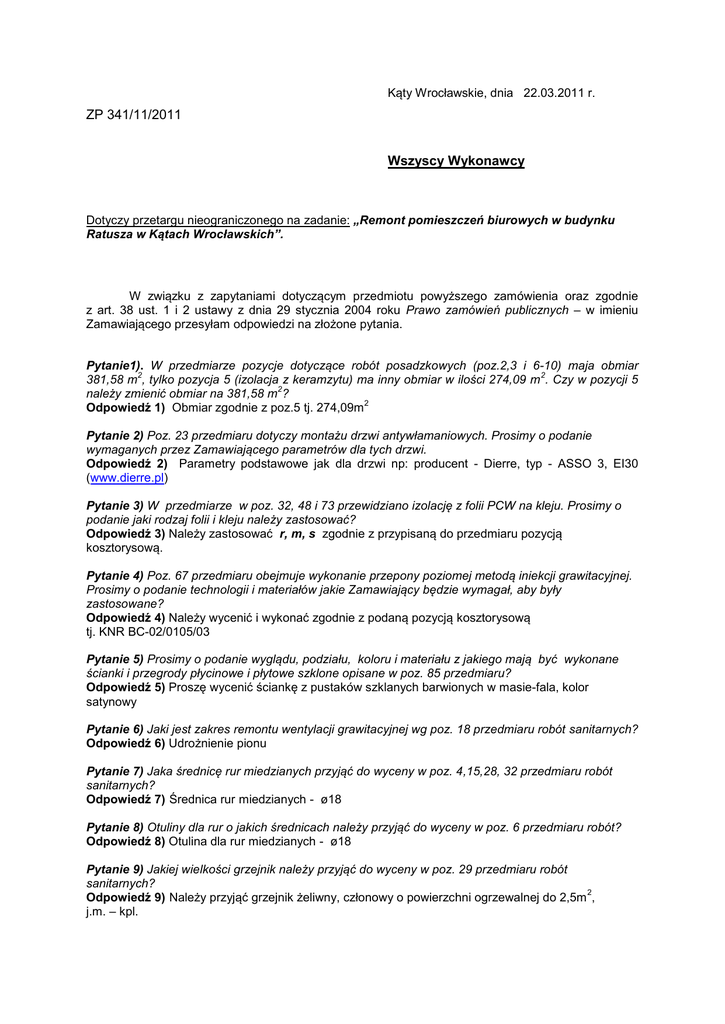 Kąty Wrocławskie, dnia 22.03.2011 r. ZP 341/11/2011 Wszyscy Wykonawcy Dotyczy przetargu nieograniczonego na zadanie: „Remont pomieszczeń biurowych w budynku Ratusza w Kątach Wrocławskich”. W związku z zapytaniami dotyczącym przedmiotu powyższego zamówienia oraz zgodnie z art. 38 ust. 1 i 2 ustawy z dnia 29 stycznia 2004 roku Prawo zamówień publicznych – w imieniu Zamawiającego przesyłam odpowiedzi na złożone pytania. Pytanie1). W przedmiarze pozycje dotyczące robót posadzkowych (poz.2,3 i 6-10) maja obmiar 2 2 381,58 m , tylko pozycja 5 (izolacja z keramzytu) ma inny obmiar w ilości 274,09 m . Czy w pozycji 5 2 należy zmienić obmiar na 381,58 m ? 2 Odpowiedź 1) Obmiar zgodnie z poz.5 tj. 274,09m Pytanie 2) Poz. 23 przedmiaru dotyczy montażu drzwi antywłamaniowych. Prosimy o podanie wymaganych przez Zamawiającego parametrów dla tych drzwi. Odpowiedź 2) Parametry podstawowe jak dla drzwi np: producent - Dierre, typ - ASSO 3, EI30 (www.dierre.pl) Pytanie 3) W przedmiarze w poz. 32, 48 i 73 przewidziano izolację z folii PCW na kleju. Prosimy o podanie jaki rodzaj folii i kleju należy zastosować? Odpowiedź 3) Należy zastosować r, m, s zgodnie z przypisaną do przedmiaru pozycją kosztorysową. Pytanie 4) Poz. 67 przedmiaru obejmuje wykonanie przepony poziomej metodą iniekcji grawitacyjnej. Prosimy o podanie technologii i materiałów jakie Zamawiający będzie wymagał, aby były zastosowane? Odpowiedź 4) Należy wycenić i wykonać zgodnie z podaną pozycją kosztorysową tj. KNR BC-02/0105/03 Pytanie 5) Prosimy o podanie wyglądu, podziału, koloru i materiału z jakiego mają być wykonane ścianki i przegrody płycinowe i płytowe szklone opisane w poz. 85 przedmiaru? Odpowiedź 5) Proszę wycenić ściankę z pustaków szklanych barwionych w masie-fala, kolor satynowy Pytanie 6) Jaki jest zakres remontu wentylacji grawitacyjnej wg poz. 18 przedmiaru robót sanitarnych? Odpowiedź 6) Udrożnienie pionu Pytanie 7) Jaka średnicę rur miedzianych przyjąć do wyceny w poz. 4,15,28, 32 przedmiaru robót sanitarnych? Odpowiedź 7) Średnica rur miedzianych - ø18 Pytanie 8) Otuliny dla rur o jakich średnicach należy przyjąć do wyceny w poz. 6 przedmiaru robót? Odpowiedź 8) Otulina dla rur miedzianych - ø18 Pytanie 9) Jakiej wielkości grzejnik należy przyjąć do wyceny w poz. 29 przedmiaru robót sanitarnych? 2 Odpowiedź 9) Należy przyjąć grzejnik żeliwny, członowy o powierzchni ogrzewalnej do 2,5m , j.m. – kpl. Pytanie 10) W projekcie umowy w §4 ust.1 zapisano, że wykonanie przedmiotu umowy będzie obowiązywało wynagrodzenie ryczałtowe. Natomiast w §4 ust.4 projektu umowy zapisano, że rozliczenie za wykonane prace nastąpi kosztorysem powykonawczym. Zapisy w SIWZ (rozdział 11) sugerują również rozliczenie kosztorysem [powykonawczym (szczególnie pkt.11.13). Prosimy o jednoznaczne określenie sposobu rozliczenia, czy będzie ryczałtowe, czy tez kosztorysem powykonawczym? Odpowiedź 10) Rozliczenie z Zamawiającym za wykonane prace następować będzie każdorazowo kosztorysem powykonawczym po każdym z zakończonych etapów. Pytanie 11) Z uwagi na długi okres realizacji zadania (do 30.09.2011 r.) zasadnym byłoby rozliczanie w/w prac fakturami przejściowymi. Czy Zamawiający wyraża zgodę na w/w rozliczenie i proszę o podanie ilości faktur przejściowych? Odpowiedź 11) Ze względu na długi okres realizacji zadania zamawiający dopuszcza płatność w trzech transzach każdorazowo po zakończeniu określonego w harmonogramie rzeczowym etapu prac. Rozliczenie poszczególnych etapów następuje na podstawie kosztorysu powykonawczego z zachowaniem procedur odbioru przewidzianych w umowie. Pytanie 12)W trakcie wizji lokalnej, która odbyła się w dniu 16.03.2011 r. Pan Tomasz Kudyba pokazywał nam jedynie drzwi wewnętrzne, stylizowane jedno- i dwuskrzydłowe. Prosimy o sprecyzowanie parametrów drzwi zewnętrznych stylizowanych, ocieplonych (wejściowych) ujętych w pozycjach 60 i 84 przedmiaru? Odpowiedź 12) Zamawiający w przedmiocie umowy przewidział wymianę 2 par drzwi zewnętrznych w pomieszczeniach zajmowanych przez Polski Związek Wędkarstwa oraz Restaurację Central Pub według poniższych parametrów: - drzwi zewnętrzne ocieplane grubości 68mm (łukowe i proste) jednoskrzydłowe na ościeżnicy prostej z progiem drewnianym /ocieplenie wykonane ze styropianu oraz foli aluminiowej/ - konstrukcja oparta a profilu drzwiowym wykonanym z drewna litego (dąb, meranti, jesion) - kantówka klejona trójwarstwowo grubość 68mm - profile drzwiowe wzmocnione poprzez połączenie czopów tradycyjnych zapewniających stabilność konstrukcji, trwałość i odporność na wypatrzenia. Kasetony (płyciny) drewniane. - dodatkowo dwie uszczelki na bazie poliuretanu wpuszczane w ościeżnicę oraz skrzydło - wykończenie lakierowanie czterowarstwowe; - okucia drzwiowe stylizowane mosiężne ( zawiasy, szyldy, klamki) ponadto drzwi zabezpieczone dwoma zamkami patentowymi firmy GERADA.