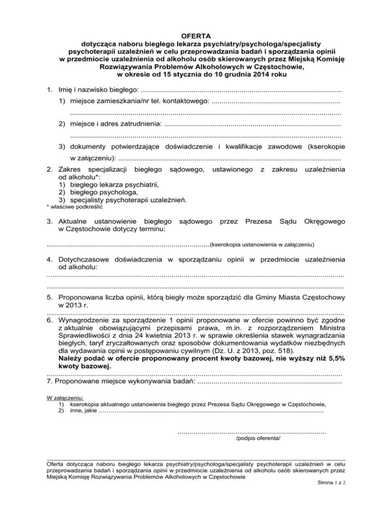 OFERTA dotycząca naboru biegłego lekarza psychiatry/psychologa/specjalisty psychoterapii uzależnień w celu przeprowadzania badań i sporządzania opinii w przedmiocie uzależnienia od alkoholu osób skierowanych przez Miejską Komisję Rozwiązywania Problemów Alkoholowych w Częstochowie, w okresie od 15 stycznia do 10 grudnia 2014 roku 1. Imię i nazwisko biegłego: .................................................................................................... 1) miejsce zamieszkania/nr tel. kontaktowego: ................................................................ ....................................................................................................................................... 2) miejsce i adres zatrudnienia: ........................................................................................ ....................................................................................................................................... 3) dokumenty potwierdzające doświadczenie i kwalifikacje zawodowe (kserokopie w załączeniu): ............................................................................................................... 2. Zakres specjalizacji biegłego sądowego, od alkoholu*: 1) biegłego lekarza psychiatrii, 2) biegłego psychologa, 3) specjalisty psychoterapii uzależnień. ustawionego z zakresu uzależnienia Sądu Okręgowego * właściwe podkreślić 3. Aktualne ustanowienie biegłego w Częstochowie dotyczy terminu: sądowego przez Prezesa ................................................................................. (kserokopia ustanowienia w załączeniu) 4. Dotychczasowe doświadczenia w sporządzaniu opinii w przedmiocie uzależnienia od alkoholu: .................................................................................................................................................... .................................................................................................................................................... 5. Proponowana liczba opinii, którą biegły może sporządzić dla Gminy Miasta Częstochowy w 2013 r. .................................................................................................................................................... 6. Wynagrodzenie za sporządzenie 1 opinii proponowane w ofercie powinno być zgodne z aktualnie obowiązującymi przepisami prawa, m.in. z rozporządzeniem Ministra Sprawiedliwości z dnia 24 kwietnia 2013 r. w sprawie określenia stawek wynagradzania biegłych, taryf zryczałtowanych oraz sposobów dokumentowania wydatków niezbędnych dla wydawania opinii w postępowaniu cywilnym (Dz. U. z 2013, poz. 518). Należy podać w ofercie proponowany procent kwoty bazowej, nie wyższy niż 5,5% kwoty bazowej. ................................................................................................................................................... 7. Proponowane miejsce wykonywania badań: ........................................................................ W załączeniu: 1) kserokopia aktualnego ustanowienia biegłego przez Prezesa Sądu Okręgowego w Częstochowie, 2) inne, jakie …………........................................................................................................................... .......................................................................... /podpis oferenta/ Oferta dotycząca naboru biegłego lekarza psychiatry/psychologa/specjalisty psychoterapii uzależnień w celu przeprowadzania badań i sporządzania opinii w przedmiocie uzależnienia od alkoholu osób skierowanych przez Miejską Komisję Rozwiązywania Problemów Alkoholowych w Częstochowie Strona 1 z 2 Oferta dotycząca naboru biegłego lekarza psychiatry/psychologa/specjalisty psychoterapii uzależnień w celu przeprowadzania badań i sporządzania opinii w przedmiocie uzależnienia od alkoholu osób skierowanych przez Miejską Komisję Rozwiązywania Problemów Alkoholowych w Częstochowie Strona 2 z 2