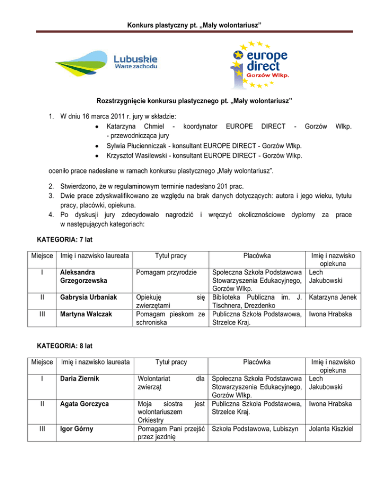 Konkurs plastyczny pt. „Mały wolontariusz” Rozstrzygnięcie konkursu plastycznego pt. „Mały wolontariusz” 1. W dniu 16 marca 2011 r. jury w składzie: Katarzyna Chmiel - koordynator EUROPE DIRECT - Gorzów - przewodnicząca jury Sylwia Płucienniczak - konsultant EUROPE DIRECT - Gorzów Wlkp. Krzysztof Wasilewski - konsultant EUROPE DIRECT - Gorzów Wlkp. Wlkp. oceniło prace nadesłane w ramach konkursu plastycznego „Mały wolontariusz”. 2. Stwierdzono, że w regulaminowym terminie nadesłano 201 prac. 3. Dwie prace zdyskwalifikowano ze względu na brak danych dotyczących: autora i jego wieku, tytułu pracy, placówki, opiekuna. 4. Po dyskusji jury zdecydowało nagrodzić i wręczyć okolicznościowe dyplomy za prace w następujących kategoriach: KATEGORIA: 7 lat Miejsce Imię i nazwisko laureata I Aleksandra Grzegorzewska II Gabrysia Urbaniak III Martyna Walczak Tytuł pracy Placówka Imię i nazwisko opiekuna Pomagam przyrodzie Społeczna Szkoła Podstawowa Lech Stowarzyszenia Edukacyjnego, Jakubowski Gorzów Wlkp. Opiekuję się Biblioteka Publiczna im. J. Katarzyna Jenek zwierzętami Tischnera, Drezdenko Pomagam pieskom ze Publiczna Szkoła Podstawowa, Iwona Hrabska schroniska Strzelce Kraj. Tytuł pracy Placówka KATEGORIA: 8 lat Miejsce Imię i nazwisko laureata Imię i nazwisko opiekuna dla Społeczna Szkoła Podstawowa Lech Stowarzyszenia Edukacyjnego, Jakubowski Gorzów Wlkp. jest Publiczna Szkoła Podstawowa, Iwona Hrabska Strzelce Kraj. I Daria Ziernik Wolontariat zwierząt II Agata Gorczyca III Igor Górny Moja siostra wolontariuszem Orkiestry Pomagam Pani przejść Szkoła Podstawowa, Lubiszyn przez jezdnię Jolanta Kiszkiel Konkurs plastyczny pt. „Mały wolontariusz” KATEGORIA: 9 lat Miejsce Imię i nazwisko laureata I Ewa Pelińska II Kamil Witkowski III Natalia Walczak Tytuł pracy Placówka Imię i nazwisko opiekuna Spacer wiosenny Biblioteka Publiczna im. J. Katarzyna Jenek Tischnera, Drezdenko Wolontariusz pomaga Szkoła Podstawowa, Barbara staruszkom Krzeszyce Adamska Pomagam w hospicjum Społeczna Szkoła Podstawowa Lech Stowarzyszenia Edukacyjnego, Jakubowski Gorzów Wlkp. Tytuł pracy Placówka KATEGORIA: 10 lat Miejsce Imię i nazwisko laureata I Karolina Knop Mały wolontariusz II Maria Kuszyńska Mój wolontariat III Zuzanna Cichała Mały wolontariusz Imię i nazwisko opiekuna Publiczna Szkoła Podstawowa, Elżbieta Strzelce Kraj. Szafranek Szkoła Podstawowa nr 2, E. Zabielska Międzyrzecz Publiczna Szkoła Podstawowa, Elżbieta Strzelce Kraj. Szafranek KATEGORIA: 11 lat Miejsce Imię i nazwisko laureata I Wojciech Szydłowski II Agata Kalinowska III Patryk Grocholewski Tytuł pracy Placówka Imię i nazwisko opiekuna Mały wolontariusz Publiczna Szkoła Podstawowa, Gościmiec Uśmiech dla dzieci Szkoła Podstawowa, Trzebicz Agnieszka z domu dziecka Kazimierczuk Pomagam starszym - Szkoła Podstawowa nr 2, E. Zabielska mój wolontariat Międzyrzecz KATEGORIA: 12 lat Miejsce I Imię i nazwisko laureata Aleksandra Buchelt Wiktoria Maćczak II Natalia Śmiechowicz Jagoda Sernik III Patrycja Soboń Tytuł pracy Dom dziecka Placówka Imię i nazwisko opiekuna Publiczna Szkoła Podstawowa, Gościmiec Wolontariuszka Wiki Szkoła Podstawowa, Brójce Małgorzata Biernat Pomoc w schronisku Szkoła Podstawowa, Trzebicz Agnieszka Kazimierczuk Pod niebem Afryki Szkoła Podstawowa, Trzebicz Agnieszka Kazimierczuk Wielka paczka - wielka Szkoła Podstawowa, Trzebicz Agnieszka sprawa Kazimierczuk Konkurs plastyczny pt. „Mały wolontariusz” KATEGORIA: 13 - 14 lat Miejsce Imię i nazwisko laureata Tytuł pracy I Kamila Szmyt Pomagamy II Natalia Kardacka III Radek Smarslik Pracujemy Owsiakiem! Pomagaj ludziom Placówka Imię i nazwisko opiekuna Niepubliczna Szkoła Jolanta Kiszkiel Podstawowa Stowarzyszenia Kulturalno - Oświatowego, Wysoka z Szkoła Podstawowa, Trzebicz Agnieszka Kazimierczuk innym Niepubliczna Szkoła Jolanta Kiszkiel Podstawowa Stowarzyszenia Kulturalno - Oświatowego, Wysoka 5. Jury uznało, że autorzy pozostałych prac otrzymają okolicznościowe dyplomy. 6. Nagrody i dyplomy zostaną wręczone osobiście lub przesłane pocztą, po ustaleniach z opiekunami. 7. Jury zastrzega sobie wybór nagród dla poszczególnych zwycięzców. Przewodnicząca jury Katarzyna Chmiel