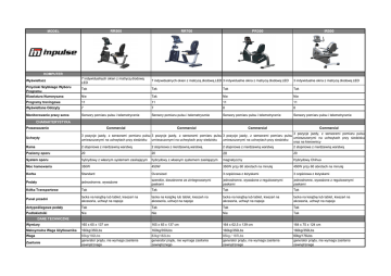 RR500 MODEL RR700 PR300 IR500 KOMPUTER Wyświetlacz Przyciski Szybkiego Wyboru Programu Klawiatura Numeryczna 7 indywidualnych okien z matrycą diodową LED 7 indywidualnych okien z matrycą diodową LED 3 indywidualne okna z matrycą diodową LED 3 indywidualne okna z matrycą diodową LED Tak Tak Tak Tak Nie Tak Nie Nie Programy treningowe 11 11 11 11 Wyświetlane Odczyty 7 7 8 8 Monitorowanie pracy serca Sensory pomiaru pulsu i telemetrycznie Sensory pomiaru pulsu i telemetrycznie Sensory pomiaru pulsu i telemetrycznie Sensory pomiaru pulsu i telemetrycznie CHARAKTERYSTYKA Przeznaczenie Commercial Commercial Commercial Commercial Uchwyty 3 pozycje jazdy, z sensorami pomiaru pulsu 3 pozycje jazdy, z sensorami pomiaru pulsu 3 pozycje jazdy, z sensorami pomiaru pulsu 3 pozycje jazdy, z sensorami pomiaru pulsu umieszczonymi na uchwytach przy siedzisku umieszczonymi na uchwytach przy siedzisku umieszczonymi na uchwytach przy siedzisku umieszczonymi na uchwytach przy siedzisku oraz na kierownicy Rama 2 stopniowa z nierdzewną warstwą 2 stopniowa z nierdzewną warstwą Poziomy oporu 20 System oporu hybrydowy z własnym systemem zasilającym Moc hamowania Korba 2 stopniowa z nierdzewną warstwą 2 stopniowa z nierdzewną warstwą 20 20 20 hybrydowy z własnym systemem zasilającym magnetyczny Hybrydowy Chihua 350W 450W 350W przy 60 obrotach na minutę 450W przy 60 obrotach na minutę Standard Oversized 3 częściowa z łożyskami 3 częściowa z łożyskami Pedały jednostronne, wyważone szerokie, dwustronne ze zintegrowanymi paskami jednostronne, wyważone z regulowanymi paskami jednostronne, wyważone z regulowanymi paskami Kółka Transportowe Tak Tak Tak Tak Panel przedni tacka na książkę lub tablet, kieszeń na akcesoria, uchwyt na napoje tacka na książkę lub tablet, kieszeń na akcesoria, uchwyt na napoje tacka na książkę lub tablet, kieszeń na akcesoria, uchwyt na napoje tacka na książkę lub tablet, kieszeń na akcesoria, uchwyt na napoje Antypoślizgowe pedały Tak Tak Tak Tak Podłokietniki Nie Nie Nie Tak Wymiary 165 x 65 x 137 cm 165 x 65 x 137 cm 164 x 62,5 x 139 cm 164 x 75 x 124 cm Maksymalna Waga Użytkownika 160kg/350Lbs 160kg/350Lbs 160kg/350Lbs 160kg/350Lbs Waga 83kg/182Lbs generator prądu, nie wymaga zasilania zewnętrznego 83kg/182Lbs generator prądu, nie wymaga zasilania zewnętrznego 85kg / 187Lbs generator prądu, nie wymaga zasilania zewnętrznego 80kg/176Lbs generator prądu, nie wymaga zasilania zewnętrznego DANE TECHNICZNE Zasilanie