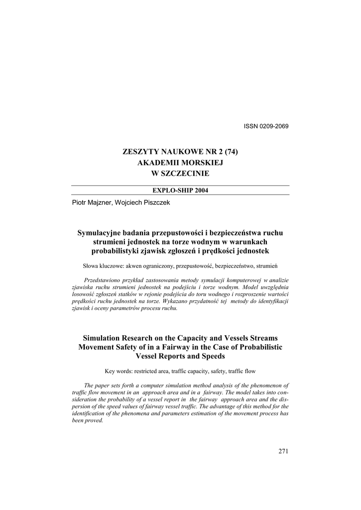 ISSN 0209-2069 ZESZYTY NAUKOWE NR 2 (74) AKADEMII MORSKIEJ W SZCZECINIE EXPLO-SHIP 2004 Piotr Majzner, Wojciech Piszczek Symulacyjne badania przepustowości i bezpieczeństwa ruchu strumieni jednostek na torze wodnym w warunkach probabilistyki zjawisk zgłoszeń i prędkości jednostek Słowa kluczowe: akwen ograniczony, przepustowość, bezpieczeństwo, strumień Przedstawiono przykład zastosowania metody symulacji komputerowej w analizie zjawiska ruchu strumieni jednostek na podejściu i torze wodnym. Model uwzględnia losowość zgłoszeń statków w rejonie podejścia do toru wodnego i rozproszenie wartości prędkości ruchu jednostek na torze. Wykazano przydatność tej metody do identyfikacji zjawisk i oceny parametrów procesu ruchu. Simulation Research on the Capacity and Vessels Streams Movement Safety of in a Fairway in the Case of Probabilistic Vessel Reports and Speeds Key words: restricted area, traffic capacity, safety, traffic flow The paper sets forth a computer simulation method analysis of the phenomenon of traffic flow movement in an approach area and in a fairway. The model takes into consideration the probability of a vessel report in the fairway approach area and the dispersion of the speed values of fairway vessel traffic. The advantage of this method for the identification of the phenomena and parameters estimation of the movement process has been proved. 271 Piotr Majzner, Wojciech Piszczek Wprowadzenie Duże i nadal rosnące natężenie ruchu jednostek pływających na akwenach ograniczonych stwarza istotne problemy dotyczące przepustowości i bezpieczeństwa ruchu na tych akwenach. Rozwiązywaniem tych problemów zajmuje się inżynieria ruchu morskiego – IRM, dokonując jakościowego i ilościowego opisu procesów tego ruchu [4]. Wymienione problemy można rozwiązywać różnymi metodami. Początkowo stosowano tylko metody heurystyczne, w których wnioski formułowano opierając się na wiedzy praktyków. Podstawowa wada tych metod polegała na braku adekwatności, zbyt małej liczności zbiorów obserwacji, jeśli obejmowały one krótki okres lub zbyt dużej zmianie uwarunkowań struktury akwenu i strumieni jednostek, jeśli brano pod uwagę dłuższy horyzont czasowy. Proste zjawiska można badać metodami analitycznymi, wykorzystując teorię masowej obsługi, której istota sprowadza się do ułożenia i rozwiązywania układów równań różniczkowych, wiążących ze sobą prawdopodobieństwa zdarzeń występujących w procesie ruchu strumieni jednostek. Przy zastosowaniu znacznych uproszczeń, układ równań różniczkowych można sprowadzić w odpowiadający im układ równań algebraicznych. Metody analityczne można stosować do opisu prostych systemów pod warunkiem, że są spełnione dość silne założenia dotyczące strumieni zgłoszeń. W praktyce założenia te są stosunkowo rzadko spełnione i stanowią zbyt daleko idącą idealizację zjawisk. Ograniczeniem rozwoju tych metod stały się komplikacje obliczeniowe (nieproporcjonalnie duży wzrost ilości równań przy rozbudowie modelu i ograniczenia w stosowaniu dowolnych typów rozkładów prawdopodobieństwa [4]). Rozwój komputerowych technik obliczeniowych spowodował, że obecnie i w niedalekiej przyszłości szczególnego znaczenia nabierają metody symulacji komputerowej. Metody symulacyjne polegają na syntezie algorytmu symulującego funkcjonowanie danego systemu. Wielokrotna komputerowa realizacja procesu z użyciem tego algorytmu, a następnie opracowanie statystyczne rezultatów pozwala na znalezienie interesujących nas współzależności i przebiegu wartości miar opisujących dany proces [1]. Metody symulacyjne stanowią jedyną efektywną metodę analizy złożonych systemów przy dowolnych strukturach, strumieniach wejściowych i złożonych zasadach ruchu na akwenach. Powyższe czynniki w pełni uzasadniają zastosowanie metod symulacji do badania ruchu strumieni jednostek na akwenach o zróżnicowanej konfiguracji [2]. Niniejszy artykuł wykazuje przydatność tej metody do identyfikacji zjawisk i oceny parametrów procesu ruchu. 272 Symulacyjne badania przepustowości i bezpieczeństwa ruchu strumieni jednostek na torze ... 2. Charakterystyka procesu ruchu jednostek na podejściu i torze wodnym Badanie złożonych systemów za pomocą komputerowych metod symulacyjnych wymaga bardzo refleksyjnego postępowania. Na analityka czyhają liczne zasadzki interpretacyjne, trudne do przewidzenia interakcje modelu, w tym generatorów zmiennych losowych czy wreszcie zwykłe błędy logiczne. Stąd poprawnym postępowaniem jest rozpoczęcie od budowy i analizy prostych modeli elementów akwenów, ich wielokrotna weryfikacja, stopniowe odchodzenie od założeń upraszczających a następnie konstruowanie z nich złożonych systemów odzwierciedlających rzeczywistość. Wyniki badań komputerowymi metodami symulacyjnymi ruchu strumieni jednostek na podejściu i torze wodnym podano w opracowaniu [2]. Badania przeprowadzono przy założeniu przypadkowości momentów podchodzenia statków do rejonu wejścia na tor wodny i uporządkowanym ruchu jednostek z jednakową prędkością na torze. Obecnie dokonana zostanie próba uzmiennienia również prędkości jednostek na torze, co pozwoli zidentyfikować zjawiska i określić parametry przepustowości i bezpieczeństwa w takiej sytuacji. Załóżmy, że na wąskim jednokierunkowym torze pojawia się jednorodny strumień jednostek o następujących parametrach: minimalna, dopuszczalna odległość między statkami na torze Δl = 500 m, długość statku ls = 200 m, długość toru lt = 18 km, prędkość statku opisuje rozkład normalny o wartości średniej vśr = 8,1 w i o odchyleniu standardowym σ = 0 oraz σ = 1,62 w, okres pojawiania się jednostek na wejściu toru jest zmienną losową opisaną rozkładem wykładniczym przesuniętym o wartości średniej Tśr oraz przesunięciu Tp (na początek Tp = 0), horyzont czasu symu