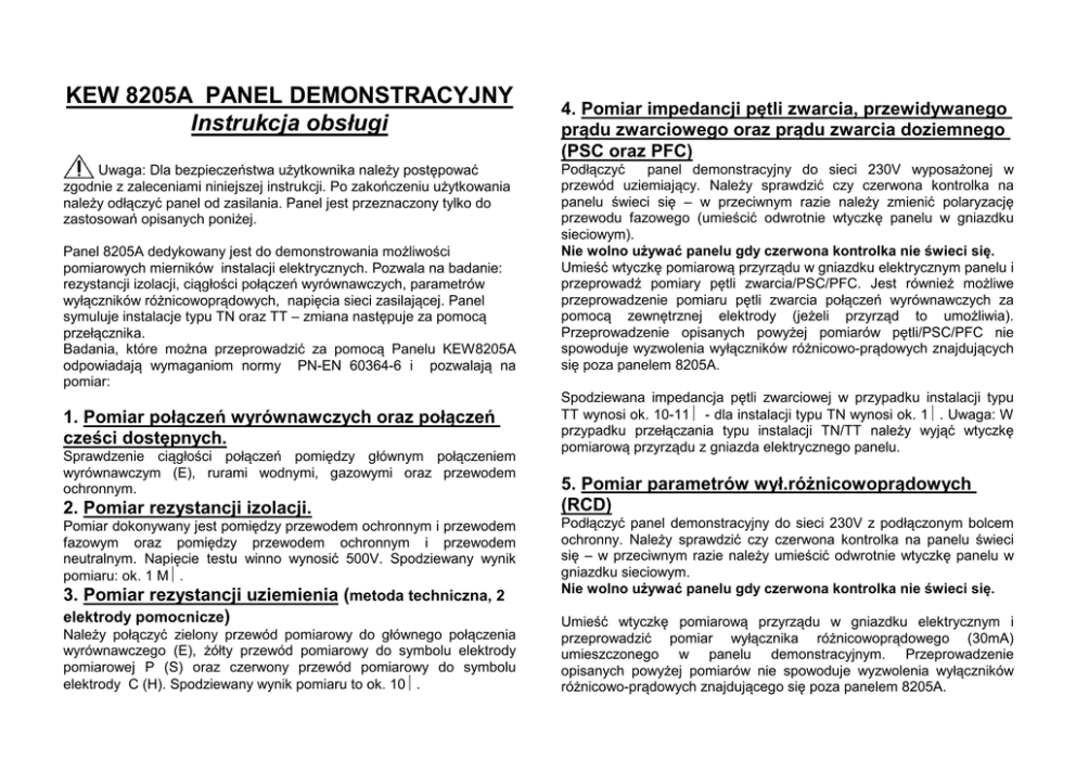 KEW 8205A PANEL DEMONSTRACYJNY Instrukcja obsługi Uwaga: Dla bezpieczeństwa użytkownika należy postępować zgodnie z zaleceniami niniejszej instrukcji. Po zakończeniu użytkowania należy odłączyć panel od zasilania. Panel jest przeznaczony tylko do zastosowań opisanych poniżej. Panel 8205A dedykowany jest do demonstrowania możliwości pomiarowych mierników instalacji elektrycznych. Pozwala na badanie: rezystancji izolacji, ciągłości połączeń wyrównawczych, parametrów wyłączników różnicowoprądowych, napięcia sieci zasilającej. Panel symuluje instalacje typu TN oraz TT – zmiana następuje za pomocą przełącznika. Badania, które można przeprowadzić za pomocą Panelu KEW8205A odpowiadają wymaganiom normy PN-EN 60364-6 i pozwalają na pomiar: 1. Pomiar połączeń wyrównawczych oraz połączeń cześci dostępnych. Sprawdzenie ciągłości połączeń pomiędzy głównym połączeniem wyrównawczym (E), rurami wodnymi, gazowymi oraz przewodem ochronnym. 2. Pomiar rezystancji izolacji. Pomiar dokonywany jest pomiędzy przewodem ochronnym i przewodem fazowym oraz pomiędzy przewodem ochronnym i przewodem neutralnym. Napięcie testu winno wynosić 500V. Spodziewany wynik pomiaru: ok. 1 MΩ. 3. Pomiar rezystancji uziemienia (metoda techniczna, 2 elektrody pomocnicze) Należy połączyć zielony przewód pomiarowy do głównego połączenia wyrównawczego (E), żółty przewód pomiarowy do symbolu elektrody pomiarowej P (S) oraz czerwony przewód pomiarowy do symbolu elektrody C (H). Spodziewany wynik pomiaru to ok. 10Ω. 4. Pomiar impedancji pętli zwarcia, przewidywanego prądu zwarciowego oraz prądu zwarcia doziemnego (PSC oraz PFC) Podłączyć panel demonstracyjny do sieci 230V wyposażonej w przewód uziemiający. Należy sprawdzić czy czerwona kontrolka na panelu świeci się – w przeciwnym razie należy zmienić polaryzację przewodu fazowego (umieścić odwrotnie wtyczkę panelu w gniazdku sieciowym). Nie wolno używać panelu gdy czerwona kontrolka nie świeci się. Umieść wtyczkę pomiarową przyrządu w gniazdku elektrycznym panelu i przeprowadź pomiary pętli zwarcia/PSC/PFC. Jest również możliwe przeprowadzenie pomiaru pętli zwarcia połączeń wyrównawczych za pomocą zewnętrznej elektrody (jeżeli przyrząd to umożliwia). Przeprowadzenie opisanych powyżej pomiarów pętli/PSC/PFC nie spowoduje wyzwolenia wyłączników różnicowo-prądowych znajdujących się poza panelem 8205A. Spodziewana impedancja pętli zwarciowej w przypadku instalacji typu TT wynosi ok. 10-11Ω - dla instalacji typu TN wynosi ok. 1Ω. Uwaga: W przypadku przełączania typu instalacji TN/TT należy wyjąć wtyczkę pomiarową przyrządu z gniazda elektrycznego panelu. 5. Pomiar parametrów wył.różnicowoprądowych (RCD) Podłączyć panel demonstracyjny do sieci 230V z podłączonym bolcem ochronny. Należy sprawdzić czy czerwona kontrolka na panelu świeci się – w przeciwnym razie należy umieścić odwrotnie wtyczkę panelu w gniazdku sieciowym. Nie wolno używać panelu gdy czerwona kontrolka nie świeci się. Umieść wtyczkę pomiarową przyrządu w gniazdku elektrycznym i przeprowadzić pomiar wyłącznika różnicowoprądowego (30mA) umieszczonego w panelu demonstracyjnym. Przeprowadzenie opisanych powyżej pomiarów nie spowoduje wyzwolenia wyłączników różnicowo-prądowych znajdującego się poza panelem 8205A.