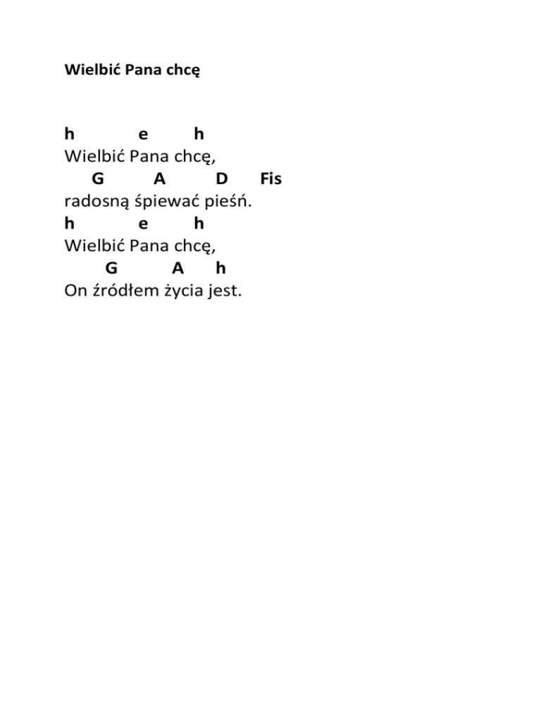 Wielbić Pana chcę h e h Wielbić Pana chcę, G A D Fis radosną śpiewać pieśń. h e h Wielbić Pana chcę, G A h On źródłem życia jest.