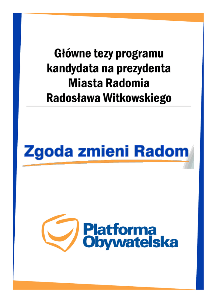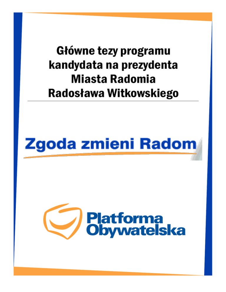 Główne tezy programu kandydata na prezydenta Miasta Radomia Radosława Witkowskiego Praca Bezrobocie jest największym problemem Radomia. Mam konkretne projekty, które pomogą go rozwiązać. Dzięki nowemu otwarciu w specjalnej strefie ekonomicznej, współpracy z Agencją rozwoju przemysłu i utworzeniu Radomskiej Strefy Gospodarczej stworzymy osiem tysięcy miejsc pracy. Obniżymy bezrobocie do poziomu, w którym przestanie ono być tak wielkim problemem dla radomian. Naszym celem jest spadek bezrobocia do 12,5%. Inwestycje Inwestycje w infrastrukturę trzeba kierować tam, gdzie jest to najbardziej potrzebne. Moim priorytetem są trzy kwestie: 1. Nowa hala sportowa. Jeśli nie powstanie, nasze drużyny grające w najwyższych ligach poszczególnych dyscyplin, zostaną z nich wyrzucone. Nie możemy na to pozwolić tym bardziej, że miasto zainwestowało w Rosę i w Czarnych około dziesięć milionów złotych. Inwestycje 2. Budowa trasy N-S O drodze łączącej północ z południem miasta mówi się w Radomiu od wielu lat. Nadszedł czas, żeby ją wybudować. Bez tego nie odkorkujemy Śródmieścia. Inwestycje 3. Szeroko zakrojony plan utwardzenia ulic gruntowych. Trzeba wreszcie zacząć lać asfalt tam, gdzie ludzie tego najbardziej potrzebują. W Radomiu jest zbyt wiele miejsc, które wyglądają jakby znajdowały się w małych miejscowościach, a nie w przeszło dwustutysięcznym mieście. Objęcie opieką osób starszych Wobec przedstawicieli starszego pokolenia mamy ogromny dług wdzięczności. Dzisiaj to my musimy o nich zadbać. Wprowadzimy Kartę Seniora, która podobnie jak Karta Rodzina Plus będzie dawać duże zniżki w instytucjach kultury, sportu i rekreacji, ale też chociażby w kawiarniach. Stworzymy specjalne punkty opieki dla Seniorów. Będą mogli w nich zjeść tani obiad, skorzystać z pomocy asystenta osoby starszej czy wziąć udział w interesujących zajęciach, zamiast spędzać czas w domu. Rozszerzymy program darmowych szczepień dla Seniorów. System odbioru śmieci— sprawny i tani Czas najwyższy, żeby radomianie płacili za odbiór odpadów tylko tyle, ile to naprawdę kosztuje. Dziś płacą po prostu za dużo. Sam system odbioru także wymaga poprawienia—dziś często jest za mało pojemników, a śmieci odbierane są zbyt rzadko. Tania i sprawna komunikacja Stworzymy system zachęt do korzystania z komunikacji miejskiej. W granicach strefy płatnego parkowania bilet będzie kosztował złotówkę. Cena biletu miesięcznego spadnie docelowo do dwudziestokrotności biletu normalnego. Wprowadzimy bilety czasowe. Dostosujemy sieć linii autobusowych do rzeczywistych potrzeb mieszkańców. Uwzględnimy tutaj szybko rozbudowujące się części miasta, takie jak na przykład Gołębiów II. Drogi dla rowerów muszą mieć spójną sieć. Młodzi w Radomiu Musimy dać młodym radomianom szansę na rozwój w rodzinnym mieście. Zaproponować studia na niezłym poziomie—zarówno techniczne jak i humanistyczne. Ważna jest również dobra i zróżnicowana oferta rozrywkowa i kulturalna, lecz przede wszystkim praca. Praca, która da wynagrodzenie pozwalające założyć rodzinę i planować przyszłość. Młodzi, którzy wyjechali z Radomia, muszą mieć powód, by do naszego miasta wracać. Konkursy na stanowiska urzędnicze muszą być w pełni otwarte i prowadzone przejrzyście. Radomianin — to brzmi dumnie