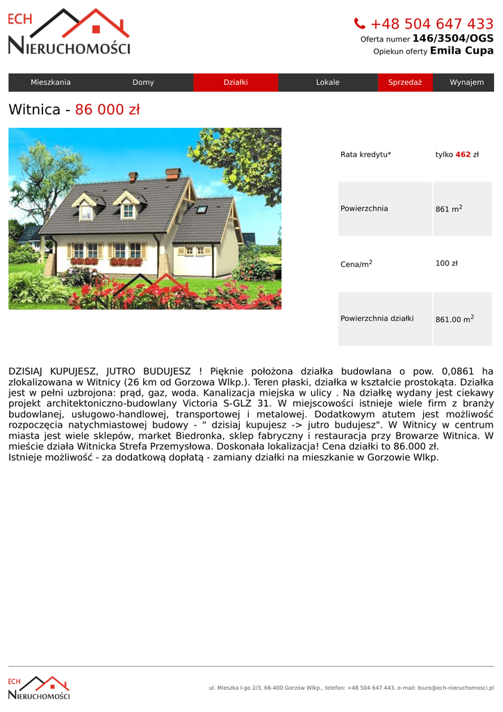 +48504647433 Ofertanumer146/3504/OGS OpiekunofertyEmilaCupa Mieszkania Domy Działki Lokale Sprzedaż Wynajem Witnica-86000zł Ratakredytu* tylko462zł Powierzchnia 861m2 Cena/m2 100zł Powierzchniadziałki 861.00m2 DZISIAJ KUPUJESZ, JUTRO BUDUJESZ ! Pięknie położona działka budowlana o pow. 0,0861 ha zlokalizowanawWitnicy(26kmodGorzowaWlkp.).Terenpłaski,działkawkształcieprostokąta.Działka jest w pełni uzbrojona: prąd, gaz, woda. Kanalizacja miejska w ulicy . Na działkę wydany jest ciekawy projekt architektoniczno-budowlany Victoria S-GLZ 31. W miejscowości istnieje wiele firm z branży budowlanej, usługowo-handlowej, transportowej i metalowej. Dodatkowym atutem jest możliwość rozpoczęcia natychmiastowej budowy - " dzisiaj kupujesz -> jutro budujesz". W Witnicy w centrum miasta jest wiele sklepów, market Biedronka, sklep fabryczny i restauracja przy Browarze Witnica. W mieściedziałaWitnickaStrefaPrzemysłowa.Doskonałalokalizacja!Cenadziałkito86.000zł. Istniejemożliwość-zadodatkowądopłatą-zamianydziałkinamieszkaniewGorzowieWlkp. ul.MieszkaI-go2/3,66-400GorzówWlkp.,telefon:+48504647443,e-mail:[email protected]