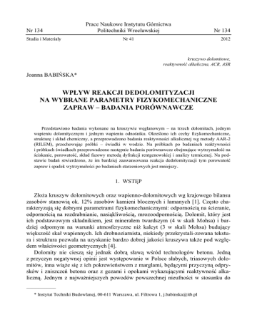 Nr 134 Studia i Materiały Prace Naukowe Instytutu Górnictwa Politechniki Wrocławskiej Nr 134 Nr 41 2012 kruszywo dolomitowe, reaktywność alkaliczna, ACR, ASR Joanna BABIŃSKA* WPŁYW REAKCJI DEDOLOMITYZACJI NA WYBRANE PARAMETRY FIZYKOMECHANICZNE ZAPRAW – BADANIA PORÓWNAWCZE Przedstawiono badania wykonane na kruszywie węglanowym – na trzech dolomitach, jednym wapieniu dolomitycznym i jednym wapieniu odnośniku. Określono ich cechy fizykomechaniczne, strukturę i skład chemiczny, a przeprowadzono badania reaktywności alkalicznej wg metody AAR-2 (RILEM), przechowując próbki – świadki w wodzie. Na próbkach po badaniach reaktywności i próbkach świadkach przeprowadzono następnie badania porównawcze obejmujące wytrzymałość na ściskanie, porowatość, skład fazowy metodą dyfrakcji rentgenowskiej i analizy termicznej. Na podstawie badań stwierdzono, że im bardziej zaawansowana reakcja dedolomityzacji tym porowatość zapraw i spadek wytrzymałości po badaniach starzeniowych jest mniejszy . 1. WSTĘP Złoża kruszyw dolomitowych oraz wapienno-dolomitowych wg krajowego bilansu zasobów stanowią ok. 12% zasobów kamieni blocznych i łamanych [1]. Często charakteryzują się dobrymi parametrami fizykomechanicznymi: odpornością na ścieranie, odpornością na rozdrabnianie, nasiąkliwością, mrozoodpornością. Dolomit, który jest ich podstawowym składnikiem, jest minerałem twardszym (4 w skali Mohsa) i bardziej odpornym na warunki atmosferyczne niż kalcyt (3 w skali Mohsa) budujący większość skał wapiennych. Ich drobnoziarnista, niekiedy przekrystali-zowana tekstura i struktura pozwala na uzyskanie bardzo dobrej jakości kruszywa także pod względem właściwości geometrycznych [4]. Dolomity nie cieszą się jednak dobrą sławą wśród technologów betonu. Jedną z przyczyn negatywnej opinii jest występowanie w Polsce słabych, triasowych dolomitów, inna wiąże się z ich pokrewieństwem z marglami, będącymi przyczyną odprysków i zniszczeń betonu oraz z gezami i opokami wykazującymi reaktywność alkaliczną. Jednym z najważniejszych powodów powszechnej nieufności w stosunku do __________ * Instytut Techniki Budowlanej, 00-611 Warszawa, ul. Filtrowa 1, [email protected] 4 kruszyw dolomitowych jest jednak zachodzenie pod wpływem alkaliów reakcji dedolomityzacji. Reaktywność węglany–alkalia (tzw. ACR alkali–carbonate reaction) i jej rola w destrukcyjnych reakcjach alkalia–kruszywo (tzw. AAR – alkali aggregate reaction) przez długi czas była, i ciągle jeszcze jest kontrowersyjna. Niekiedy uważano za szkodliwe samo zachodzenie dedolomityzacji [2, 7], większość prac wskazywała na konieczność występowania w dolomitach minerałów ilastych, kwarcu, odpowiedniej struktury i stosunku kalcyt/wapień 1:1 [3, 9], natomiast ostatnie prace [5, 6] oddzielają całkowicie zagadnienie dedolomityzacji od przyczyn zachodzenia ekspansji betonu na skutek reakcji kruszyw z alkaliami. Reakcja dedolomityzacji jest nieszkodliwą reakcją wg Katayamy [6], destrukcja betonu zachodzi jedynie wówczas, gdy w kruszywie obecna jest reaktywna krzemionka, natomiast charakterystyczna struktura reaktywnych dolomitów nie jest przyczyną ich reaktywności, a jedynie wskazuje na prawdopodobieństwo obecności niestabilnych form SiO2. Dedolomityzacja odgrywa rolę w destruktywnej reaktywności alkalia–kruszywo, ale rola ta polega na maskowaniu typowych oznak jej występowania, utrzymywaniu wysokiej alkaliczności zaczynu cementowego i opóźnieniu pojawienia się pierwszych efektów jej zachodzenia. Jest także główną przyczyną problemów w zdiagnozowaniu reaktywnych skał węglanowych. Prace poświęcone reakcji dedolomityzacji zostały zdominowane przez badania destrukcyjnej reaktywności alkalia–kruszywo i jej diagnostyki. Można znaleźć także prace poświęcone mechanizmowi rozkładu dolomitu pod wpływem alkaliów, ale trudno znaleźć takie, które byłyby poświecone jej wpływowi na parametry fizykomechaniczne matrycy cementowej. Niniejsza praca koncentruje się na tych ostatnich aspektach – oddzielając tematykę reakcji dedolomityzacji od problemów związanych z reaktywnymi kruszywami i ekspansją. W niniejszej publikacji zawarto wyniki badań pięciu kruszyw węglanowych oraz beleczek zapraw wykonanych z ich udziałem. Dla kruszyw zbadano podstawowe parametry fizykomechaniczne i skład mineralogiczny, dla beleczek: porowatość (metodą porozymetrii rtęciowej), wytrzymałość na ściskanie, wytrzymałość na zginanie, skład fazowy metodą analizy termicznej i skład fazowy metodą dyfrakcji rentgenowskiej. Beleczki badano po badaniach starzeniowych (próbki badawcze i próbki–odnośniki). Jako proces starzenia wykorzystano metodę AAR-2, opracowaną przez RILEM w celu badania reaktywności alkalia–krzemionka [8]. Metoda ta, razem z metodą AAR-5, pozwala na szybkie, w ciągu 2–3 tygodni, zdiagnozowanie większości skał pod względem ich reaktywności. 2. REAKCJA DEDOLOMITYZACJI Reakcja dedolomityzacji przebiega zwykle bardzo powoli i jej zasięg jest niewielki, nie przekraczając kilku µm. W większości skał węglanowych, szczególnie grubo- 5 ziarnistych, nie jest obserwowana nawet mimo upływu wielu lat. Przyjmuje się, że sama reakcja dedolomityzacji nie jest szkodliwa, ale mimo wielu argumentów w powszechnej świadomości utrwaliło się, że z dolomitami przy ich zastosowaniu do betonu mogą być problemy. Ma to swoje odzwierciedlenie nawet w literaturze naukowej, gdzie nietypowe zachowanie betonu wykonanego z zastosowaniem dolomitu tłumaczy się, często na wyrost, możliwością zajścia reakcji alkalia–węglany. Dedolomityzacja polega na rozkładzie dolomitu pod wpływem wodorotlenków sodu i potasu na kalcyt, brucyt i węglany pierwiastków alkalicznych. Te ostatnie w zaczynie cementowym mogą reagować z portlandytem dając w efekcie kalcyt i odtwarzając wodorotlenki. Reakcja dedolomityzacji (AC